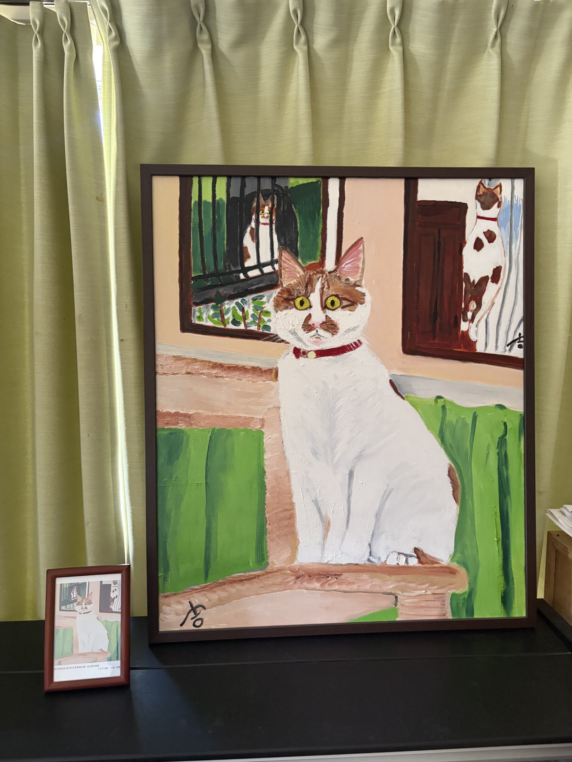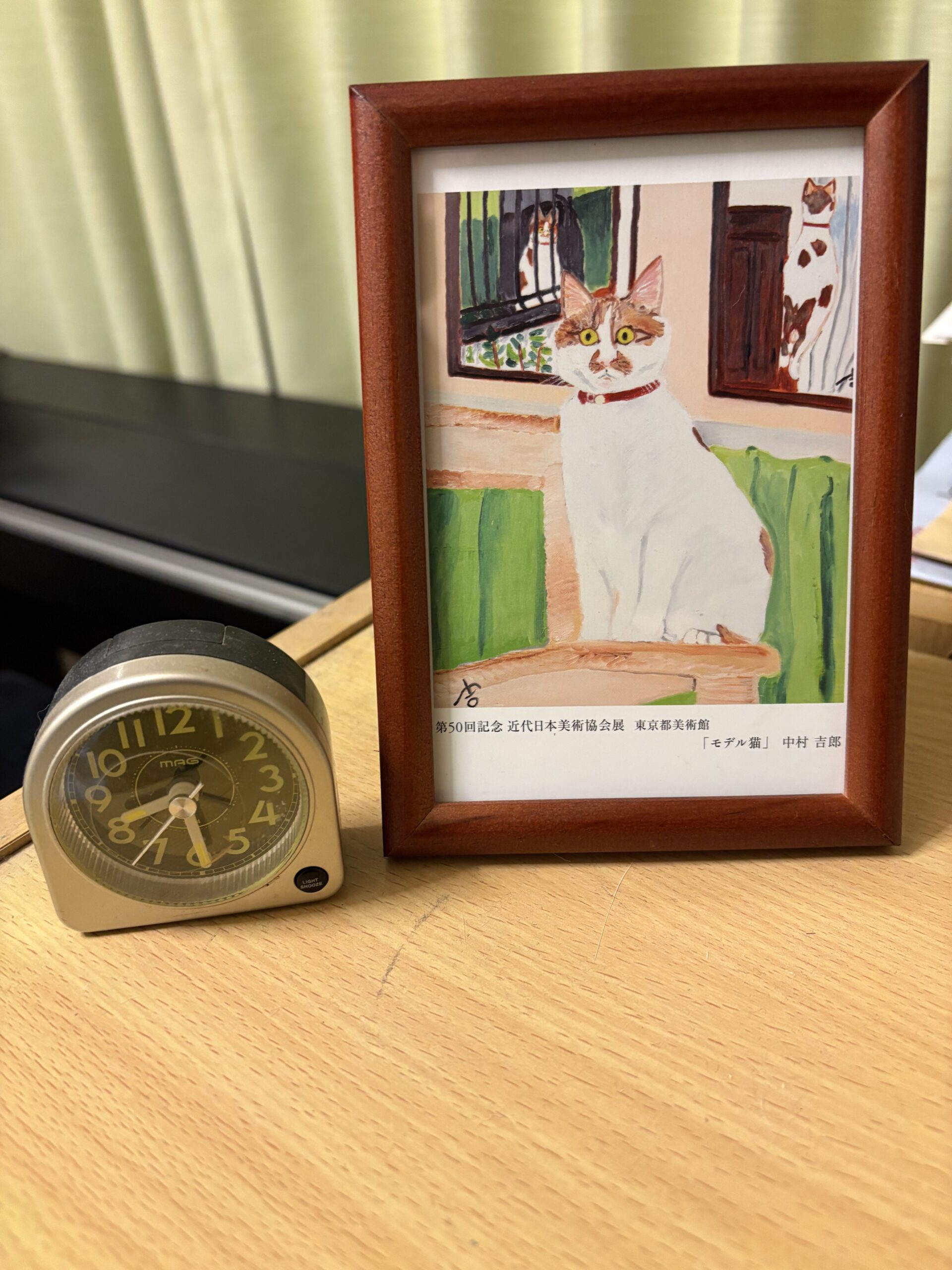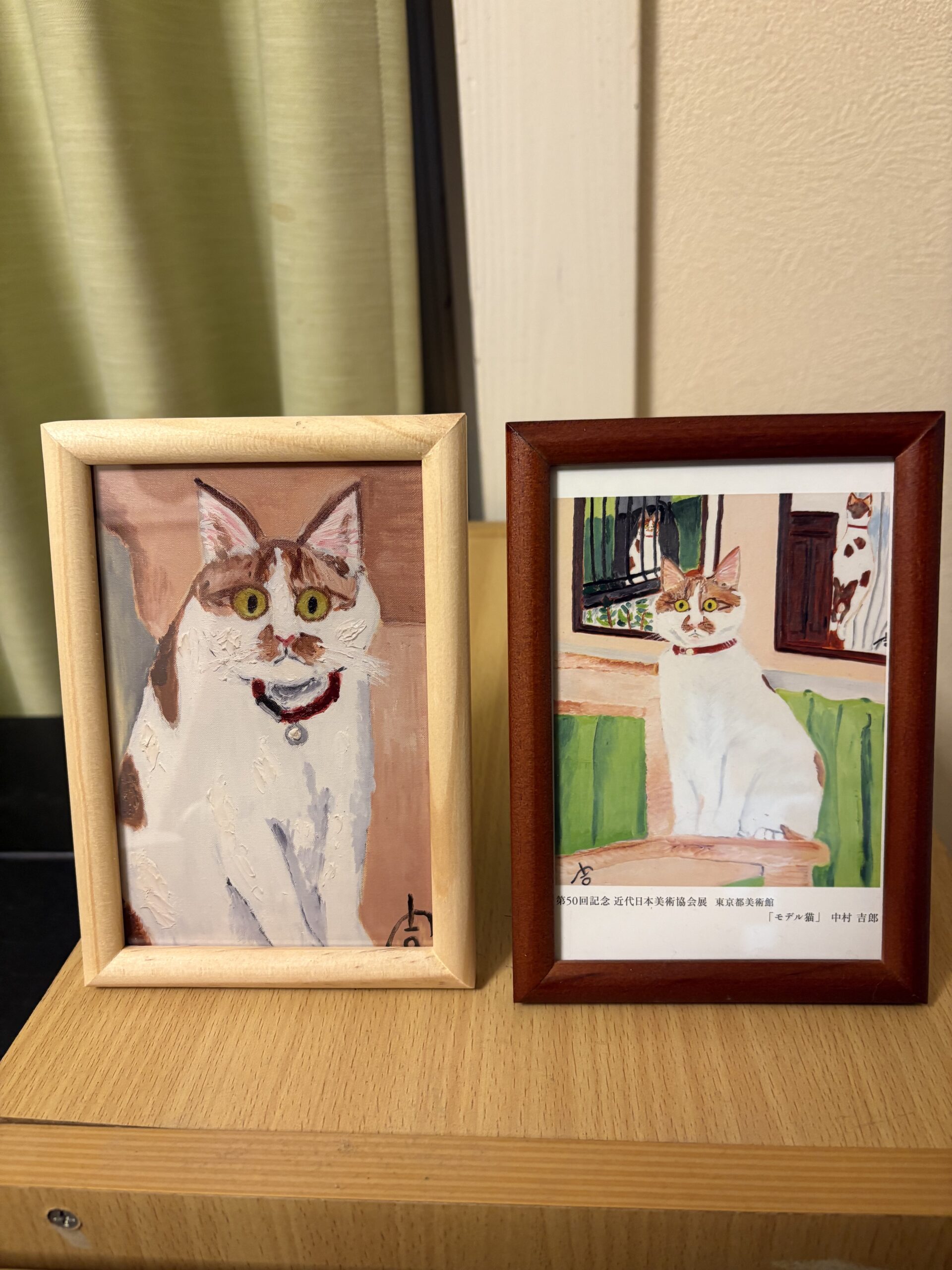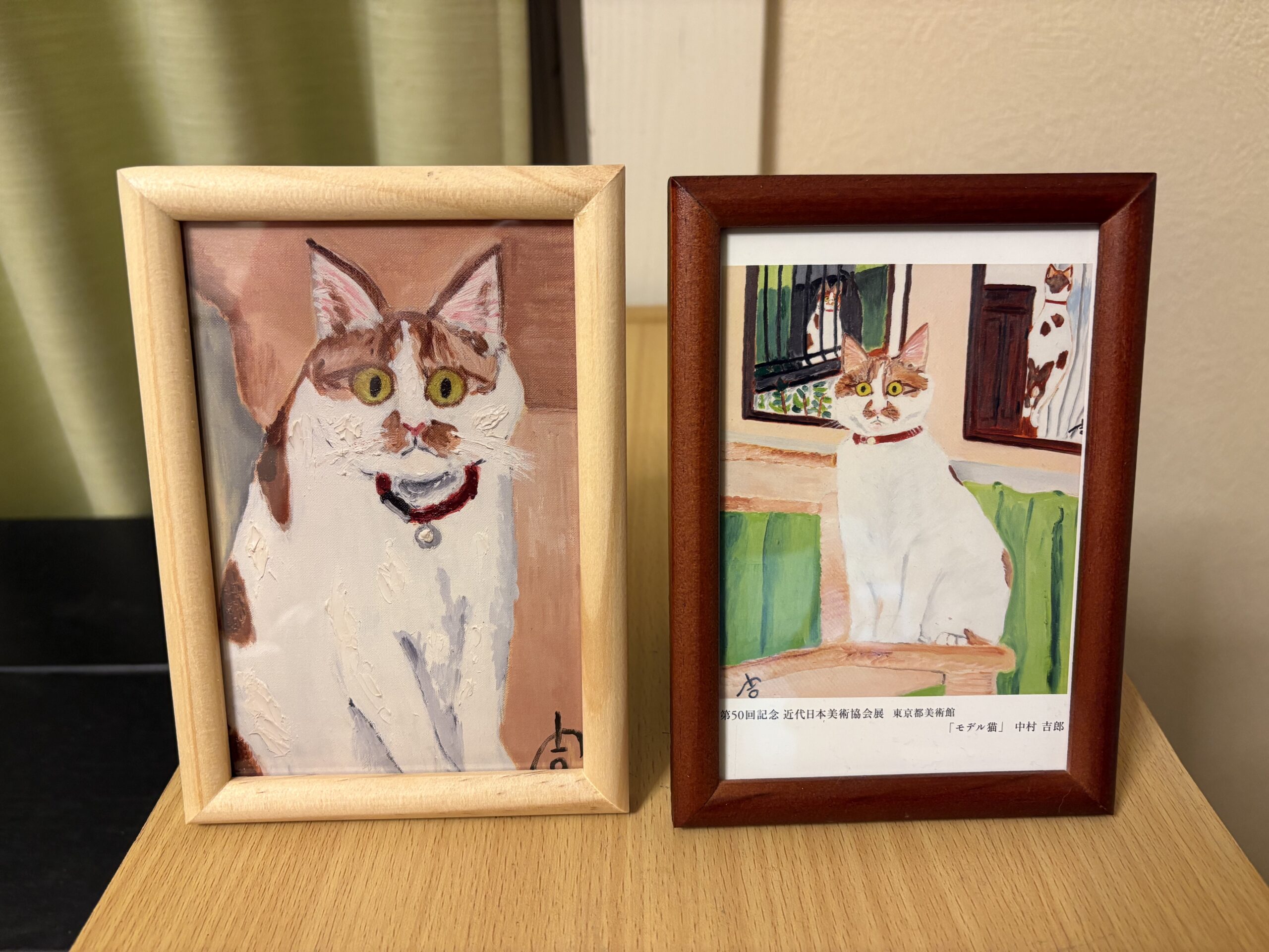 自作の油彩画「モデル猫」をポストカードにしました。 保健所から譲渡されたタマは、何枚もの絵のモデルとなっており、この絵でも、自分がモデルとなった2枚の絵の前でポーズを取っています。 第50回記念近代日本美術協会展出展時に作成したものなので、表面に展示会名、作者名、タイトルが印字されています。 親しい方に送るだけでなく、額に入れてミニアートとして部屋に飾っていただくことも出来ます。 購入された方にはサンキューシールをプレゼント。
