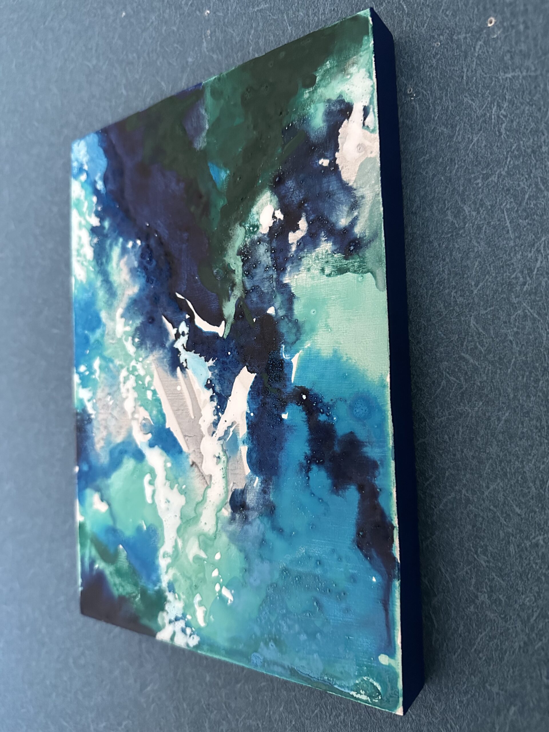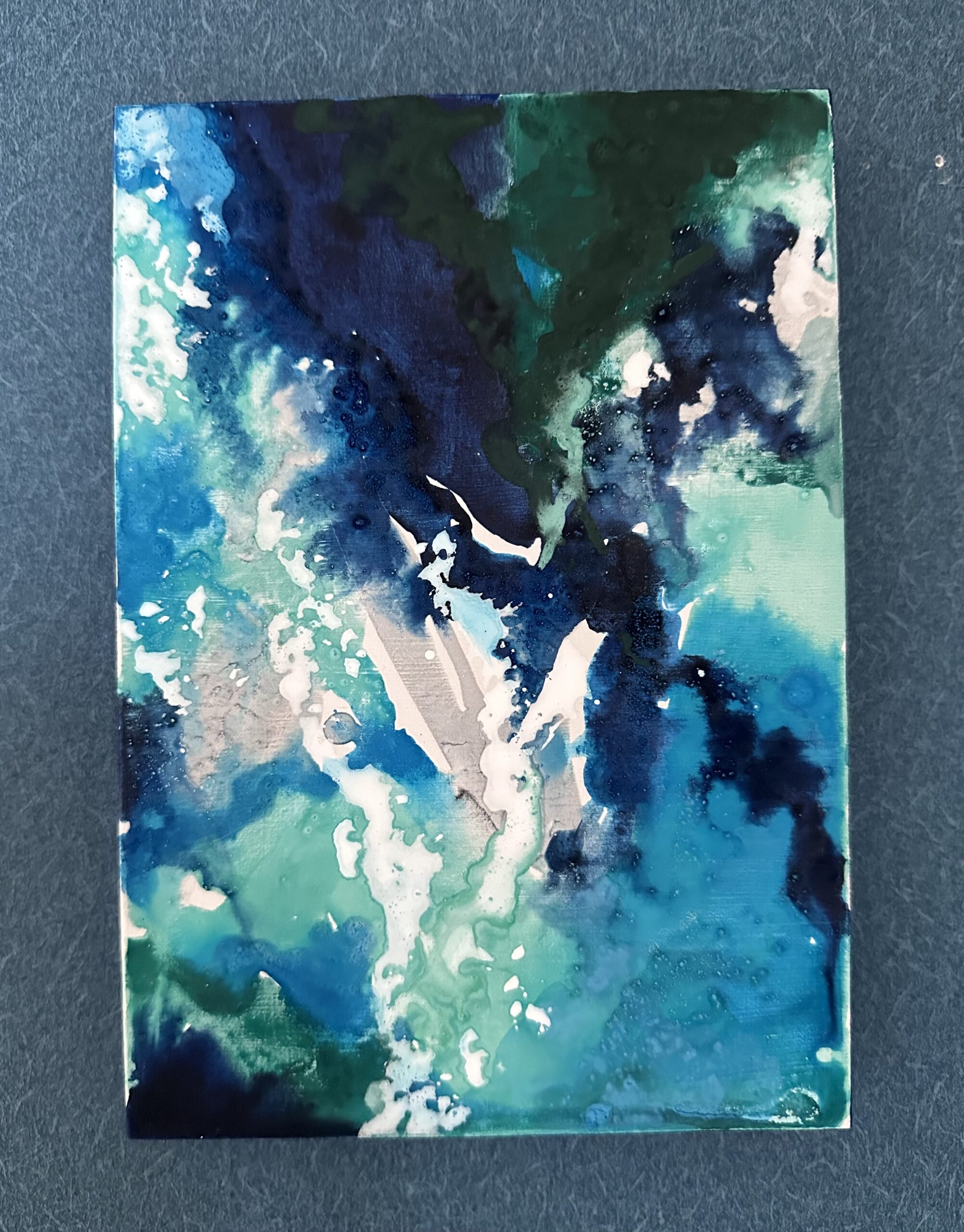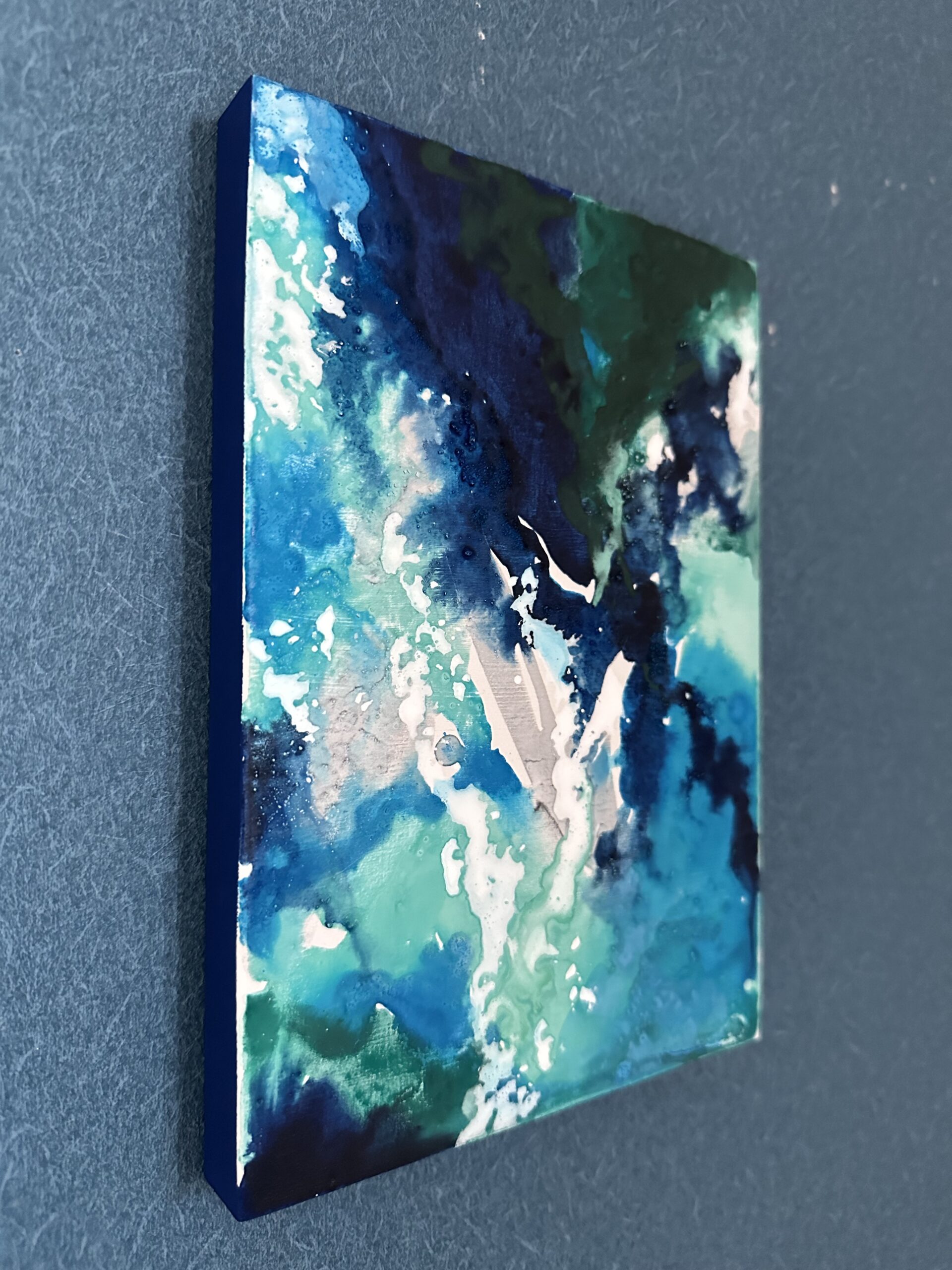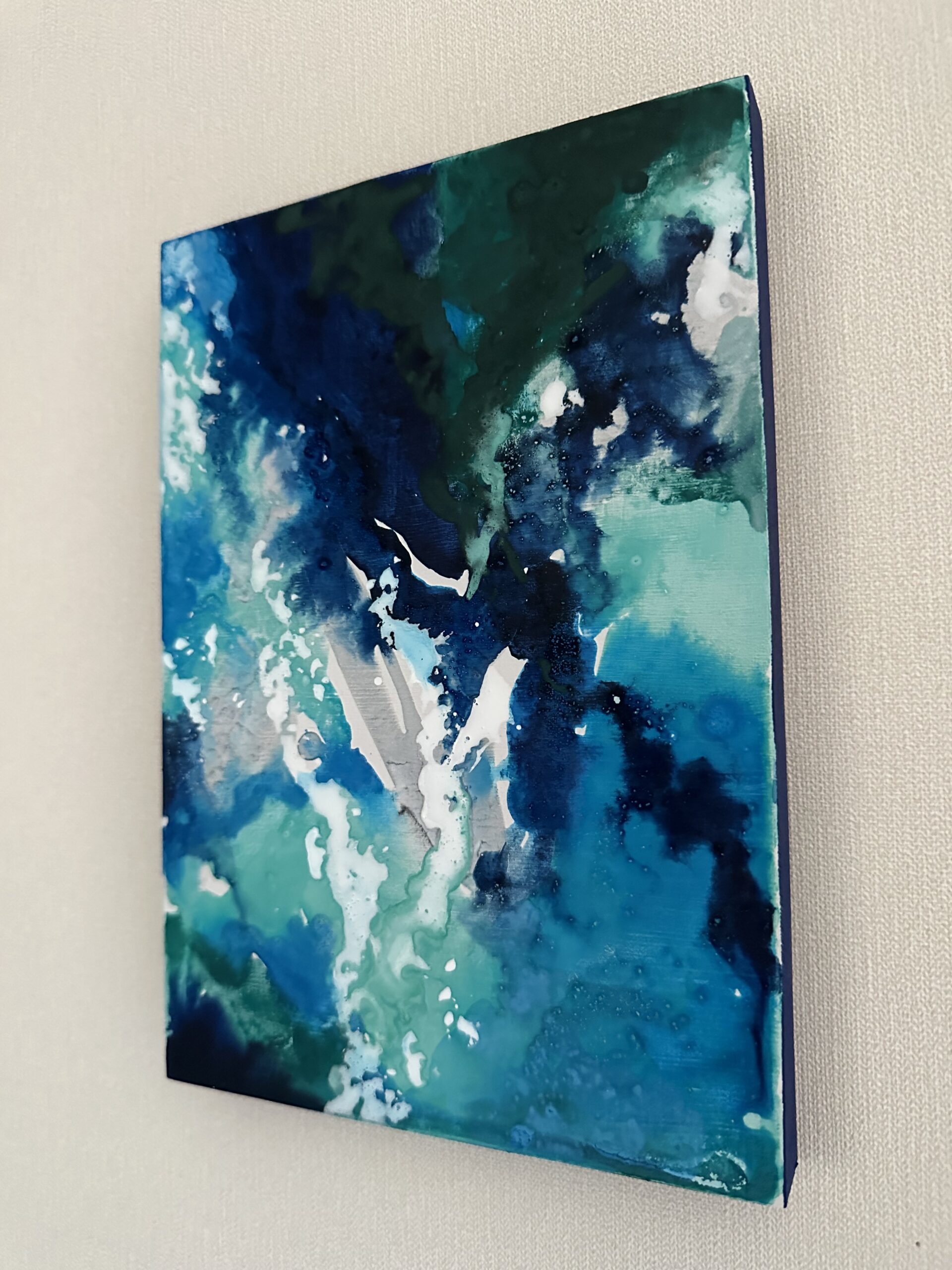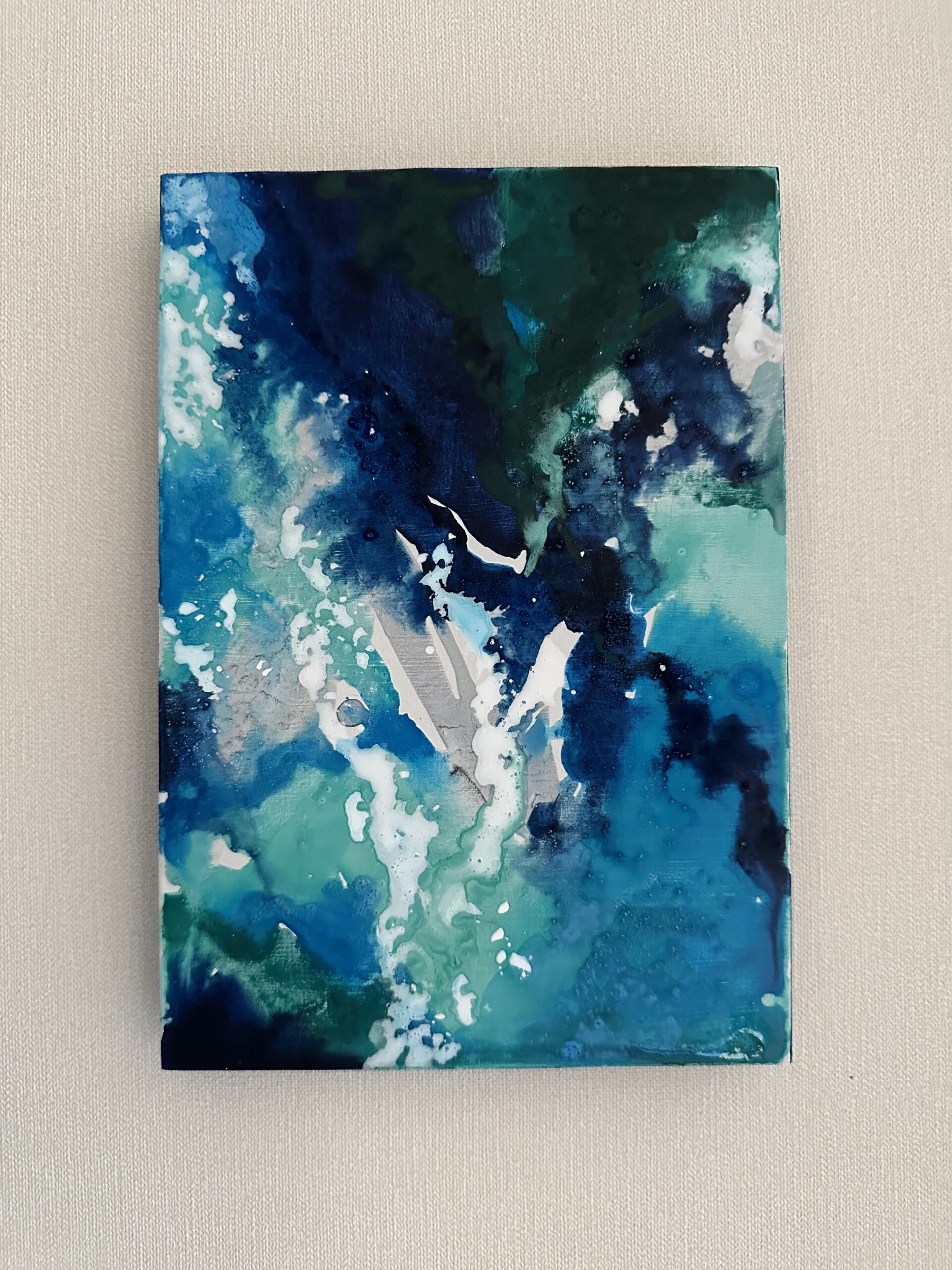 深い森の静けさを破るように、渓流の水流が勢いよく岩を乗り越え、しぶきをあげながら流れていく。陽の光が木々の隙間から差し込み、水面にキラキラとした光の粒が反射している…。四国の渓流を訪れたときの水面の響きを思い出しながら制作しました。