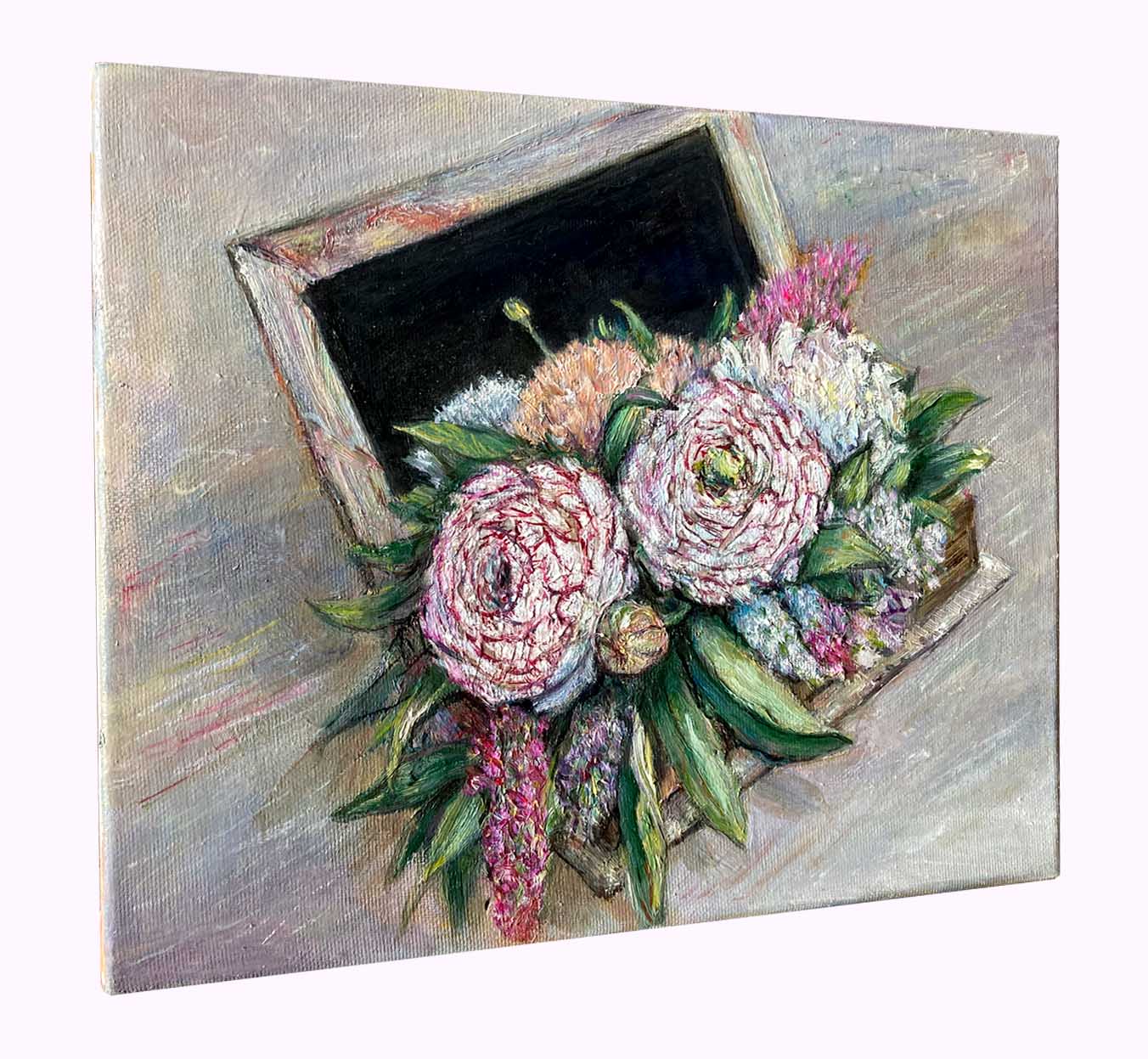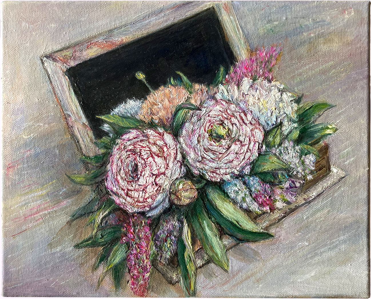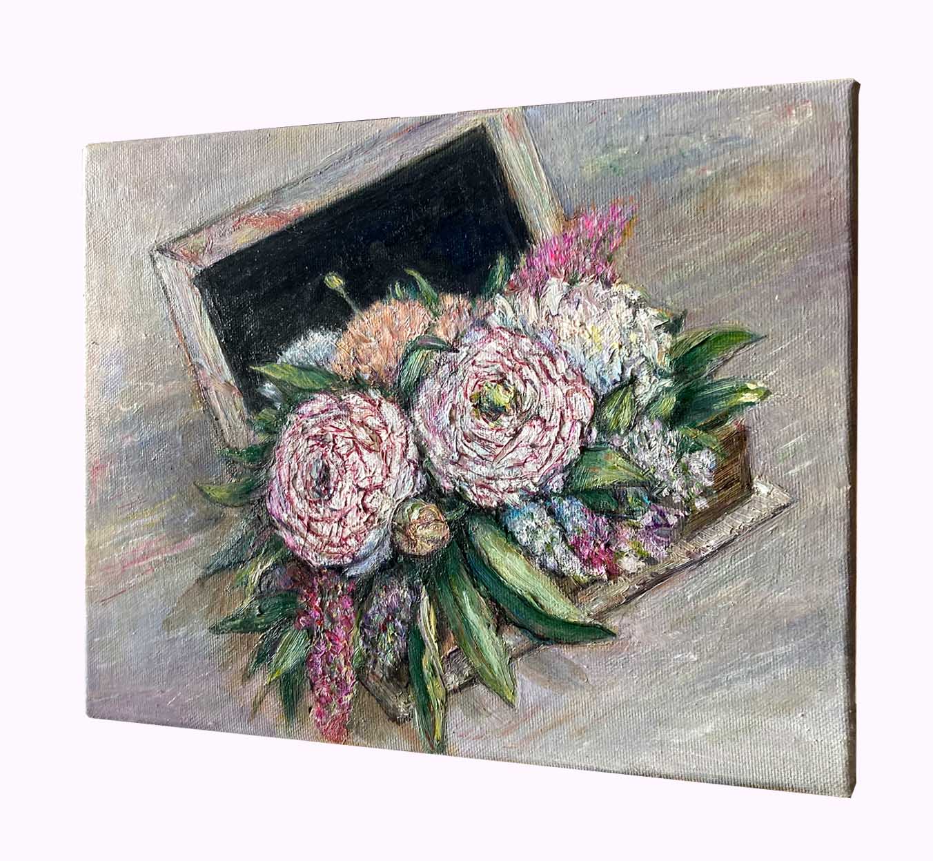 本をかたどったボックスに白い大きなラナンキュラスを中心にスターチスをアレンジした油彩画です。白く赤い縁のラナンキュラスが美しく、盛り上がる様を描写して、周囲に彩りのあるスターチス、美しく映える緑の葉が動きを出す演出をしています。斜め俯瞰の構図によってボリュームのある花々と周りの空間が表現出来ていると思います。写真だとマチエールが目立ちますが飾って見ると手に取れる様な立体感と平面感が混在した作品です。