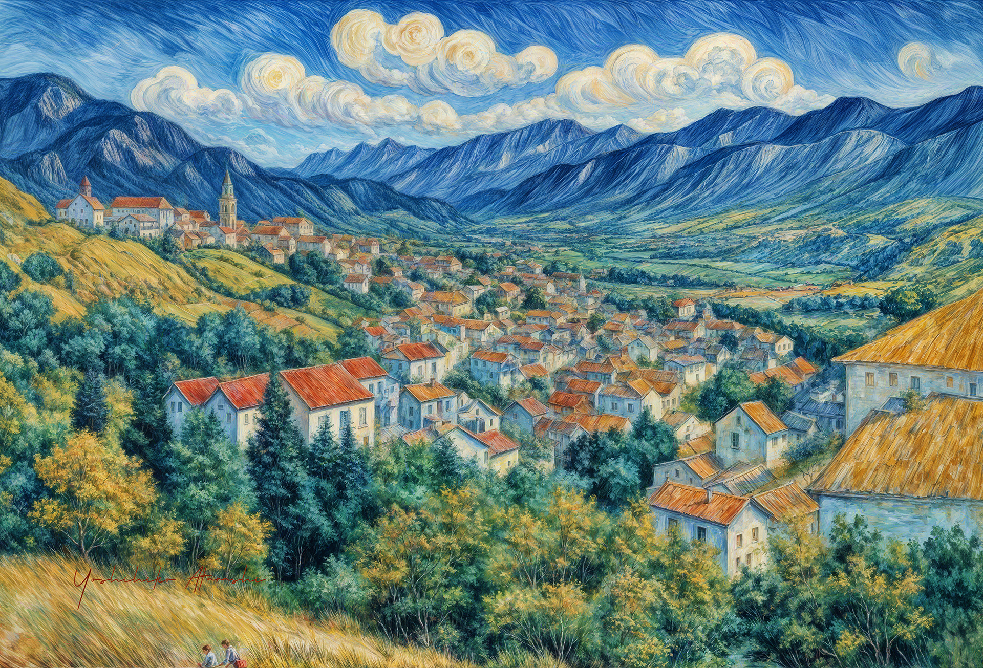 タイトル「風に還る山間の風景」に込めた想いは、自然と人の暮らしが静かに寄り添い、時と共に風のように巡る情景の記憶です。私はこの作品群を通じて、旅先で心を奪われたヨーロッパの山間の町の空気感や光の移ろいを描きました。柔らかな筆致と重ねた色彩で、懐かしさと静けさを表現しています。見る人の心にやさしく触れ、記憶の奥にある風景と呼応するような、そんな絵画でありたいと願っています。