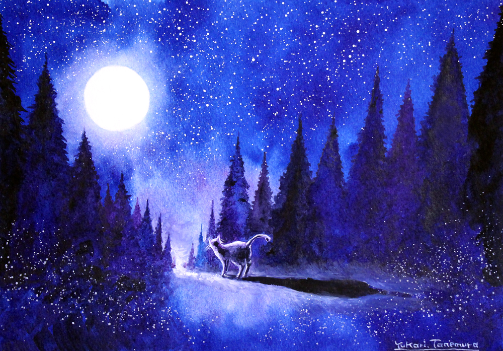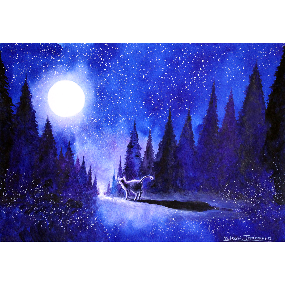 月光の幻想的な風景を、水彩と一部アクリル絵具で表現しました。