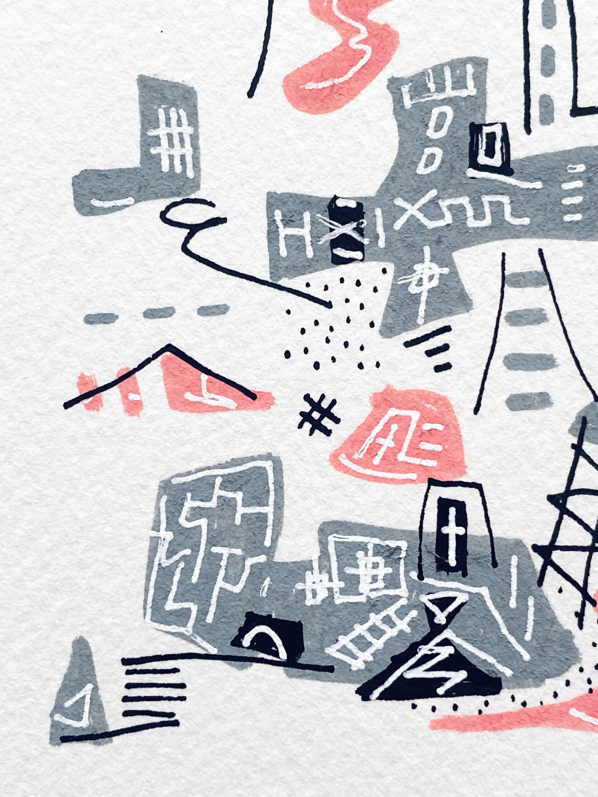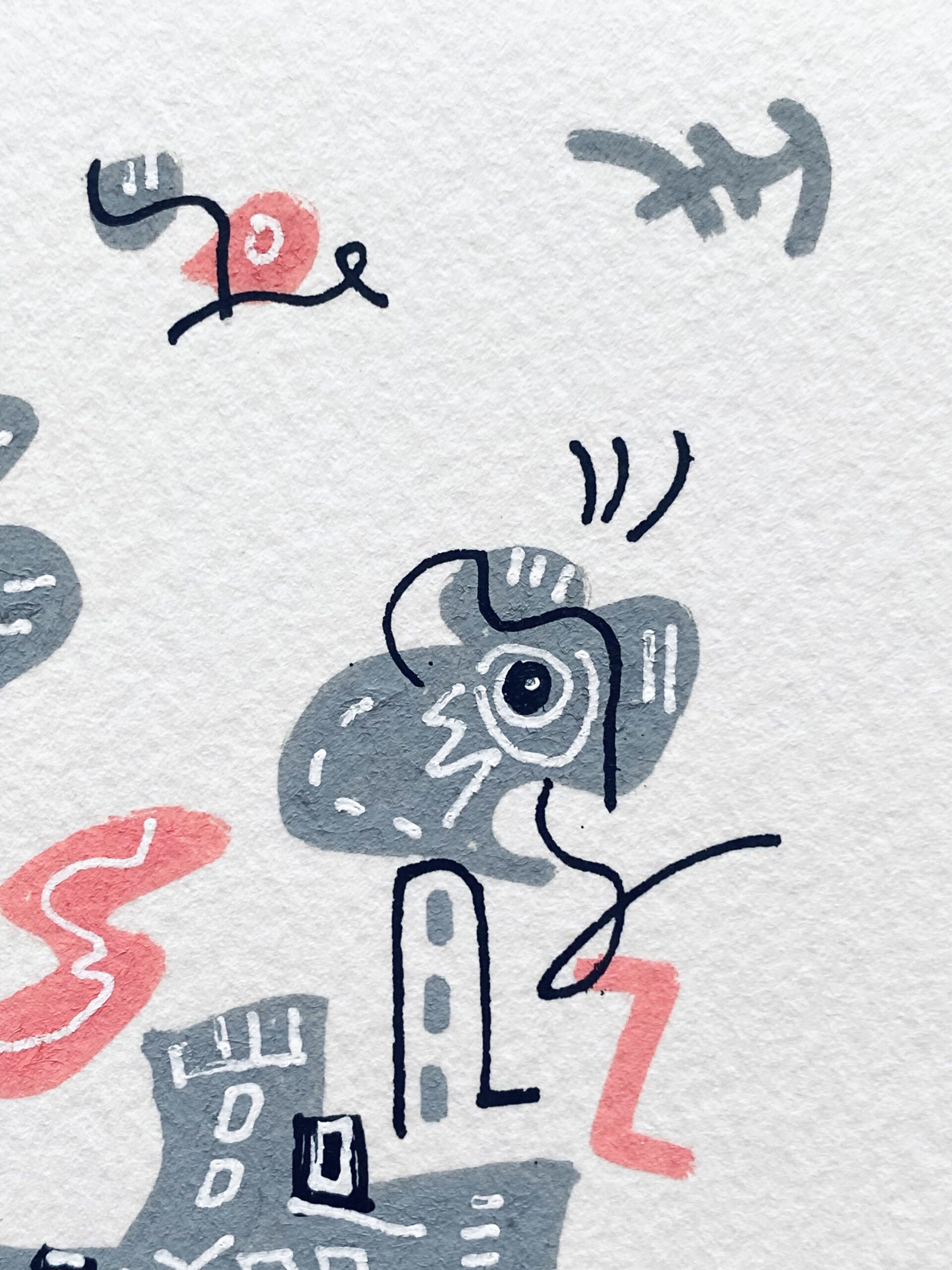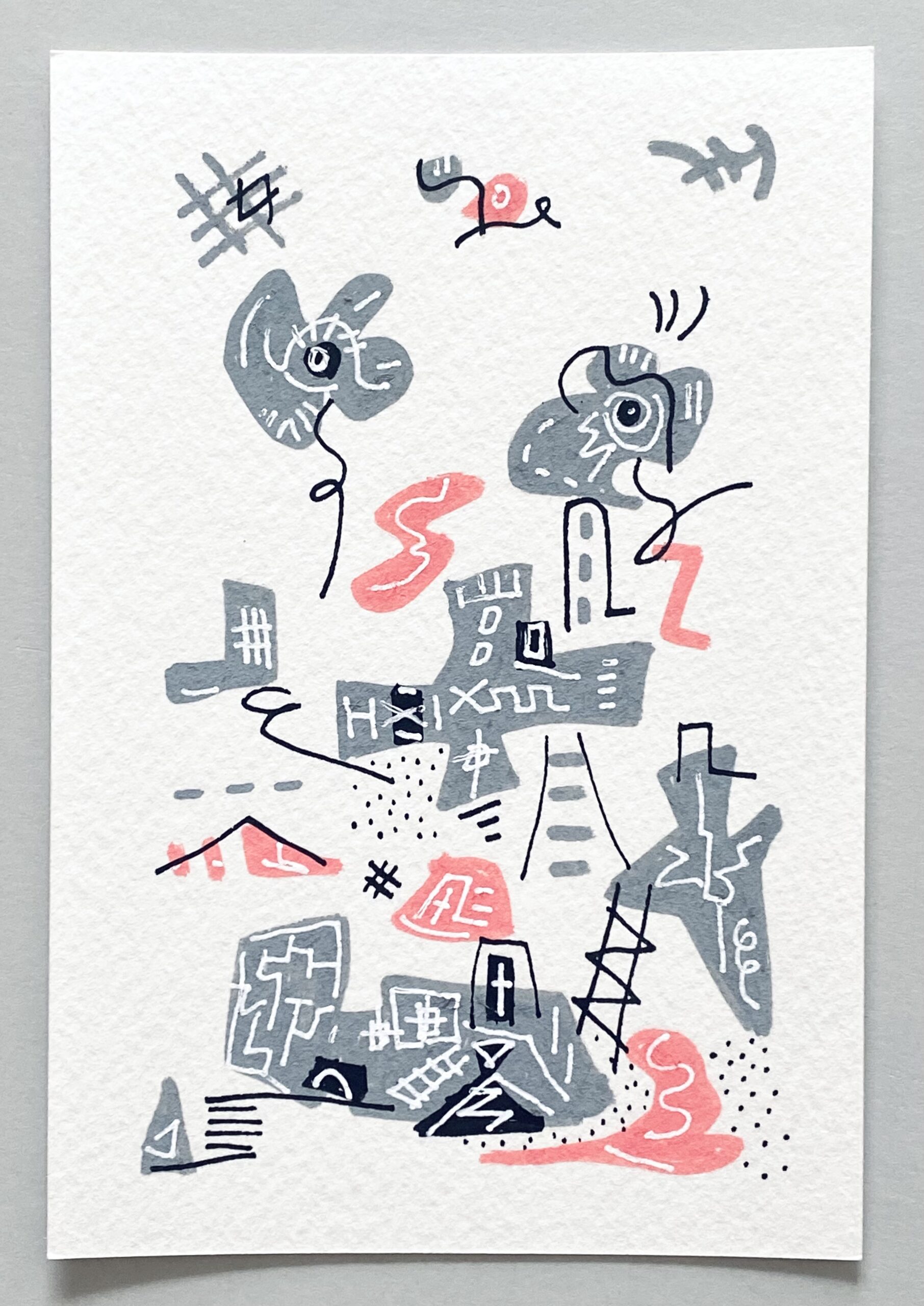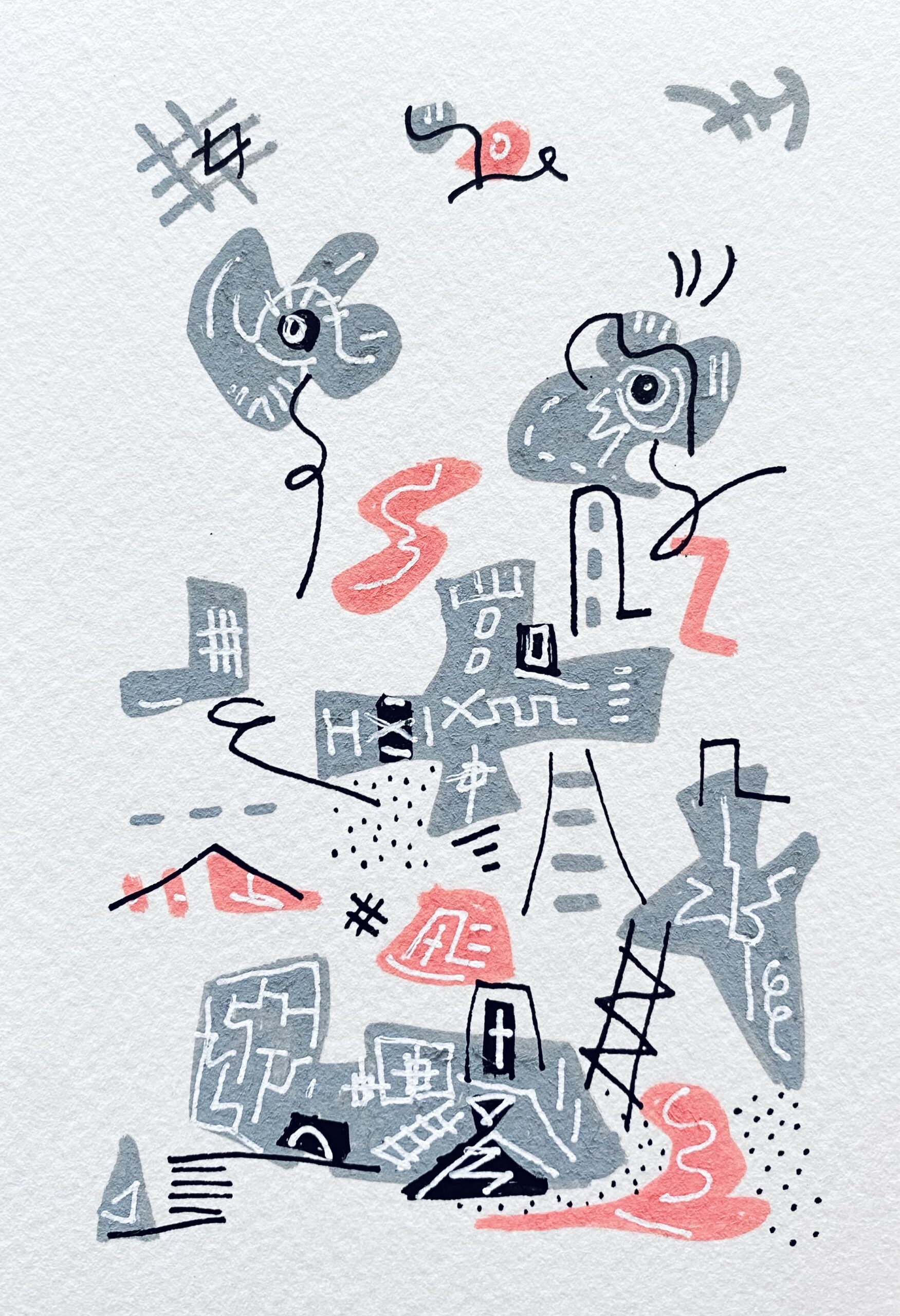 2008年 浮かんだイメージを付箋にボールペンでスケッチ。2012年になりそれをまとめたものを知人に見せたところサイズや画材をかえて絵画として発表することを勧められ、2013年、公募展にA4サイズのカードボードにペン・パステルで描いた作品を出品。その後アクリル絵具での創作をスタート。