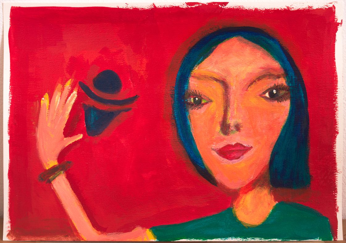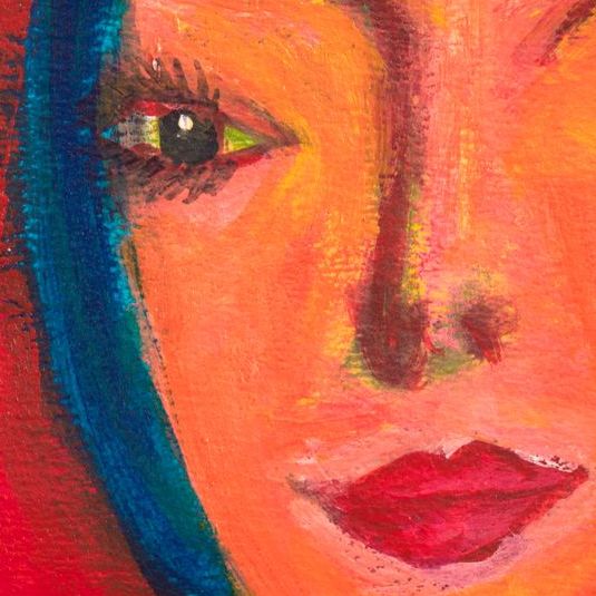 女性の顔をモチーフにアクリル絵の具で描きました。赤をバックに、濃い色合いで存在感のある雰囲気に仕上げました。