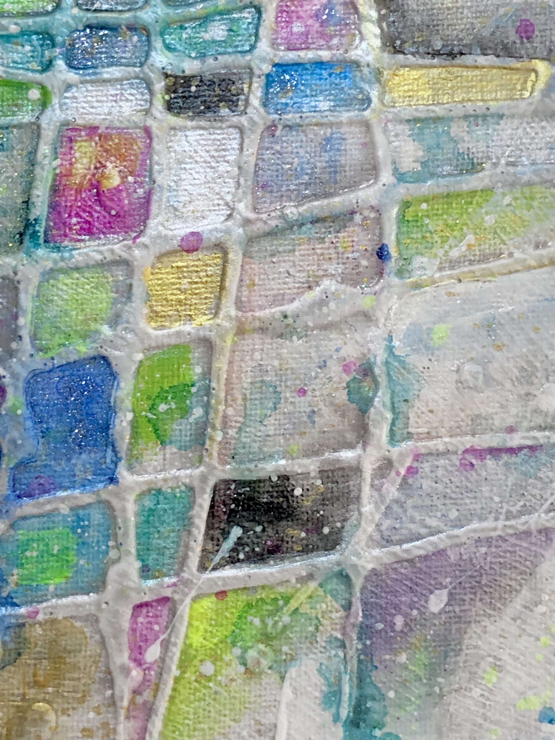 立体感のあるテクスチャーの下地に、ラメや金色も使いました。見る角度によってキラキラと輝きます。