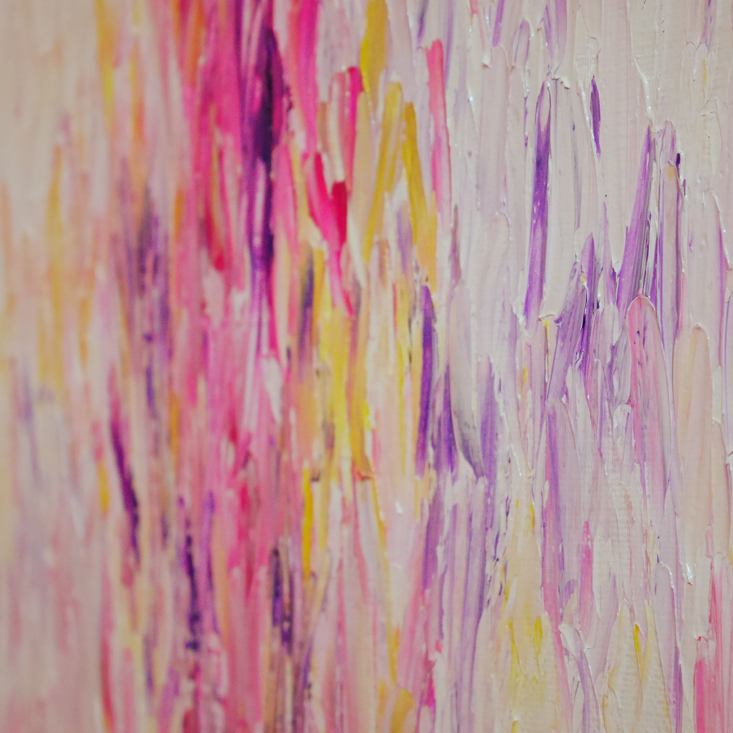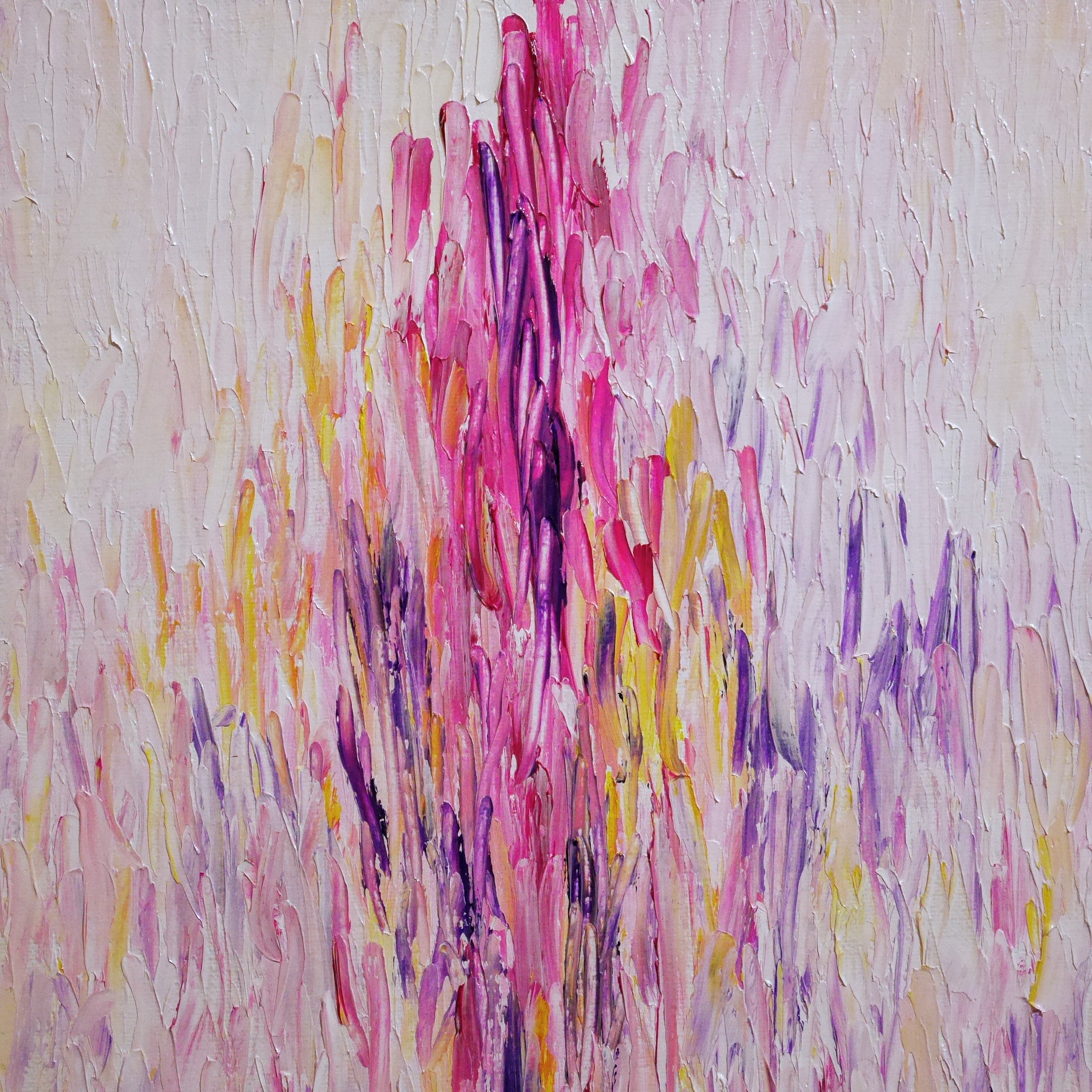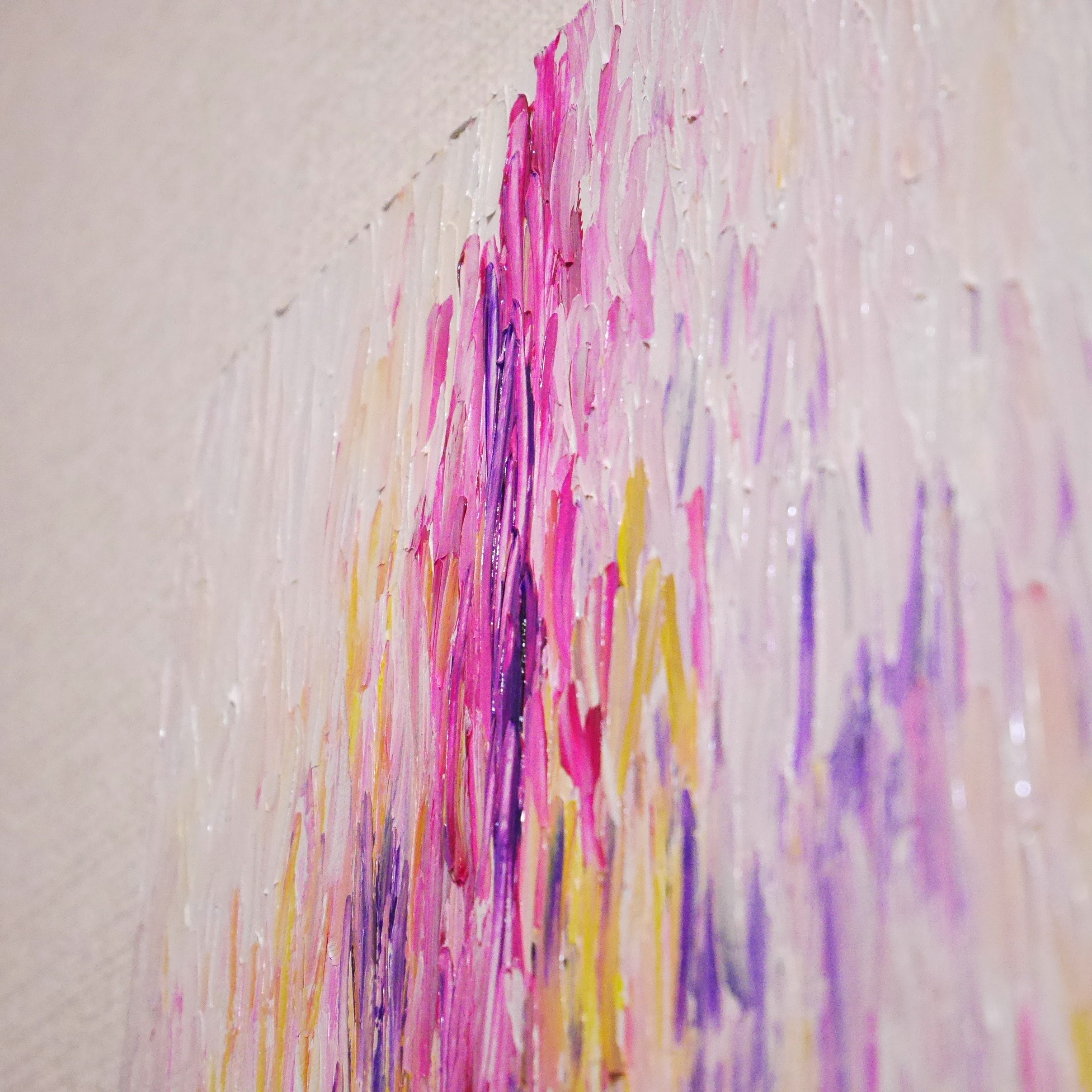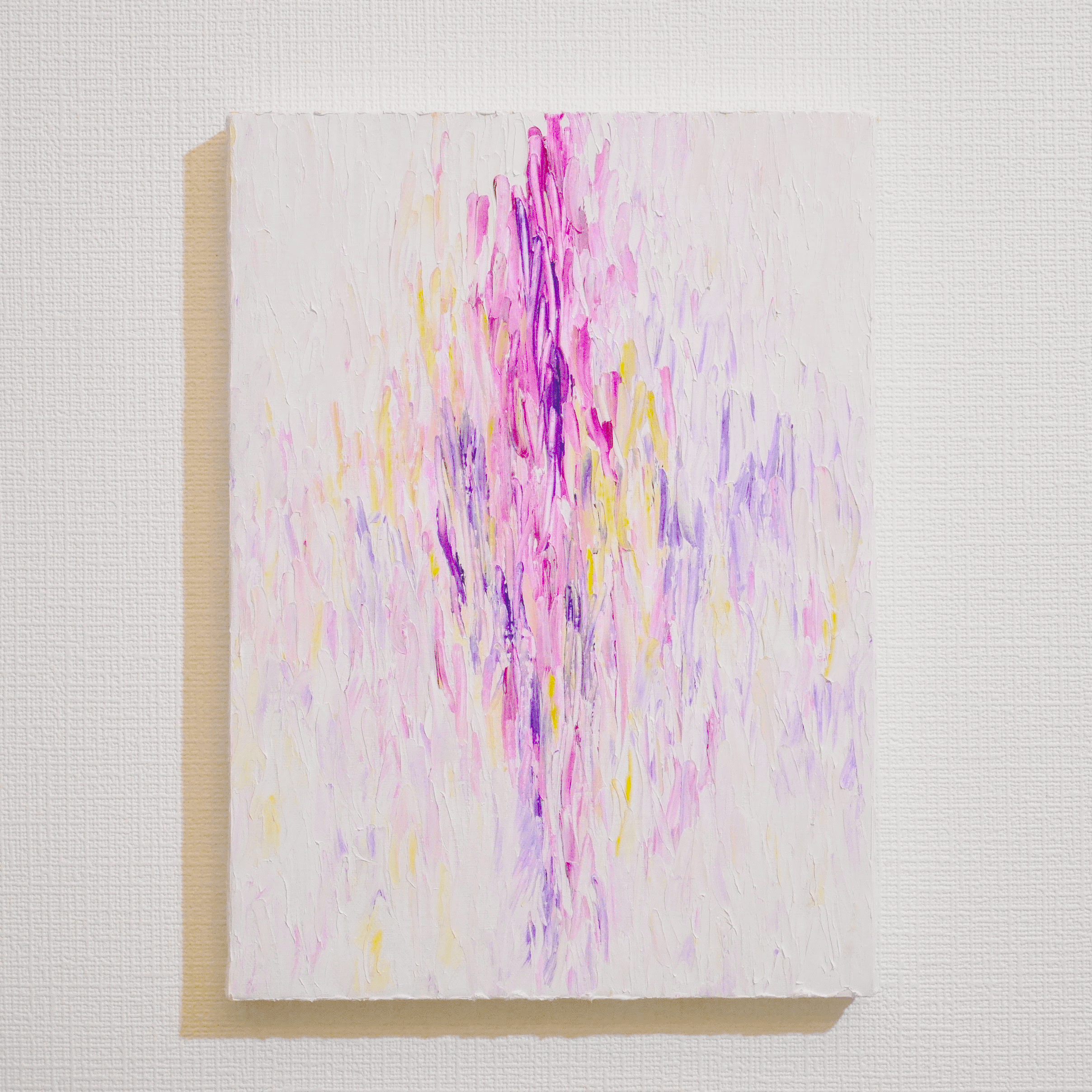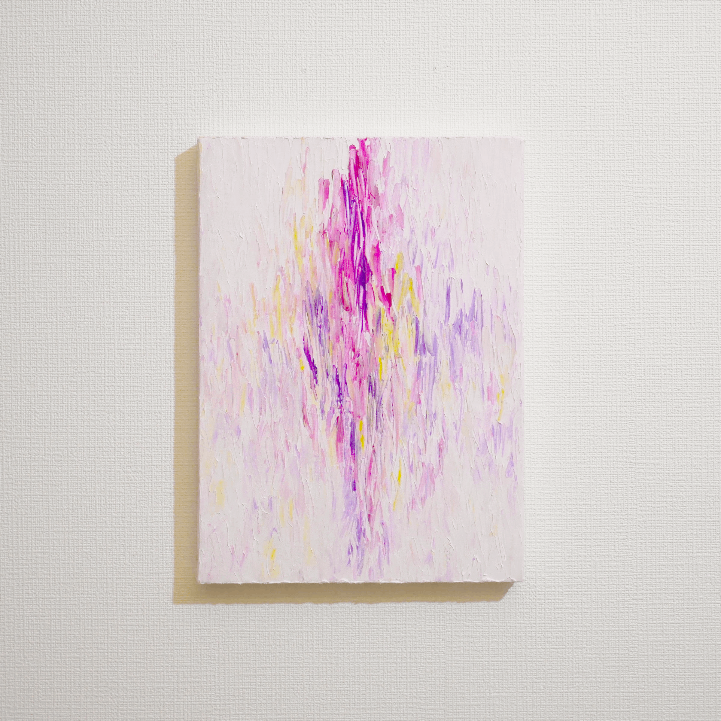 F4サイズのキャンバスに油彩 油彩ならではの肉厚なタッチで描かれた抽象作品です。 白色をベースに薄紅色、鮮桃色、スミレ色、黄色を織り交ぜて、色を重ねて制作しています。 ヘラで描いた後がよくわかります。