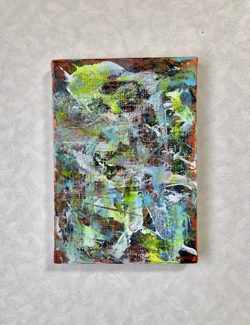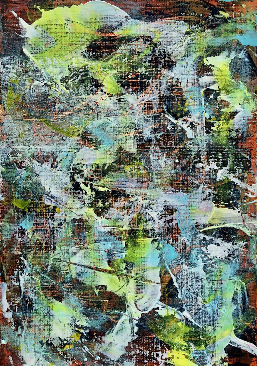 ペインティングナイフなどを使い、即興的に感覚をとらえて描いています。