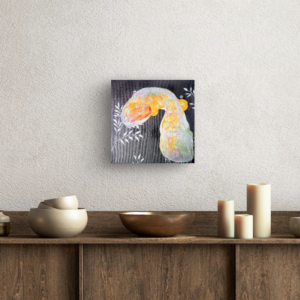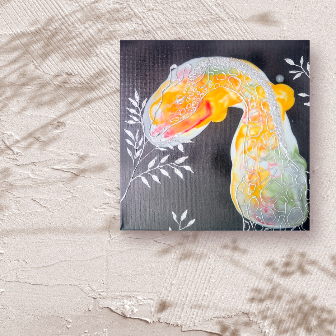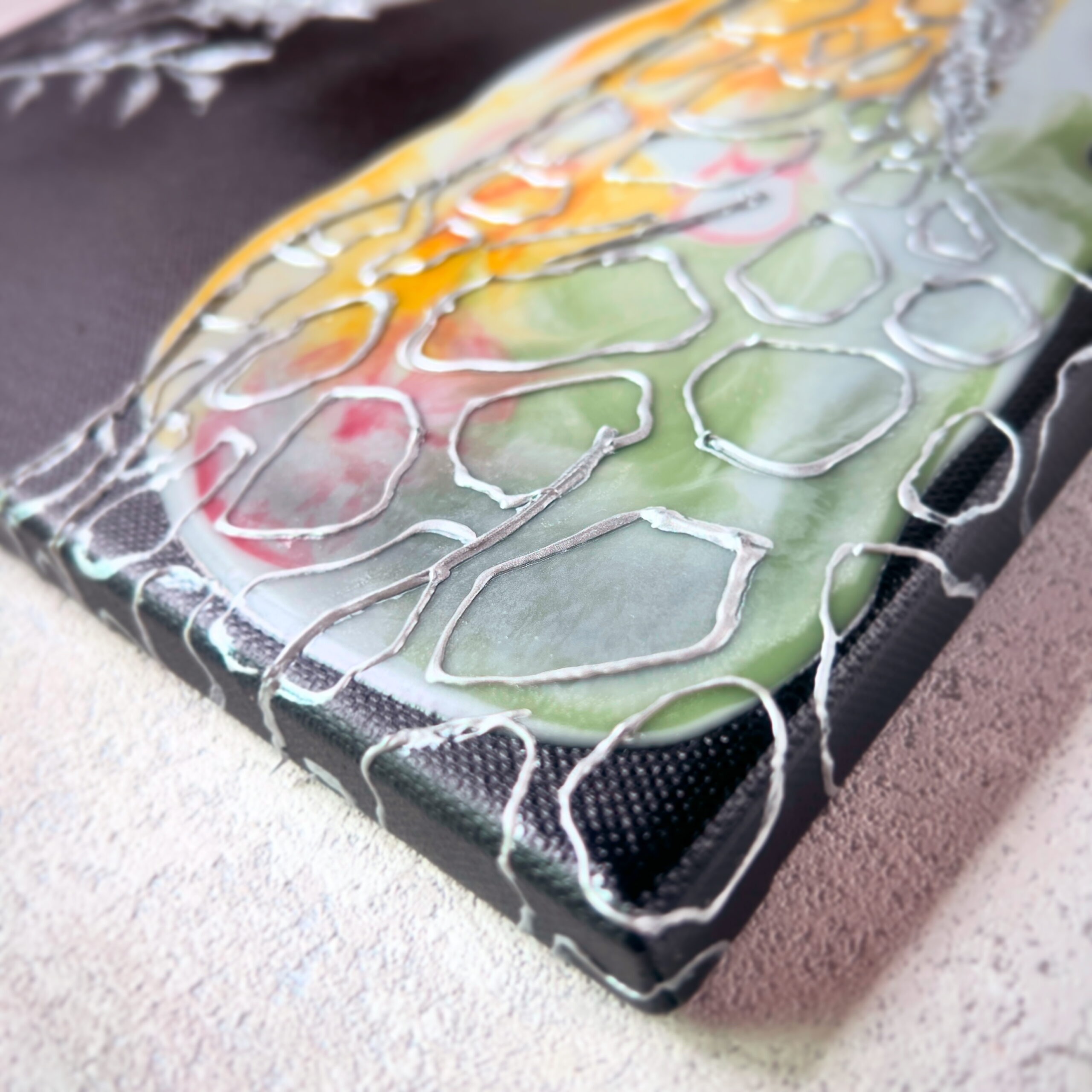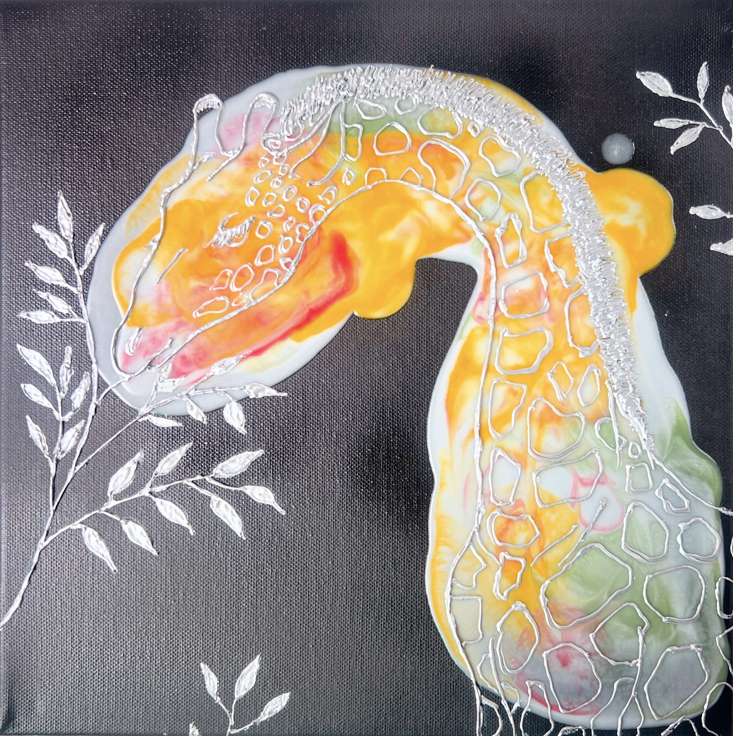 キャンドルの蝋とアクリル絵の具が生み出す、自然の神秘を閉じ込めた特別なワックスアート作品です。 この作品では、キリンが自然の中で軽やかに草を食む瞬間を捉えています。 特に、優美に湾曲した首のラインやフサフサのまつ毛が、見る者の心を惹きつけ、穏やかなサバンナの一瞬を体感させてくれるでしょう。 自然の造形美や躍動感を感じられるこの作品は、特に動物や自然を愛する方にぴったりです。 心温まるインテリアとして、リビングルームや寝室のアクセントに最適で、訪れる人々に温もりと優しさを届けます。 また、仕事の合間に一息つけるオフィスや書斎にもおすすめです。 静かに佇むキリンが、日々の喧騒から解放し、心を落ち着かせてくれる癒しの存在となるでしょう。 このアートは、キャンドル制作やアルコールインクアートの過程で生まれる予期しない色模様の美しさと、野生の息吹が感じられる情景とを融合させたものです。 特に私にとってキリンは、昔タンザニアのサバンナでキャンプをしていた頃にその優雅な姿に心打たれた、思い出深い動物でした。 あの頃の感動を呼び起こしながら描いた、特別な一枚。 ぜひ、この唯一無二のアートを通して、心に優しい色と豊かな自然との対話を始めてみてください。