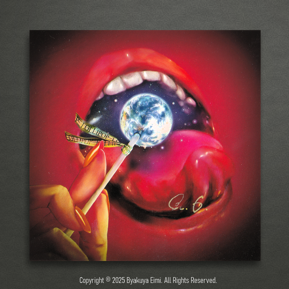 作品詳細▷ タイトル:『LOLLIPOP』 | 素材:顔料インク、色鉛筆、アクリル絵具、グロスバーニッシュ | 支持体:マット紙 | 制作年:2025年 | 作品証明書:有 | 額装:無