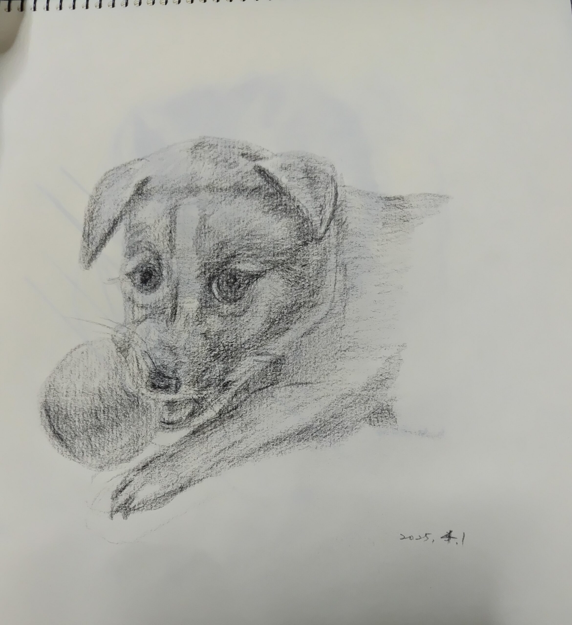 クリームコットン紙に、柔らかな風合いで、ボールをかじるワンちゃんを細やかな筆致で描きました。こちらを見つめる目が可愛く、楽しんで描きました。觀てくださる方も、ほっこりした気分になっていただければ嬉しいです。