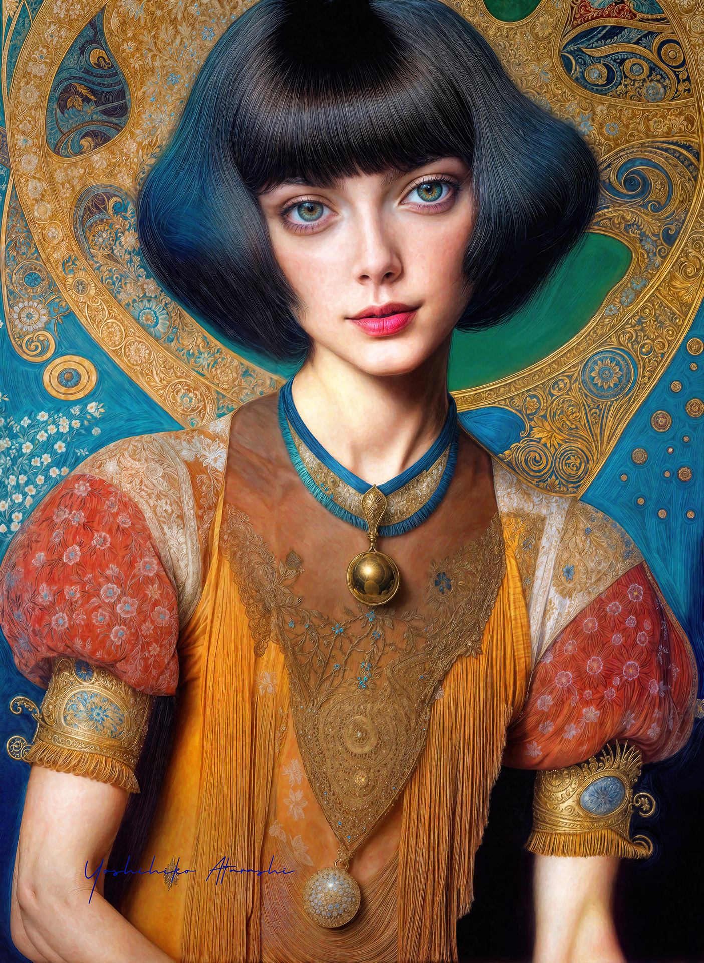 本作「The Gaze Remains」シリーズは、時代を超越する静謐な美を湛えています。金や深い青・赤・黄を基調とした服装と背景に、繊細な筆致で描かれた女性たちは、見る者に静かな余韻を残します。展示は暗めの壁に暖色系のスポットライトを当て、絵肌の光沢と色彩を引き立てる演出を施すと良いでしょう。リビングや書斎にも映える逸品です。