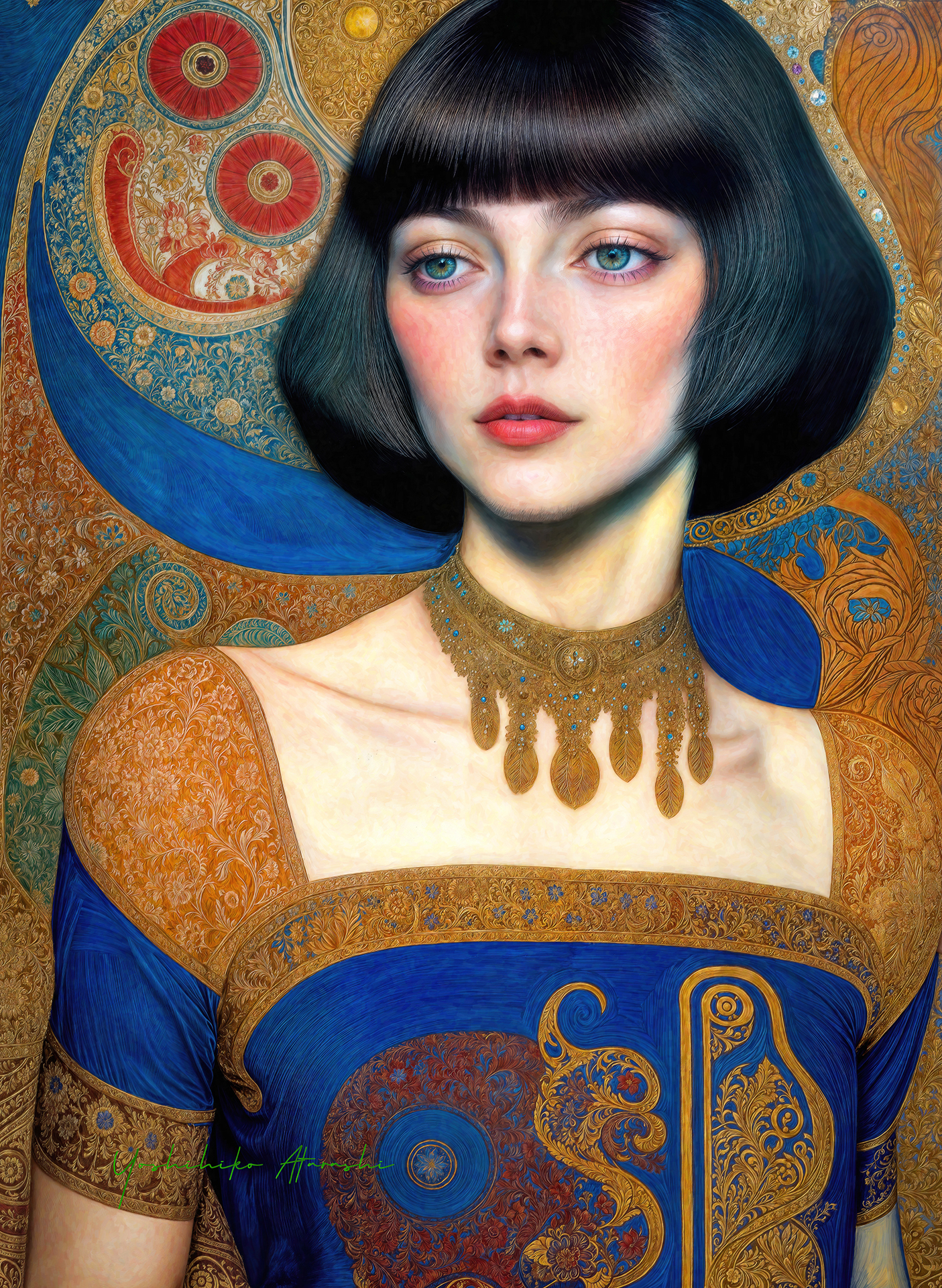 これらの作品は、永遠に残る感情の余韻を、女性のまなざしに託しました。象徴的な背景と、金箔を思わせる色彩、柔らかな筆致を用い、静かでありながらも強い内面性を表現しています。古典と現代が交錯する女性像を通じて、人間の普遍的な感情と美への探求を讃えました。