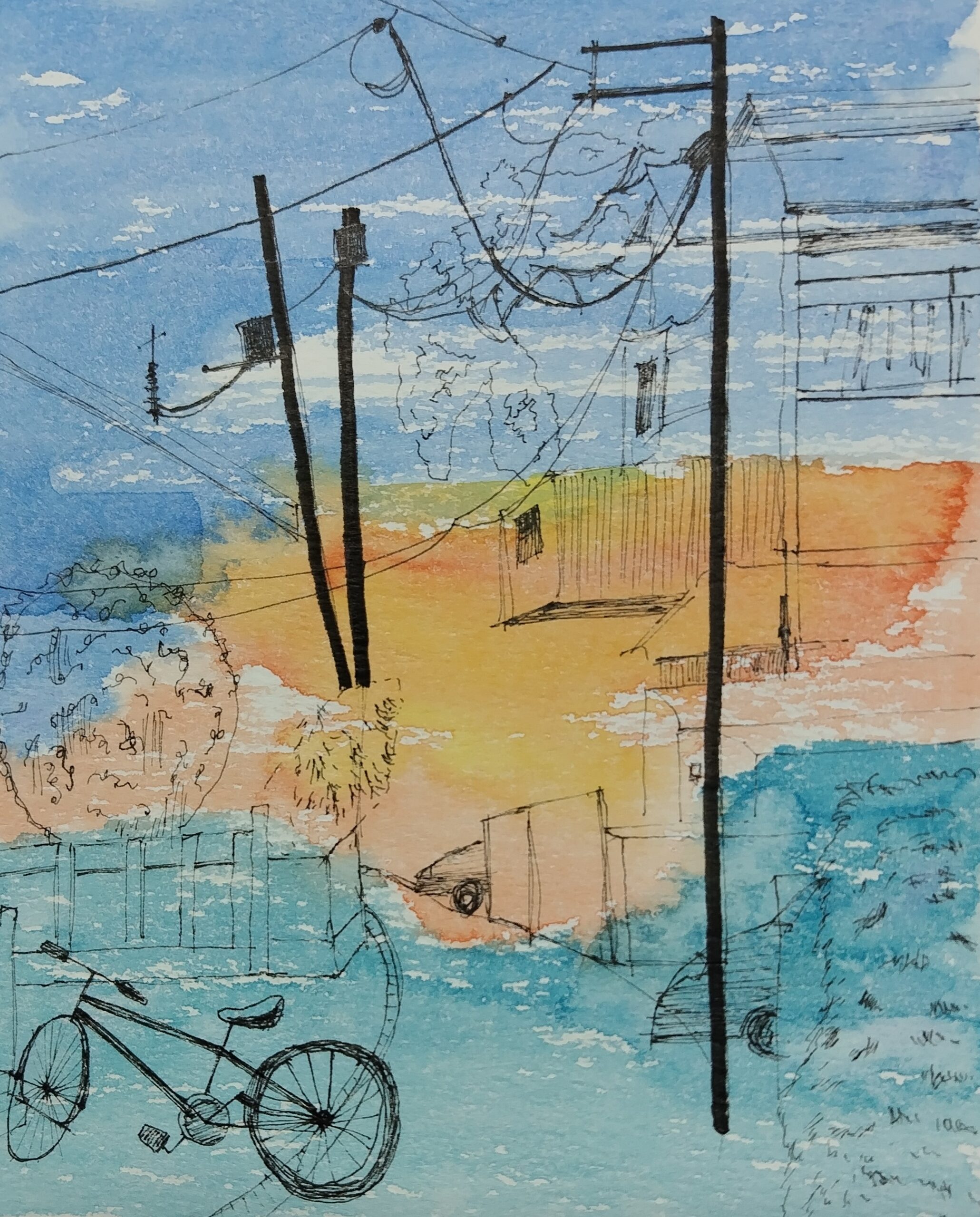 近所の夕焼けの街角を描きました。カラフルであり、黒色の緻密な描写も楽しめます。電柱を描くのが好きで、画面のアクセントになっています。道がうねって曲がり込んでいく構図にもこだわりました。さりげない情景を描きたくなり、ペンをとりました。
