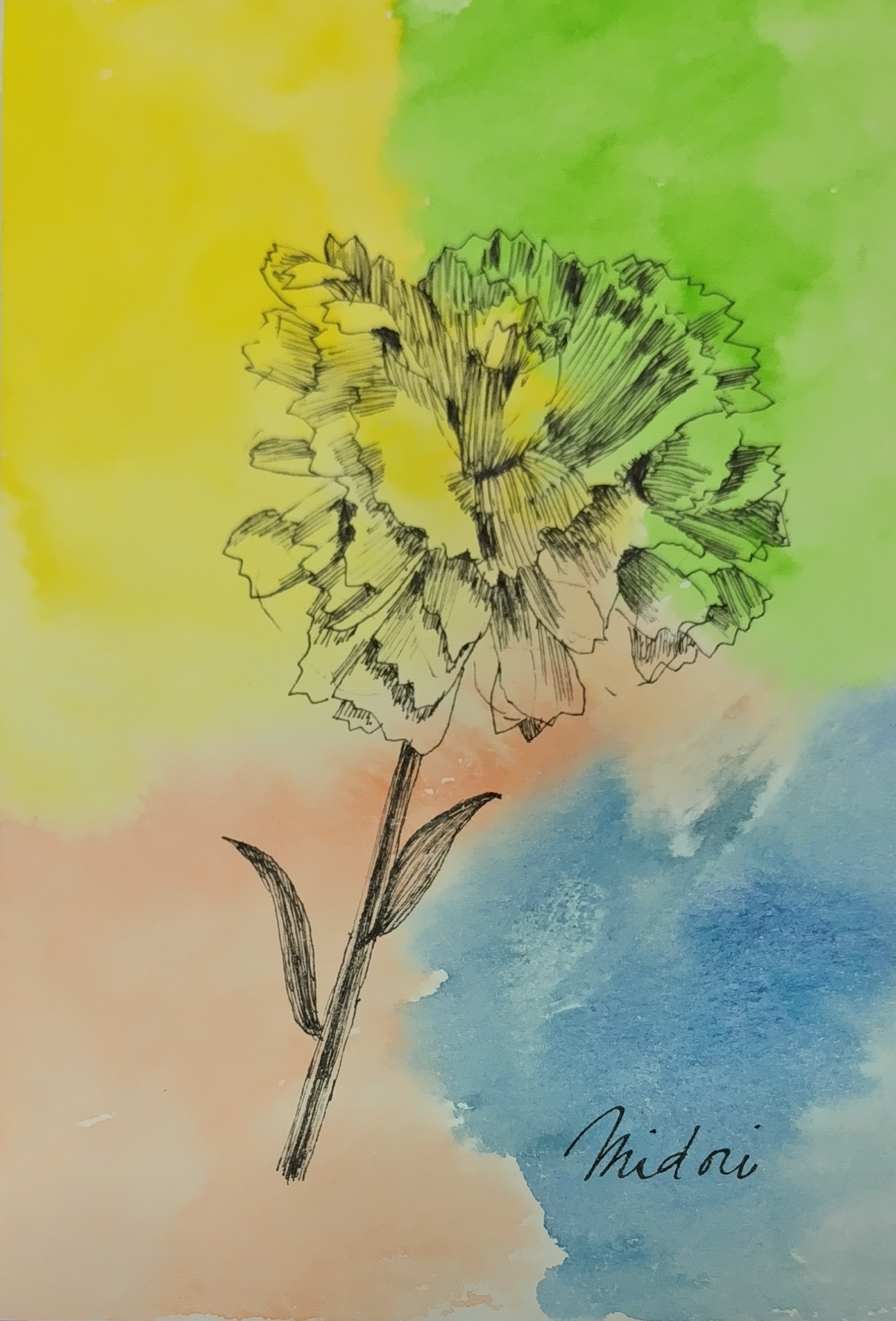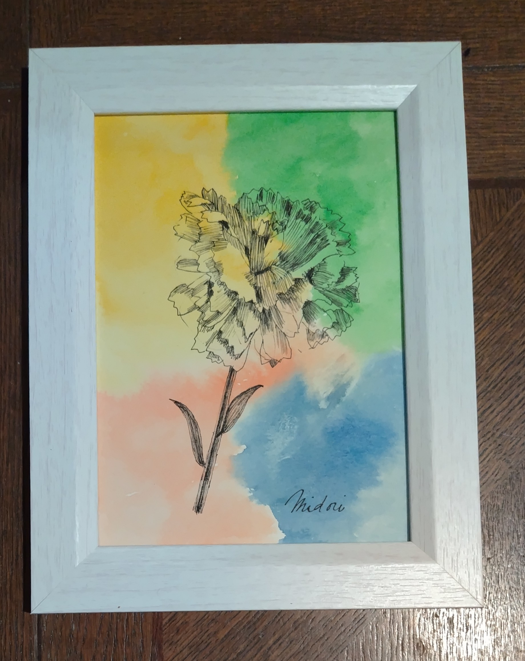 母の日にカーネーションを買いました。母を想うたびに母が私のためにしてくれたことを思い出し、深い感謝の念を抱きます。技法的には、カラフルな水彩の上にドローイングペンで描き込みました。色味の中に黒が映え、黒色の美しさをお伝えしたかった次第です。スタンド式にもなり、壁に掛けられる額縁をお付けしました。