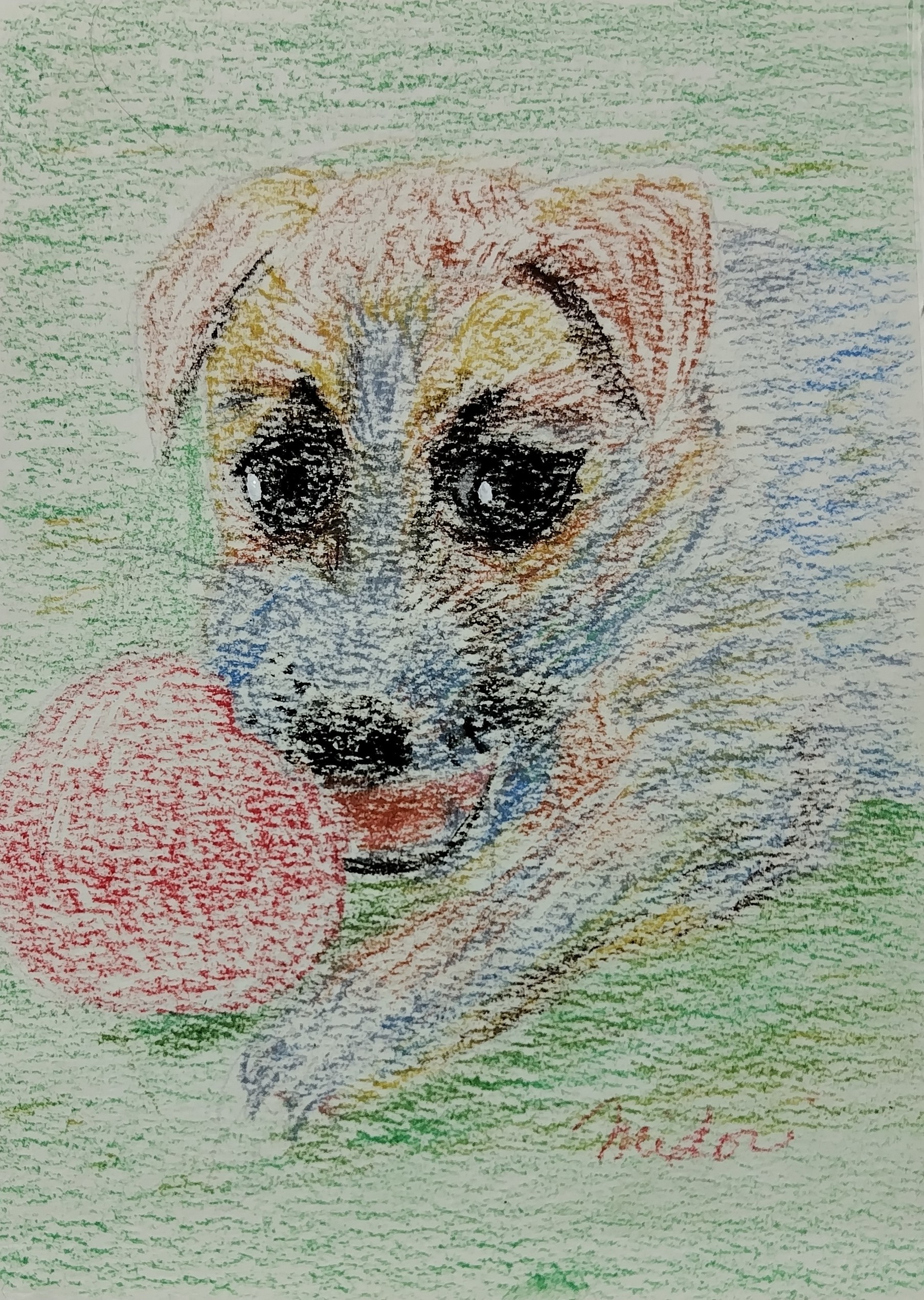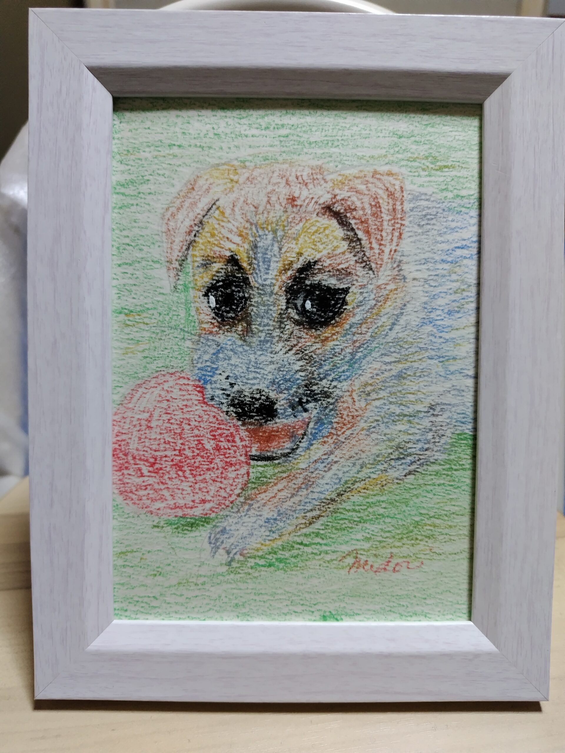 動物を描くことが好きです。ペット屋さんで元気な仔犬がポールと戯れているところを写真に写させてもらい、愛嬌あるワンちゃんを絵にしたいと思い、描きました。愛くるしいワンちゃんになっていれば嬉しいです。スタンド式にもなり、壁にも掛けられる額縁をお付けしました。