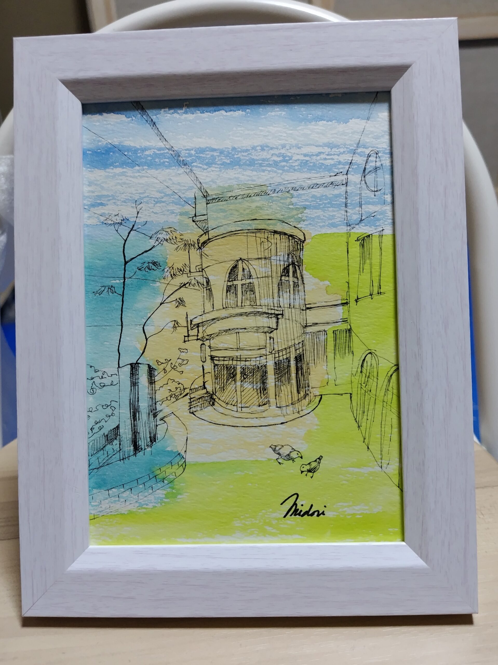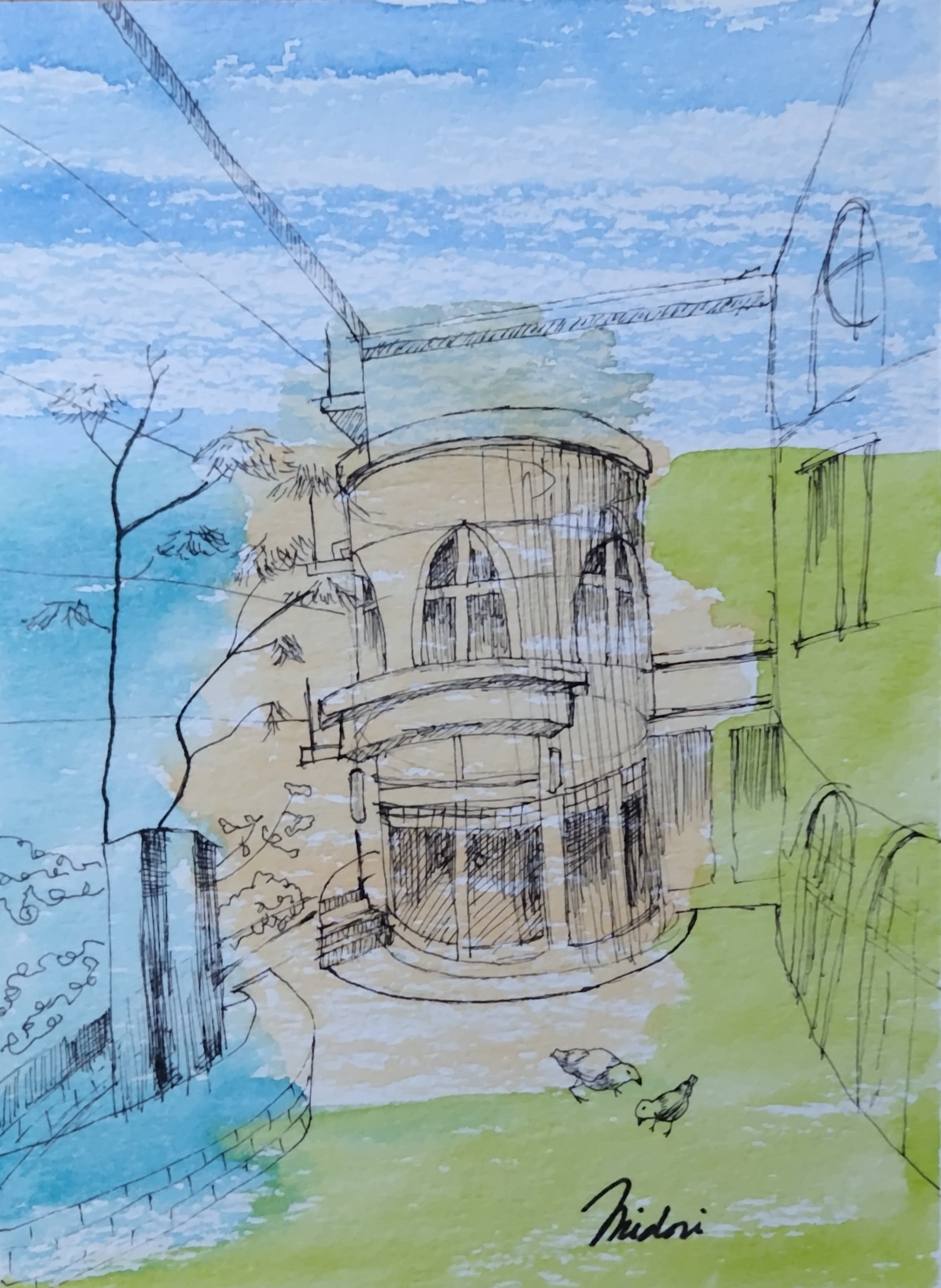 神戸・北野異人館通りを訪れた時を思い出し、米大リーグで活躍するダルビッシュ有ゆかりの施設・ダルビッシュコートを描きました。