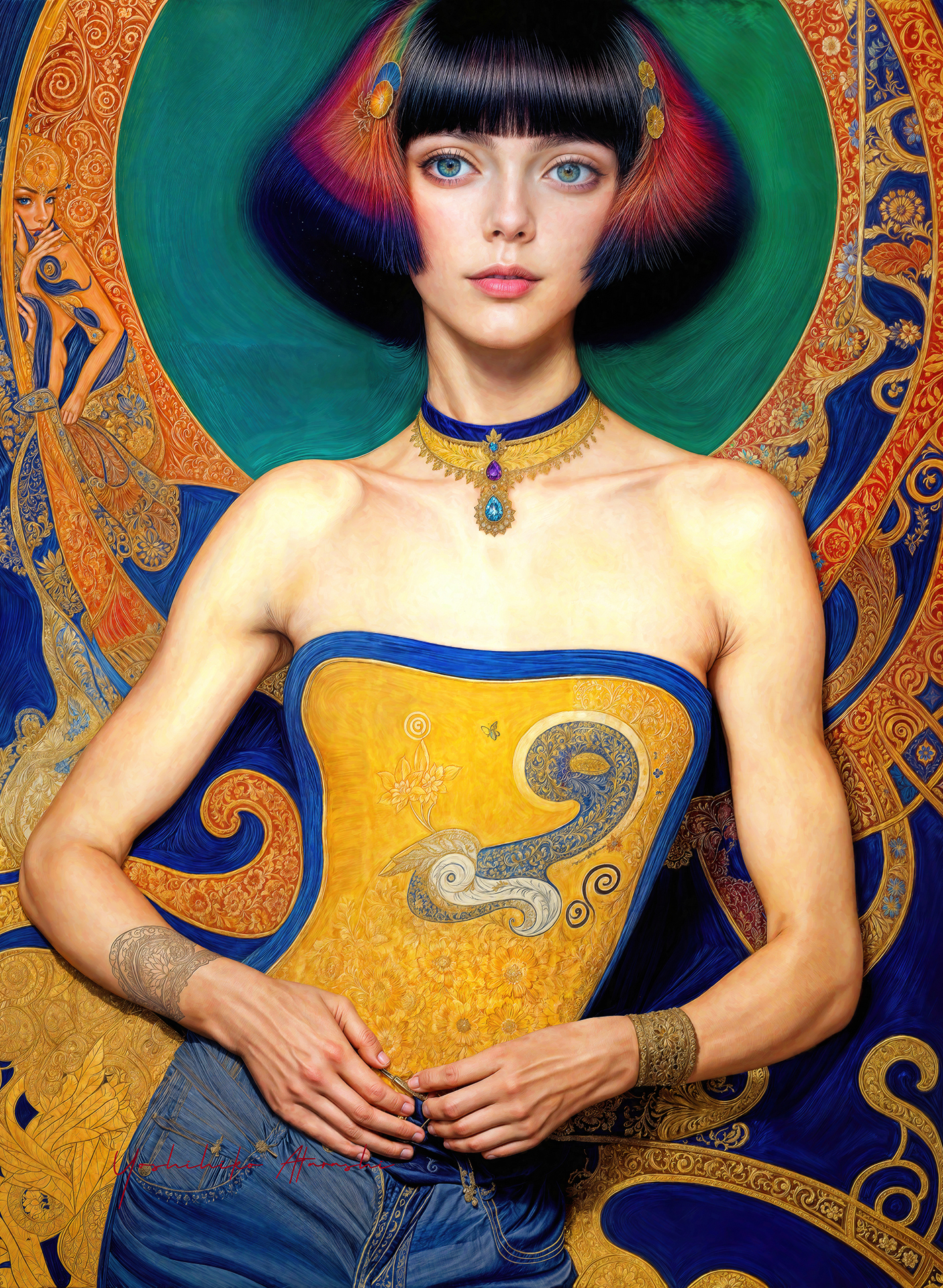 本作「The Gaze Remains」シリーズは、時代を超越する静謐な美を湛えています。金や深い青・赤・黄を基調とした服装と背景に、繊細な筆致で描かれた女性たちは、見る者に静かな余韻を残します。展示は暗めの壁に暖色系のスポットライトを当て、絵肌の光沢と色彩を引き立てる演出を施すと良いでしょう。リビングや書斎にも映える逸品です。