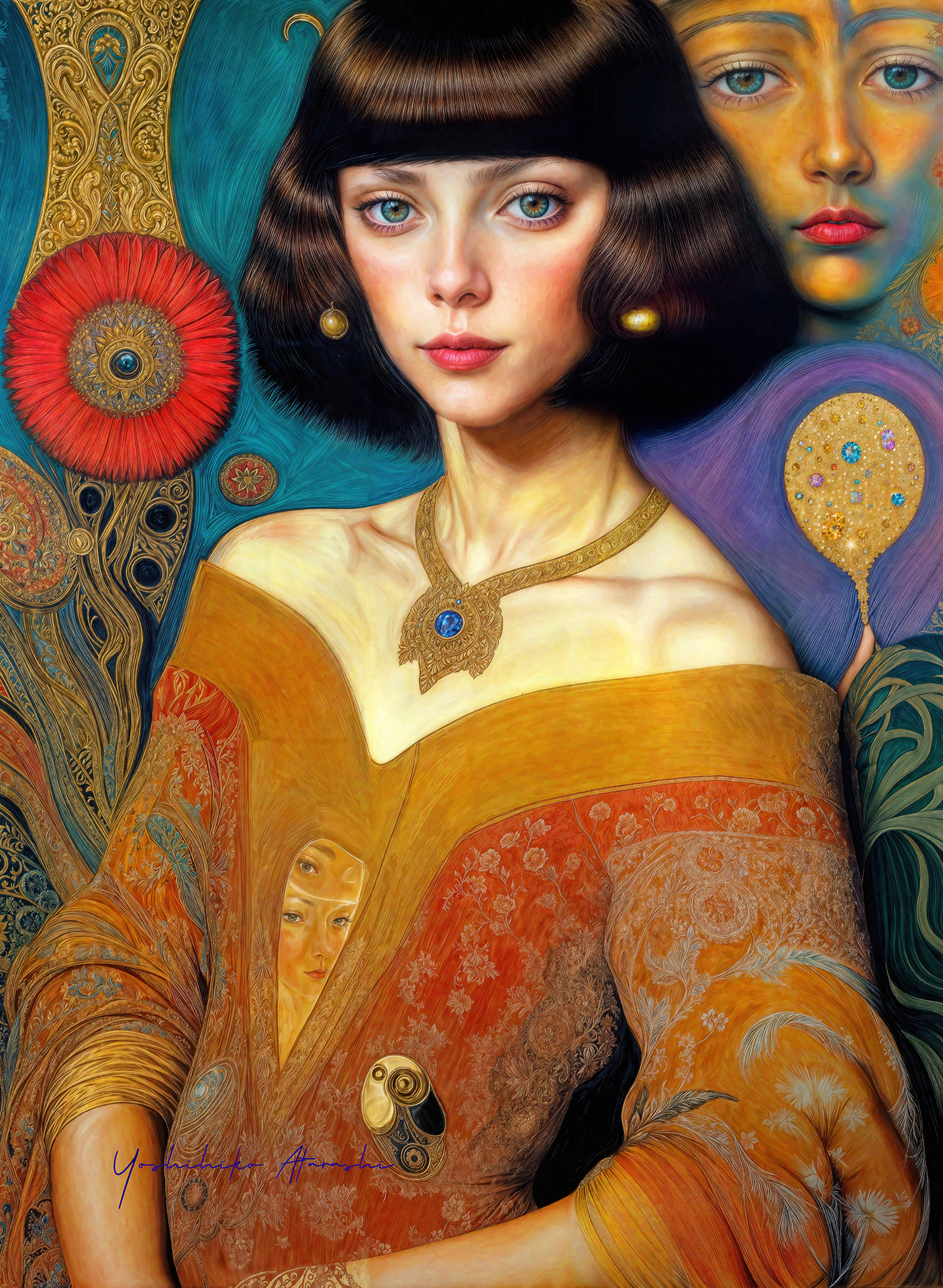 これらの作品は、永遠に残る感情の余韻を、女性のまなざしに託しました。象徴的な背景と、金箔を思わせる色彩、柔らかな筆致を用い、静かでありながらも強い内面性を表現しています。古典と現代が交錯する女性像を通じて、人間の普遍的な感情と美への探求を讃えました。