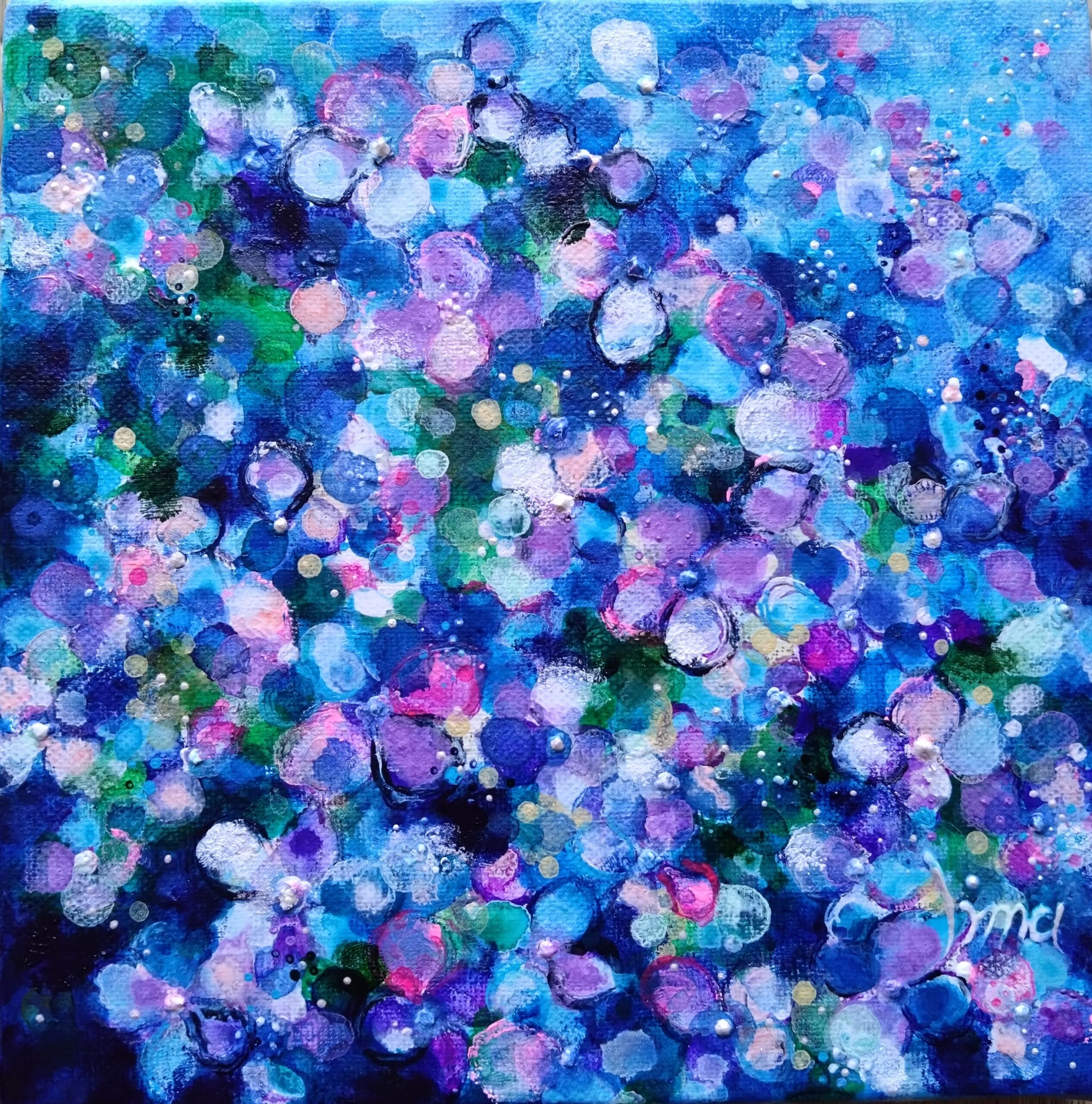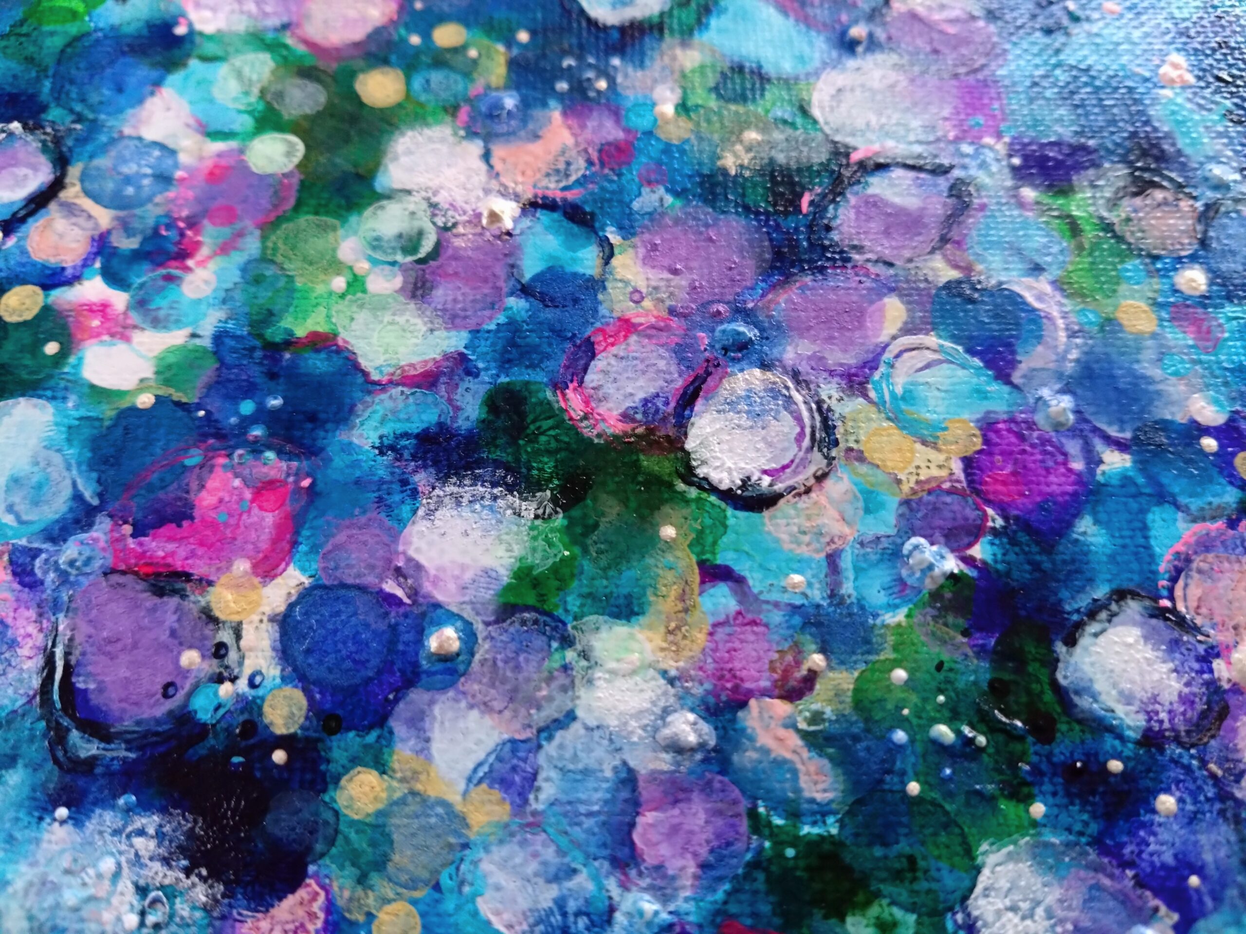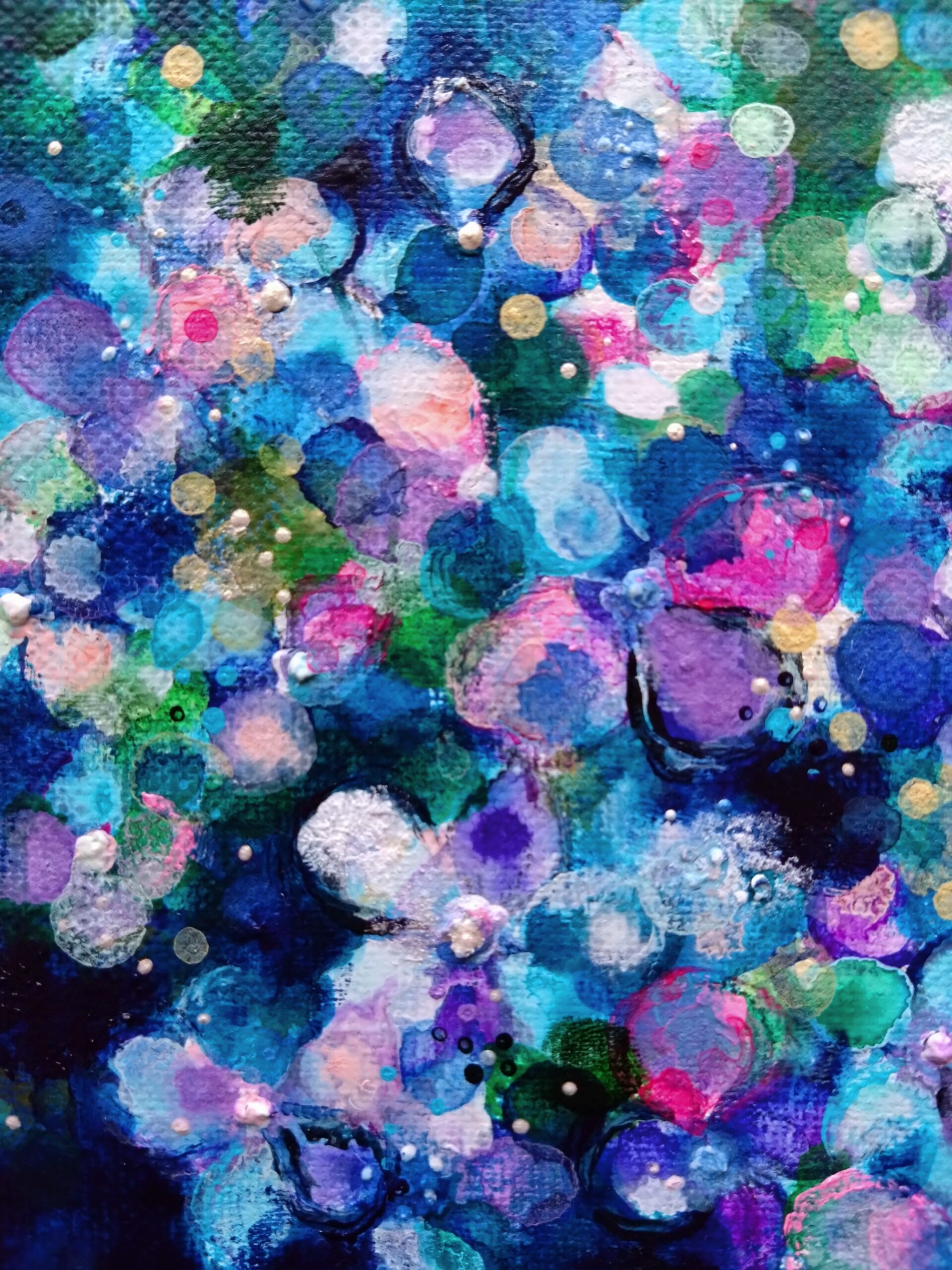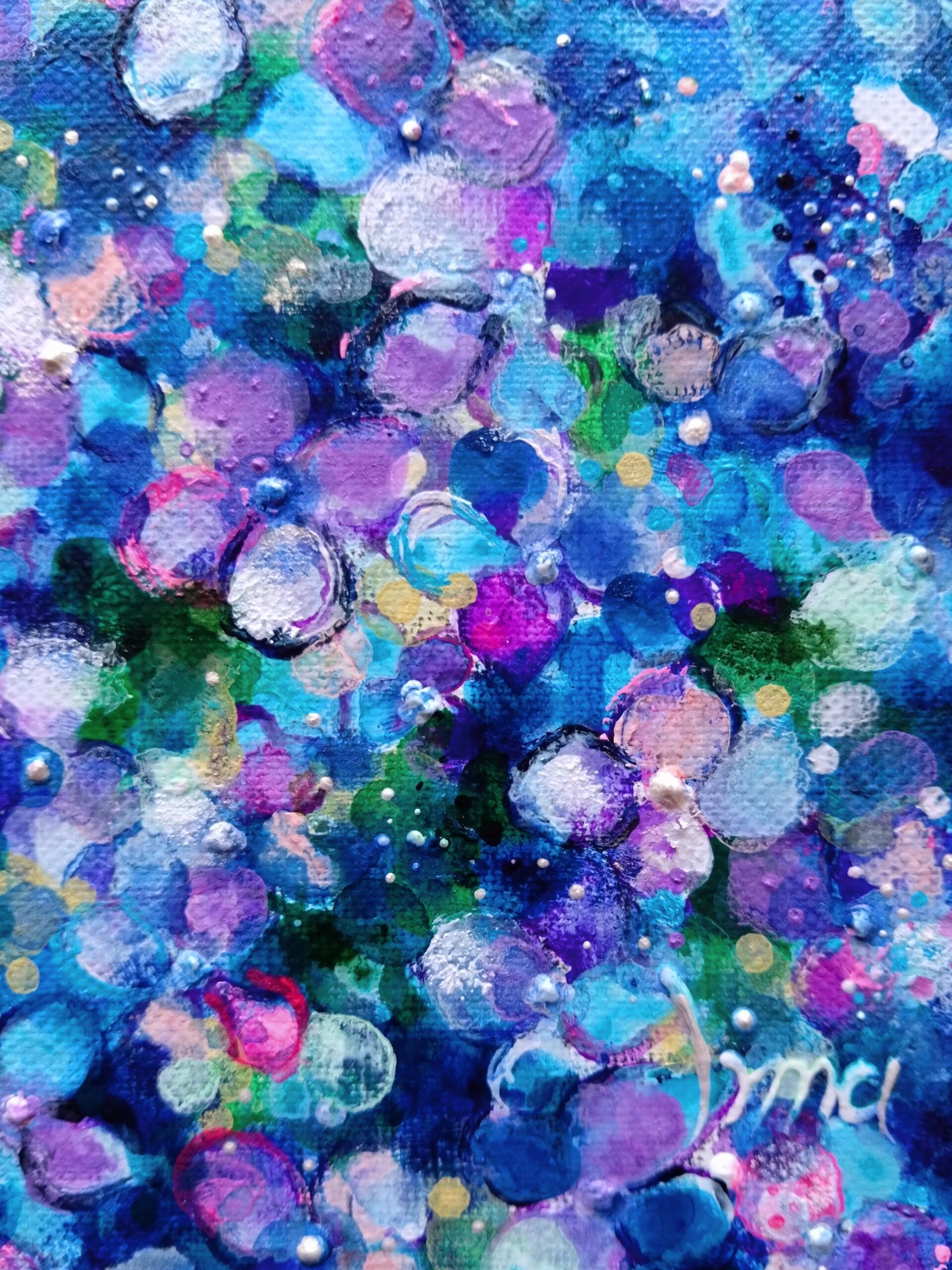 つぶつぶとつぶやくように絵を描き続けたい。私の作品の特徴である、つぶつぶの絵肌はひとつぶひとつぶ絵と対話するように手を動かし作り出しています。