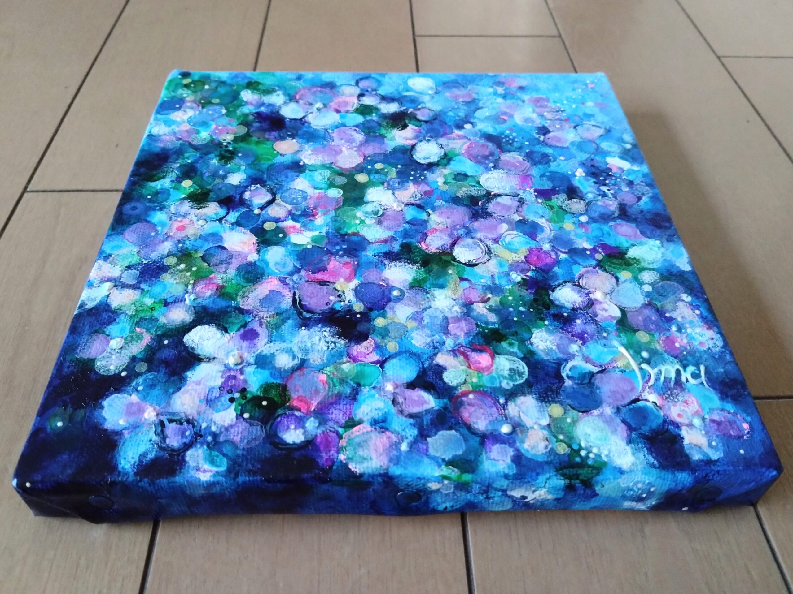 絵の表面にはUV画面保護剤をかけてあります。側面にもペイントしてあり、裏には金具と紐をお付けしますので、そのまま壁にかけて飾っていただけます。