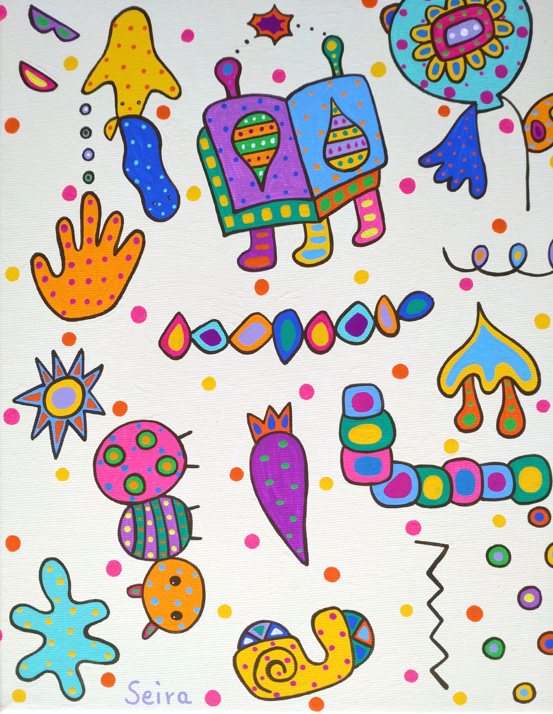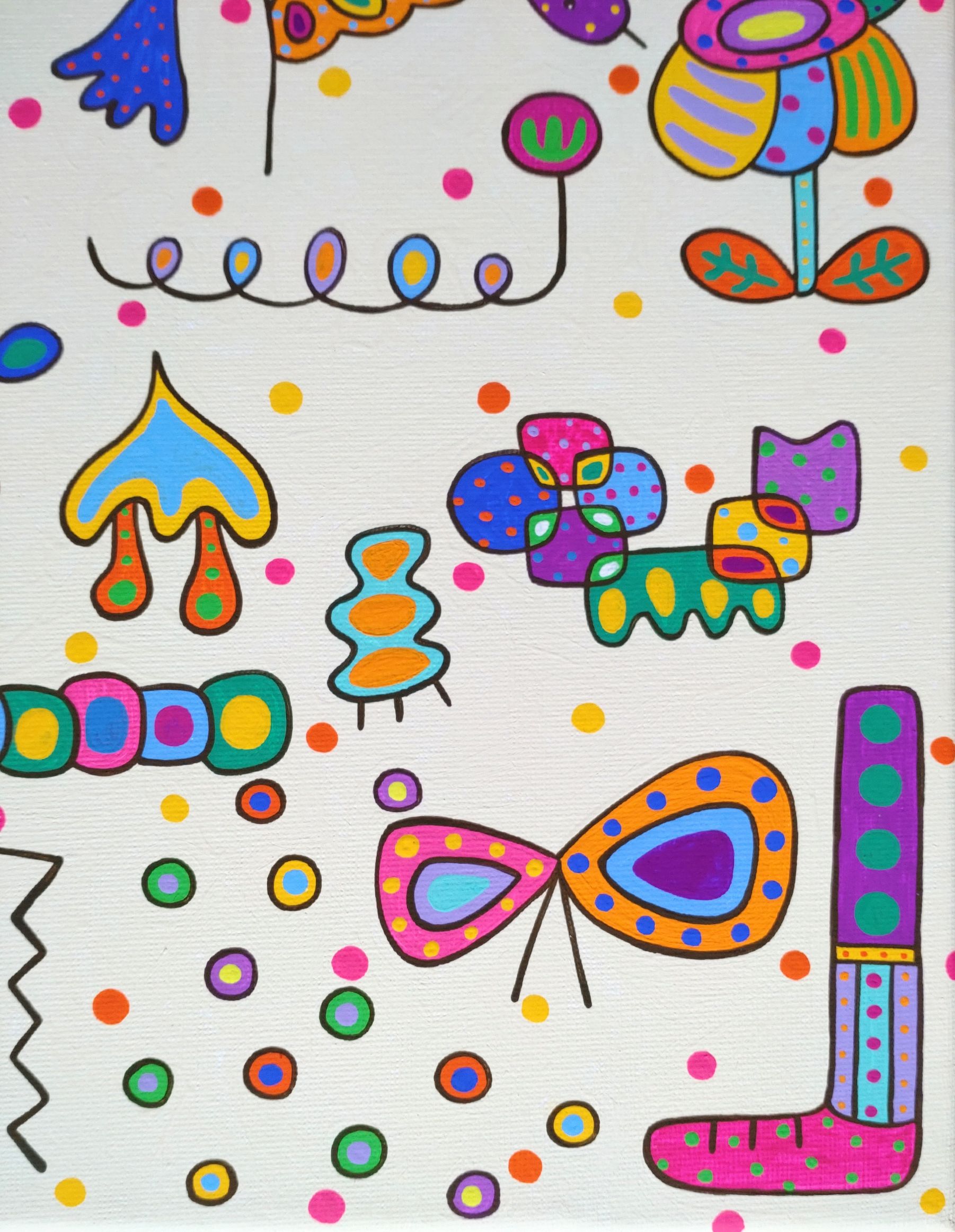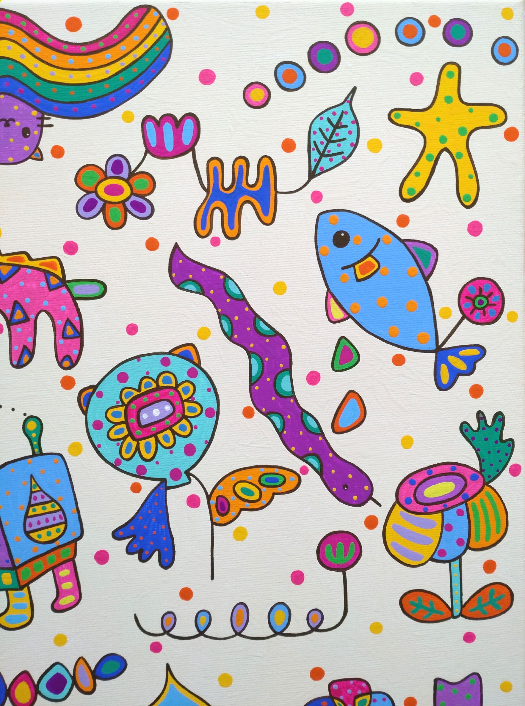 自由に描きました。作品のタイトルは、完成した作品を見てつけました。動物、魚、花、雲、虫、足、へびなどがいます。それぞれの生き物が自由に過ごしています。背景の色はアイボリーです。