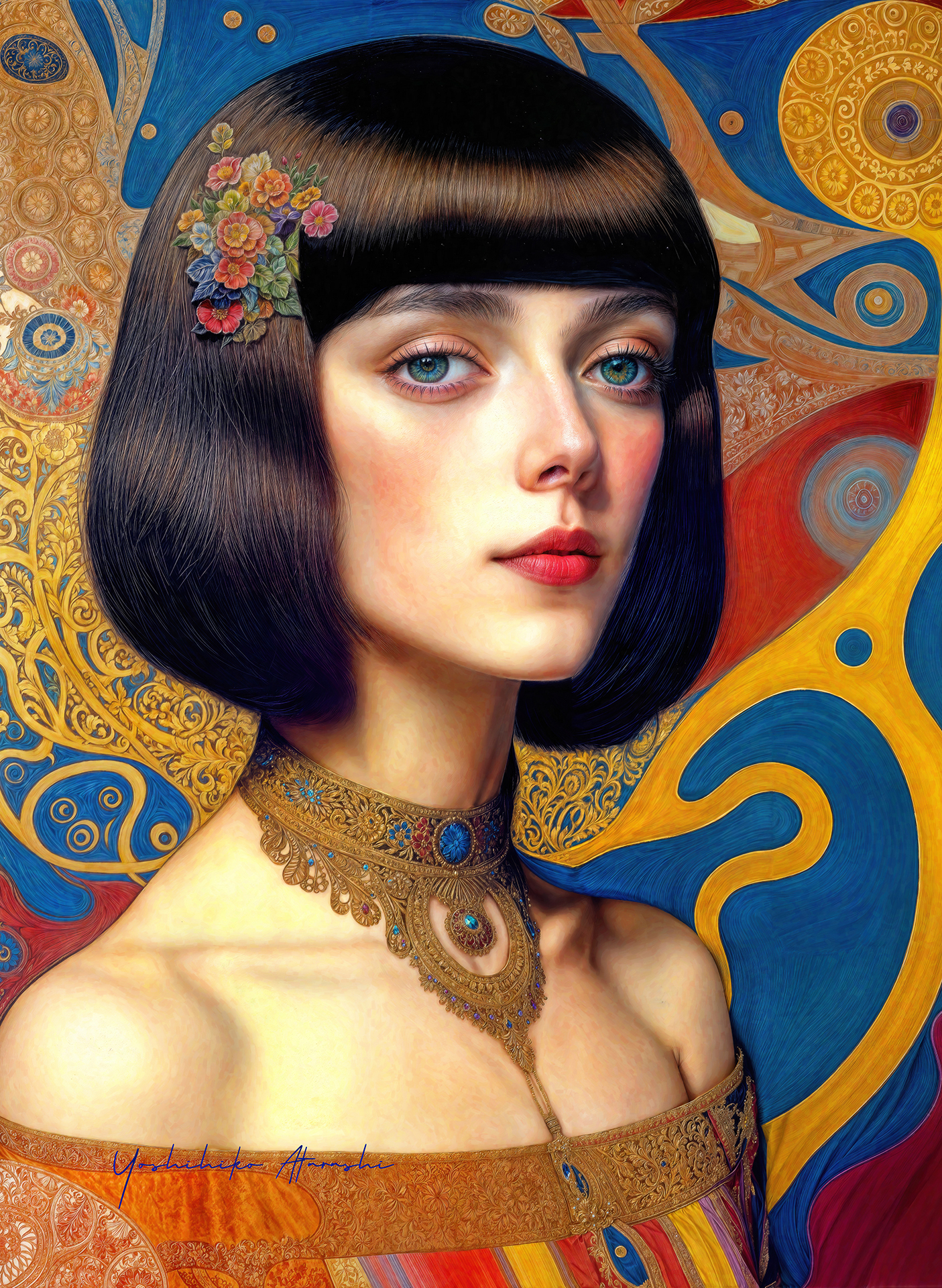 本作「The Gaze Remains」シリーズは、時代を超越する静謐な美を湛えています。金や深い青・赤・黄を基調とした服装と背景に、繊細な筆致で描かれた女性たちは、見る者に静かな余韻を残します。展示は暗めの壁に暖色系のスポットライトを当て、絵肌の光沢と色彩を引き立てる演出を施すと良いでしょう。リビングや書斎にも映える逸品です。