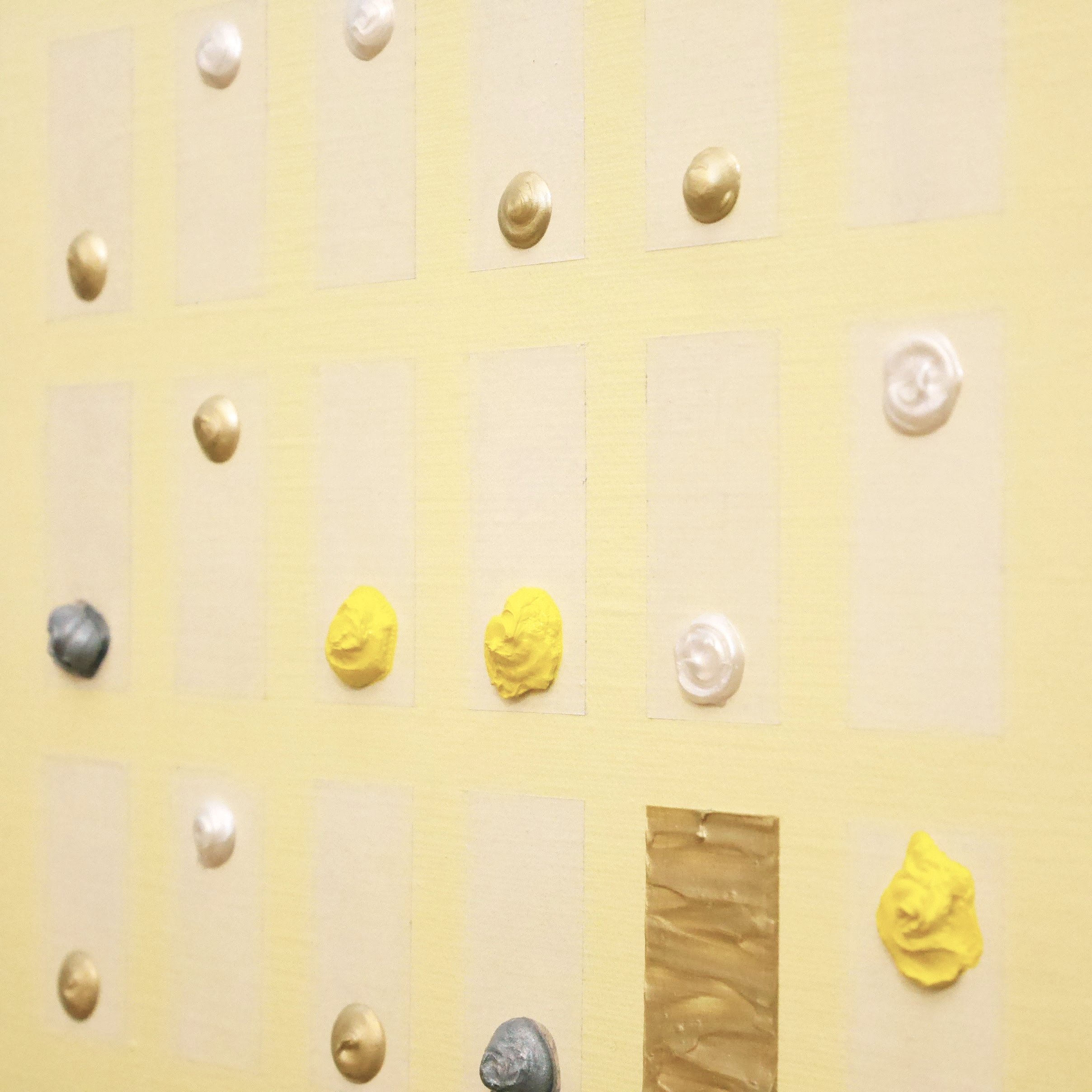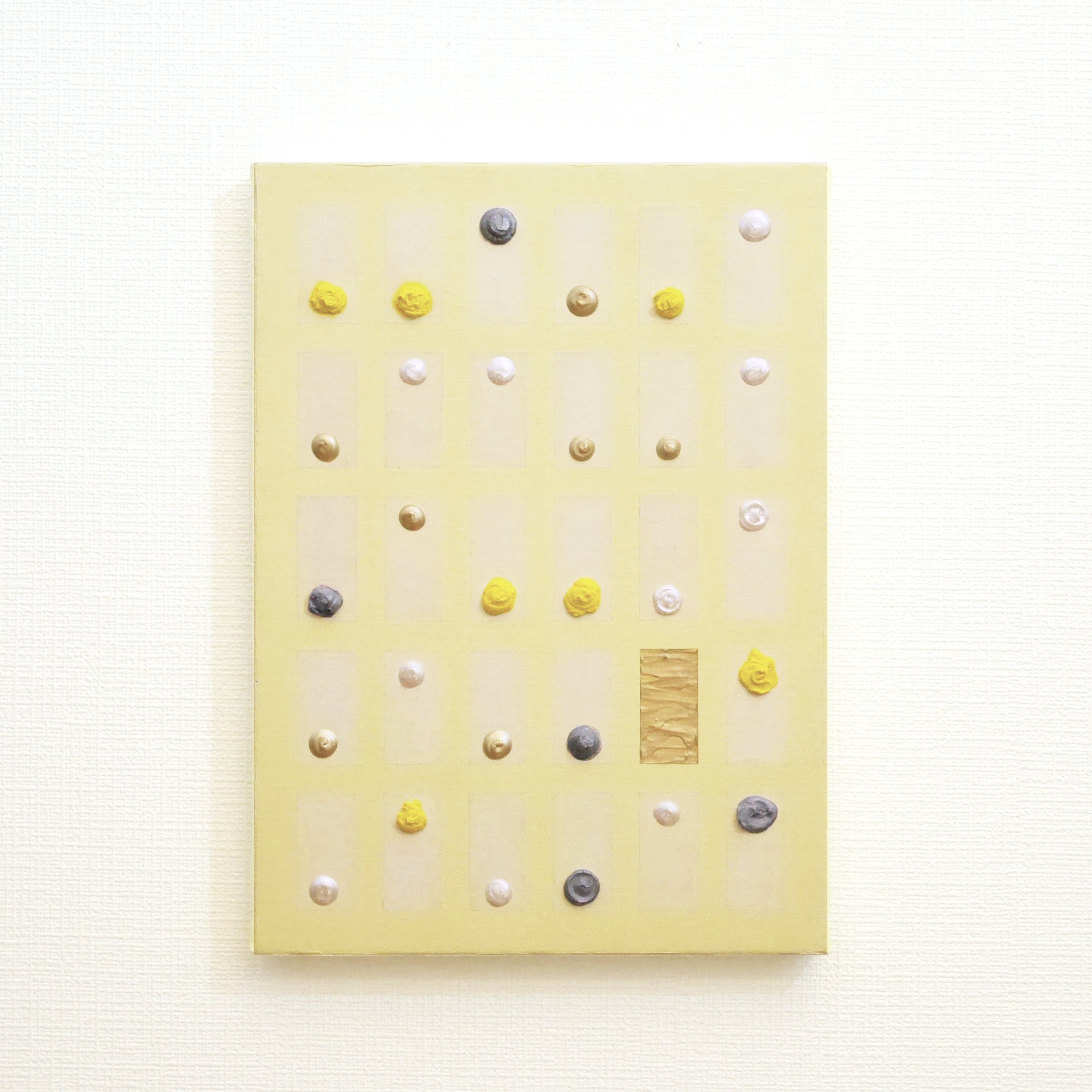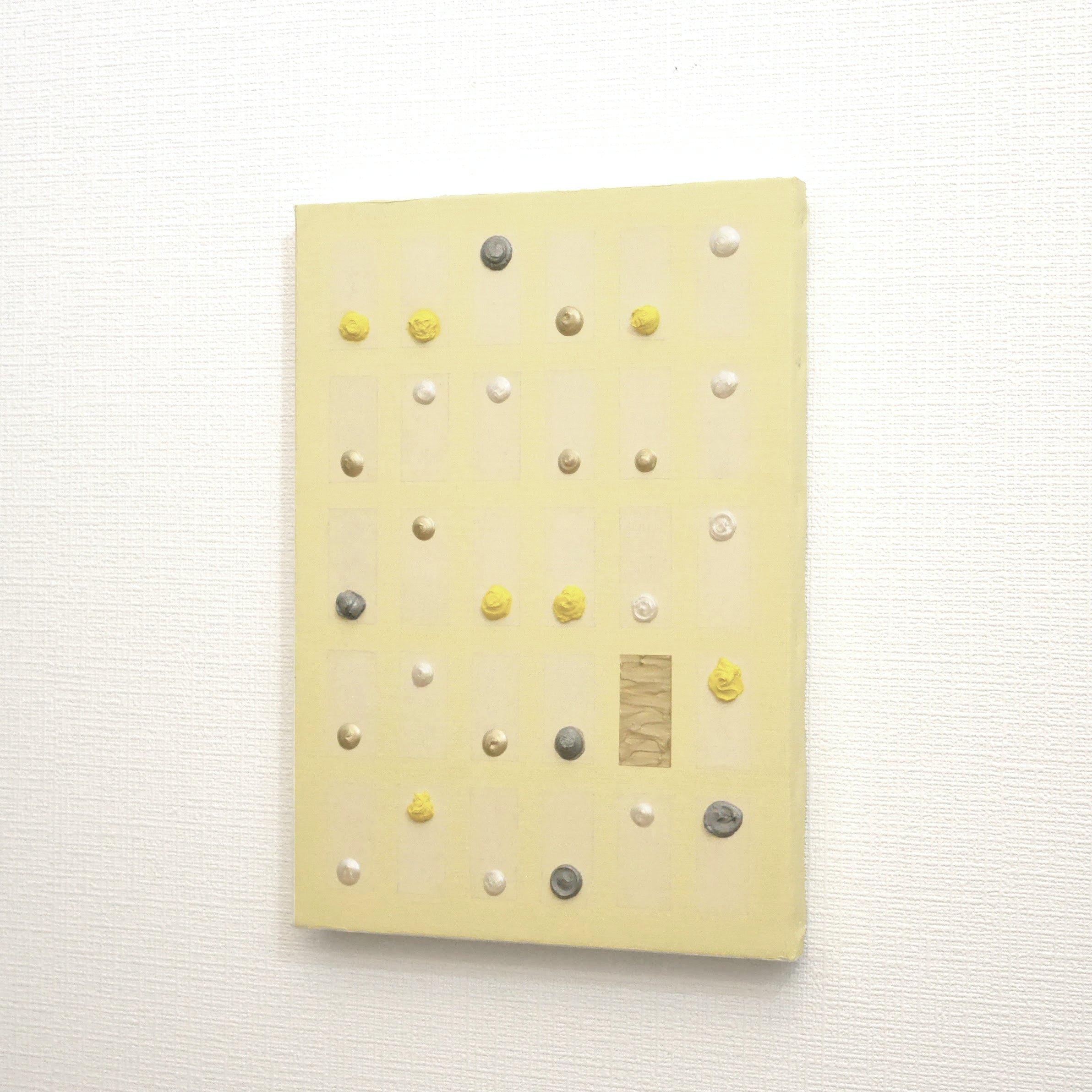 イエロークリーム色の背景にパール色の図形と、油彩絵具がそのまま肉厚にポイントされた抽象作品です。