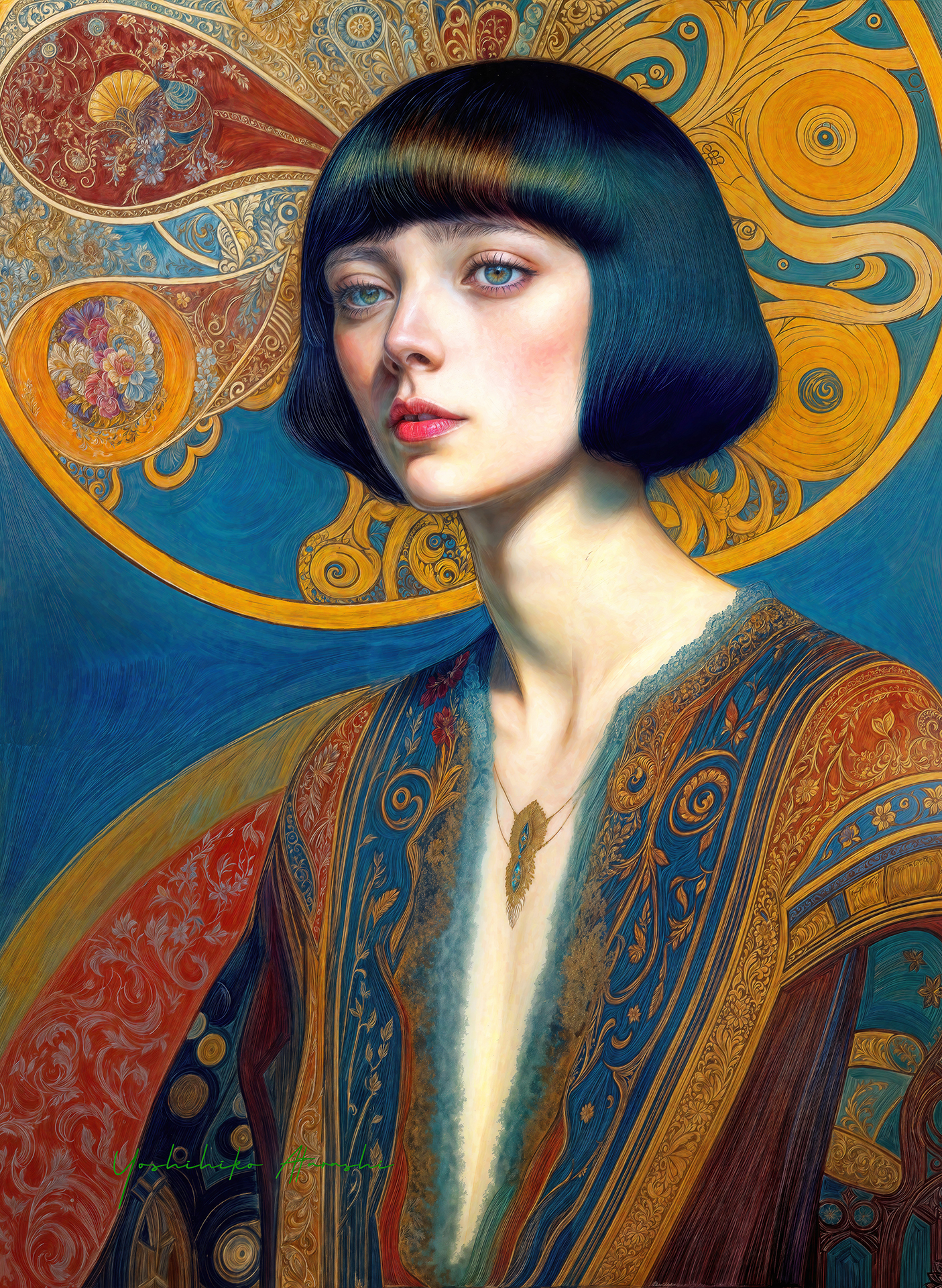 これらの作品は、永遠に残る感情の余韻を、女性のまなざしに託しました。象徴的な背景と、金箔を思わせる色彩、柔らかな筆致を用い、静かでありながらも強い内面性を表現しています。古典と現代が交錯する女性像を通じて、人間の普遍的な感情と美への探求を讃えました。
