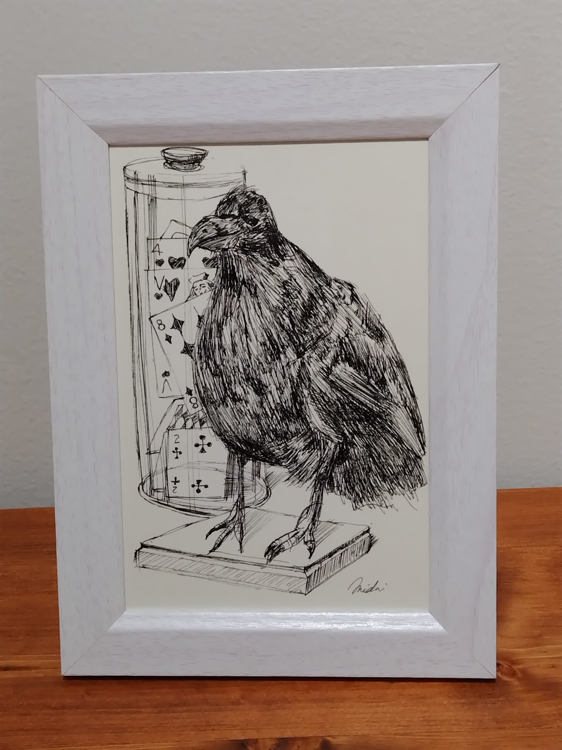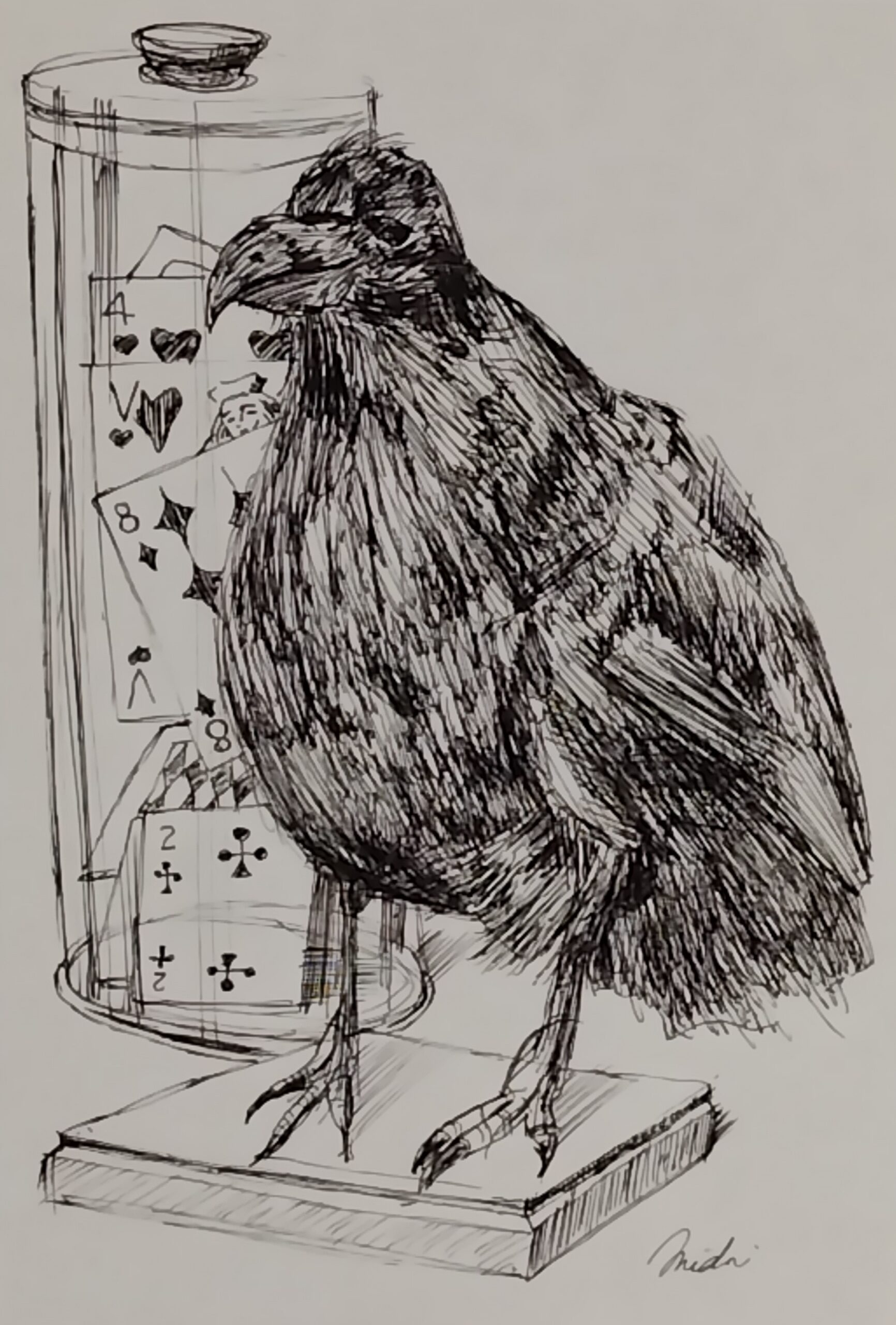 神戸・北野坂異人館ベンの家を訪れた時、鳥のはく製とトランプカードが一緒に置かれているのが面白く感じられ、ペンをとりました。