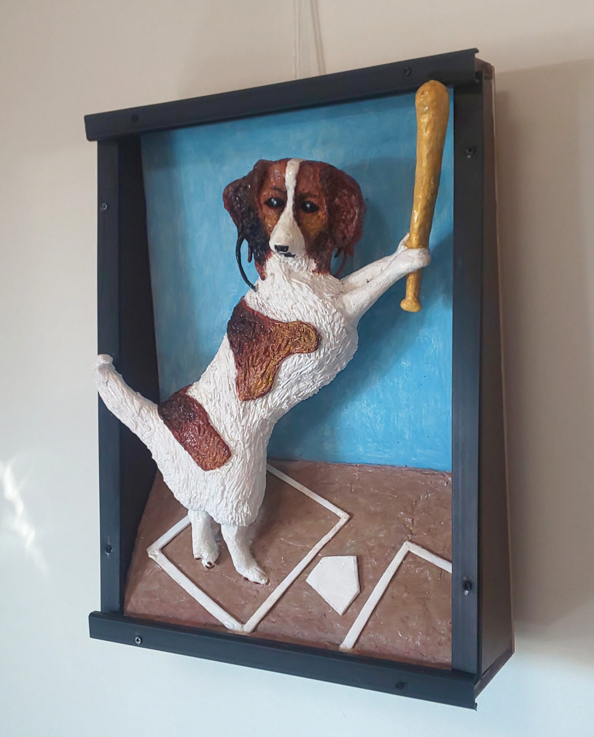 作品は、メスのデコピンが野球の打席に立つ場面。以前マウンドに立ってボールを口に咥えて走ったので、今度はもっと奇抜にバットを握る姿。甘いボールを誘き寄せようと、しっぽを揺らして真剣な構えです。