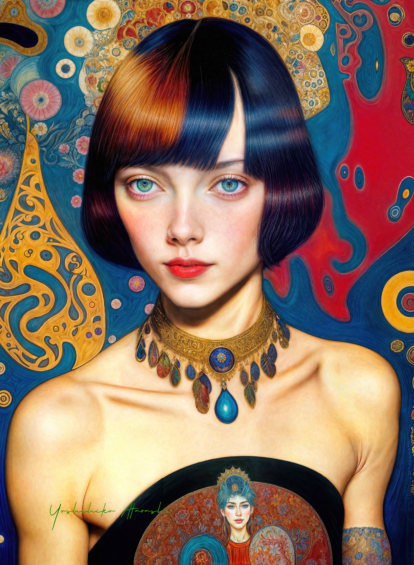 本作「The Gaze Remains」シリーズは、時代を超越する静謐な美を湛えています。金や深い青・赤・黄を基調とした服装と背景に、繊細な筆致で描かれた女性たちは、見る者に静かな余韻を残します。展示は暗めの壁に暖色系のスポットライトを当て、絵肌の光沢と色彩を引き立てる演出を施すと良いでしょう。リビングや書斎にも映える逸品です。