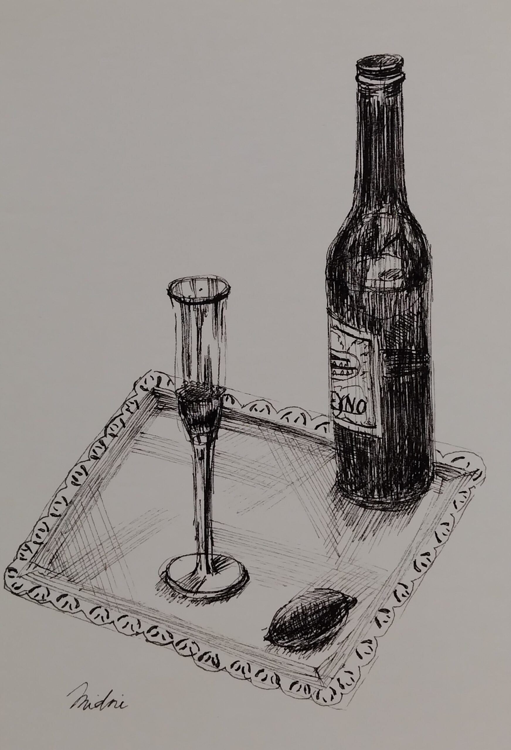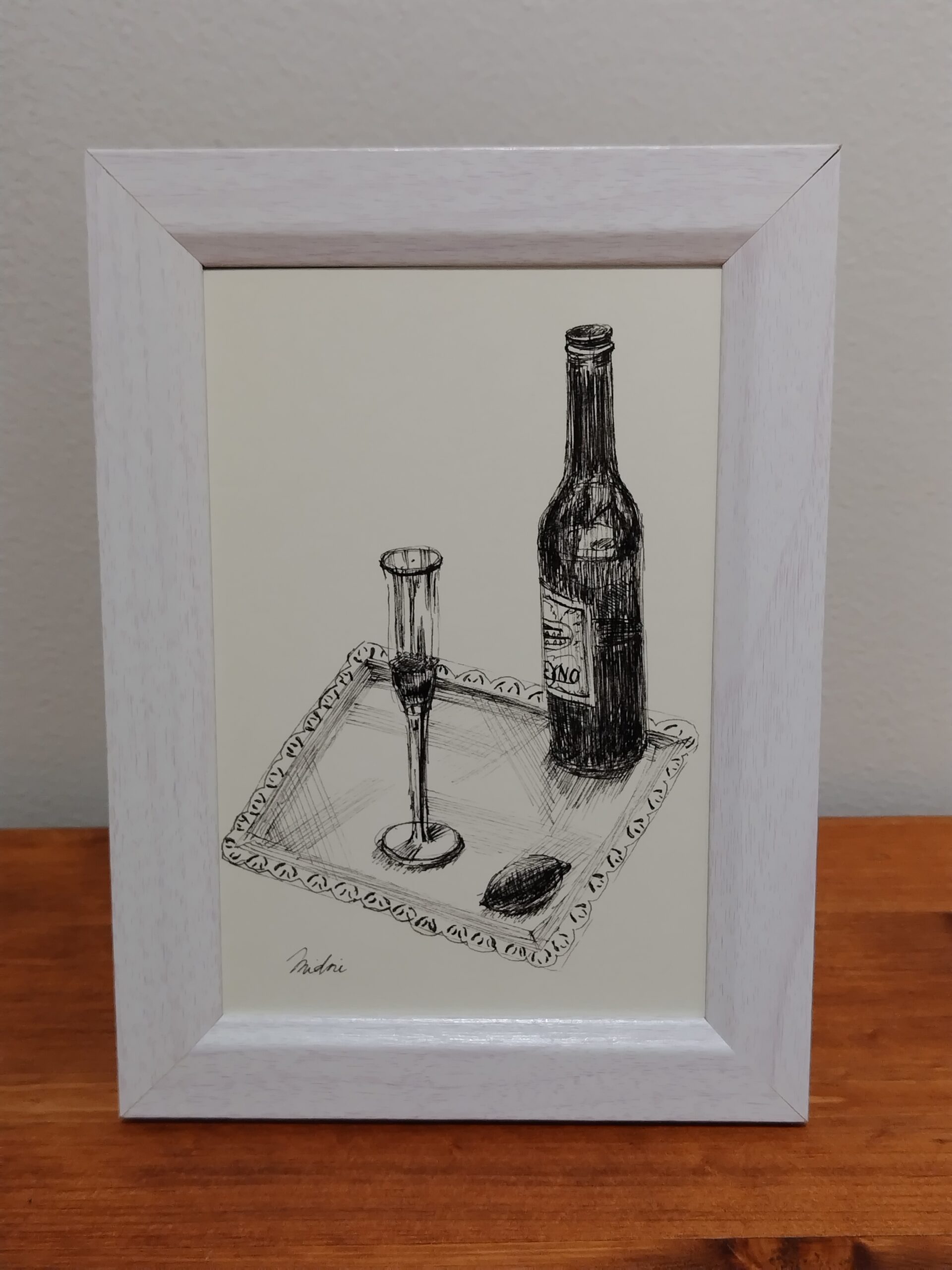 神戸・北野坂異人館英国館を訪れた時に見つけたワインボトルに、他のモチーフを加えてドローイングペンで描きました。