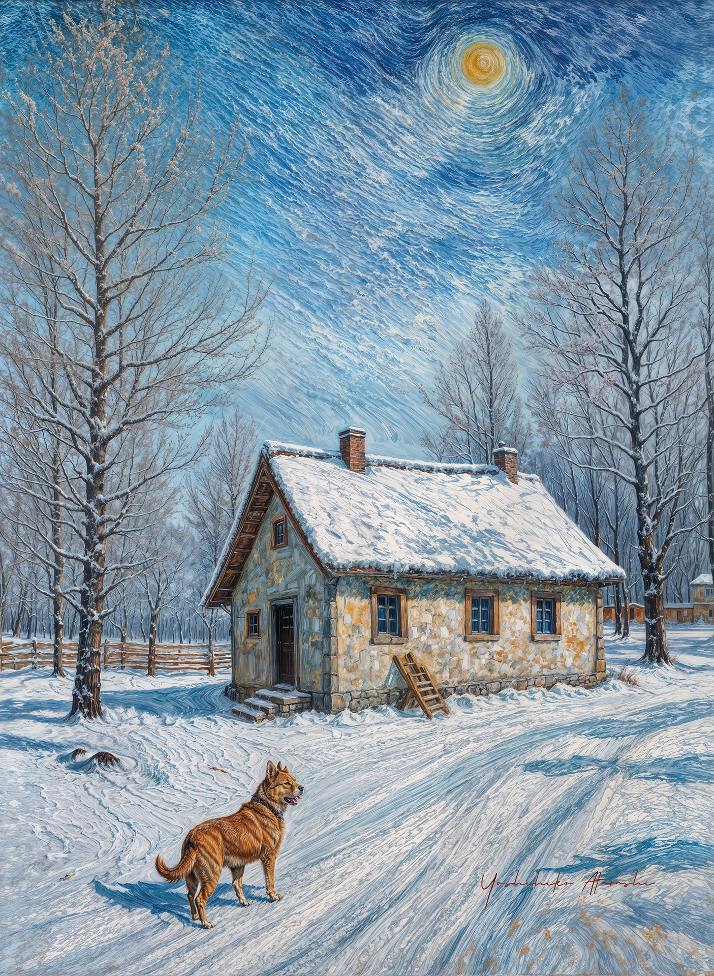 これらの絵では、雪に覆われた山の中の小屋と一匹の犬を通して、静寂と孤独、そしてわずかなぬくもりを描きました。画法は細密な筆致で冷たい空気感と雪の質感を表現し、薄青を基調にして冷たさと幻想性を強調しています。飼い主の不在を感じさせる犬の存在が、観る者に物語の余白を想像させることを意図しています。