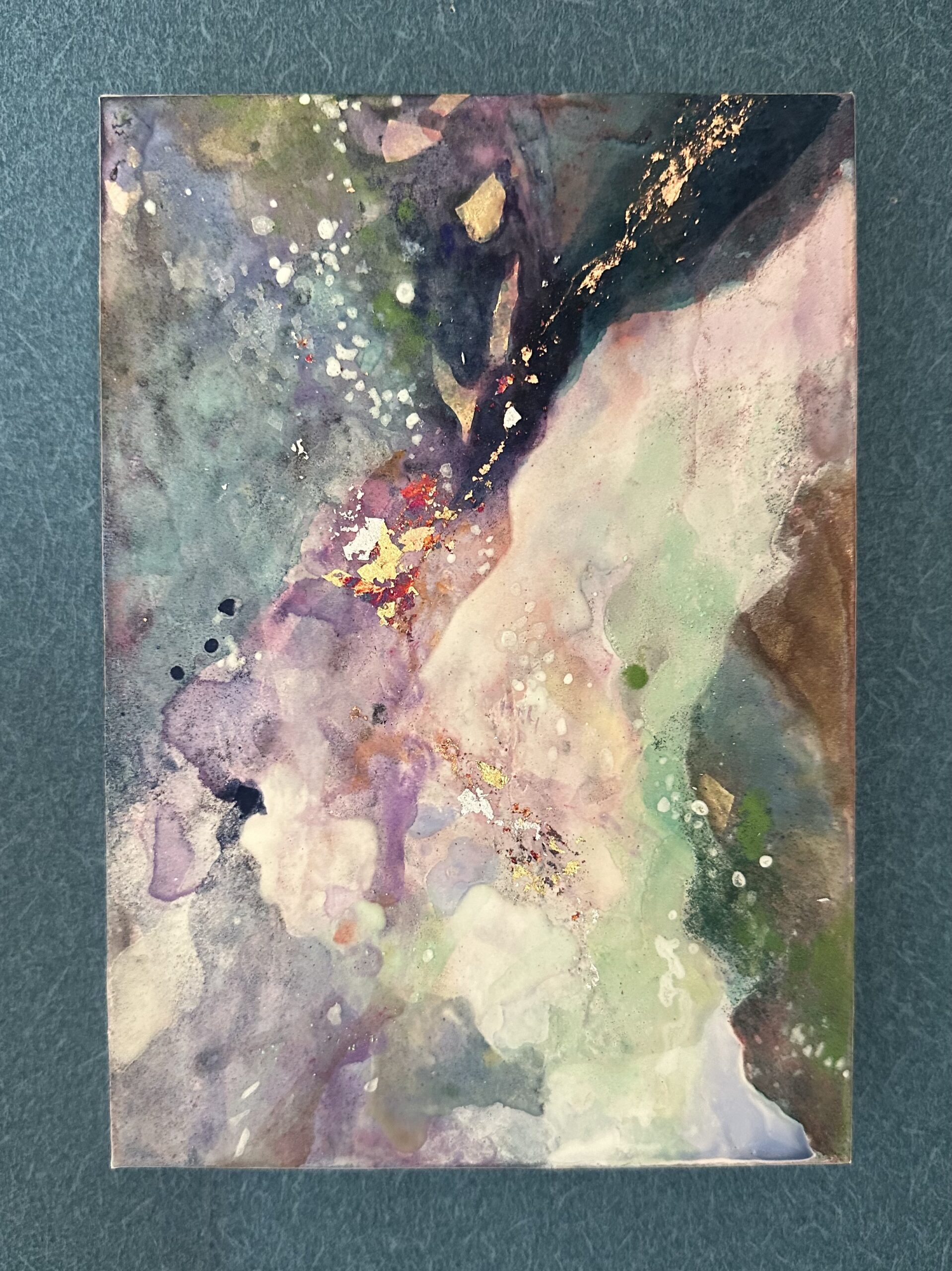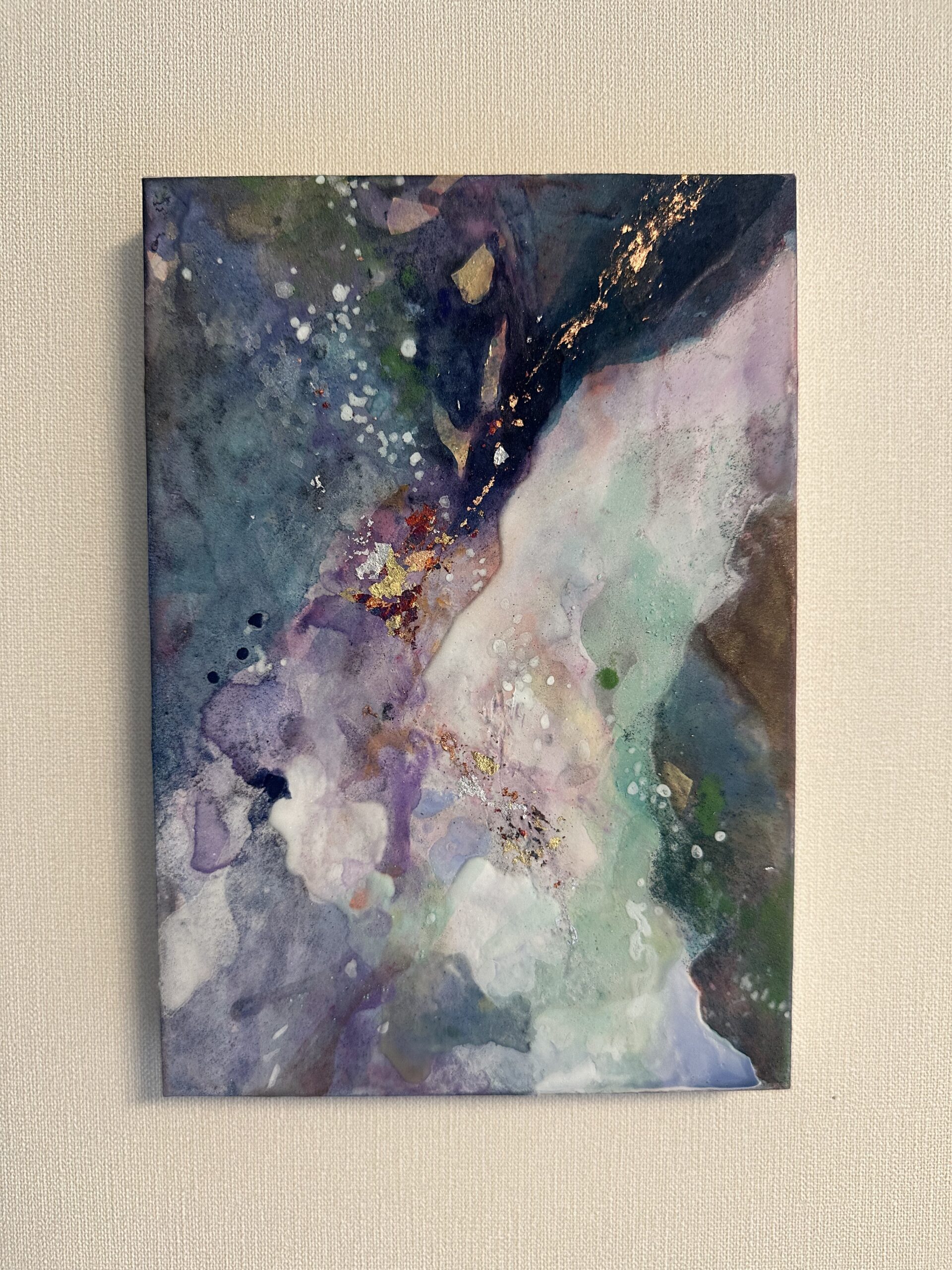 子どもの頃に畦道で摘んだ草花の色、鏡のような静かな海の色、名残惜しい夕日の色…。岩絵具の美しい色の粒子を使うことで、いろいろな色を表現できそうな気がして、日本画制作を始めました。