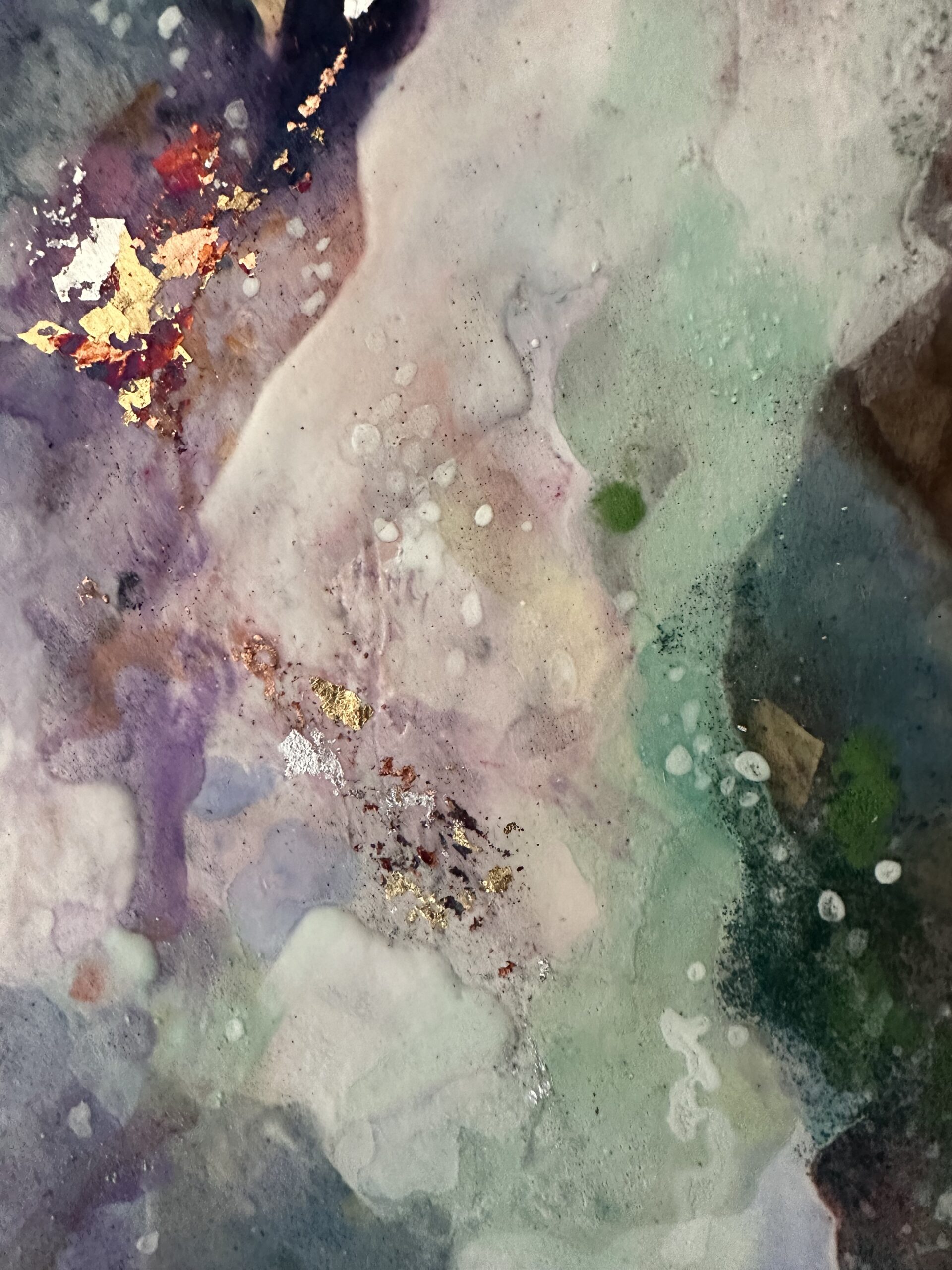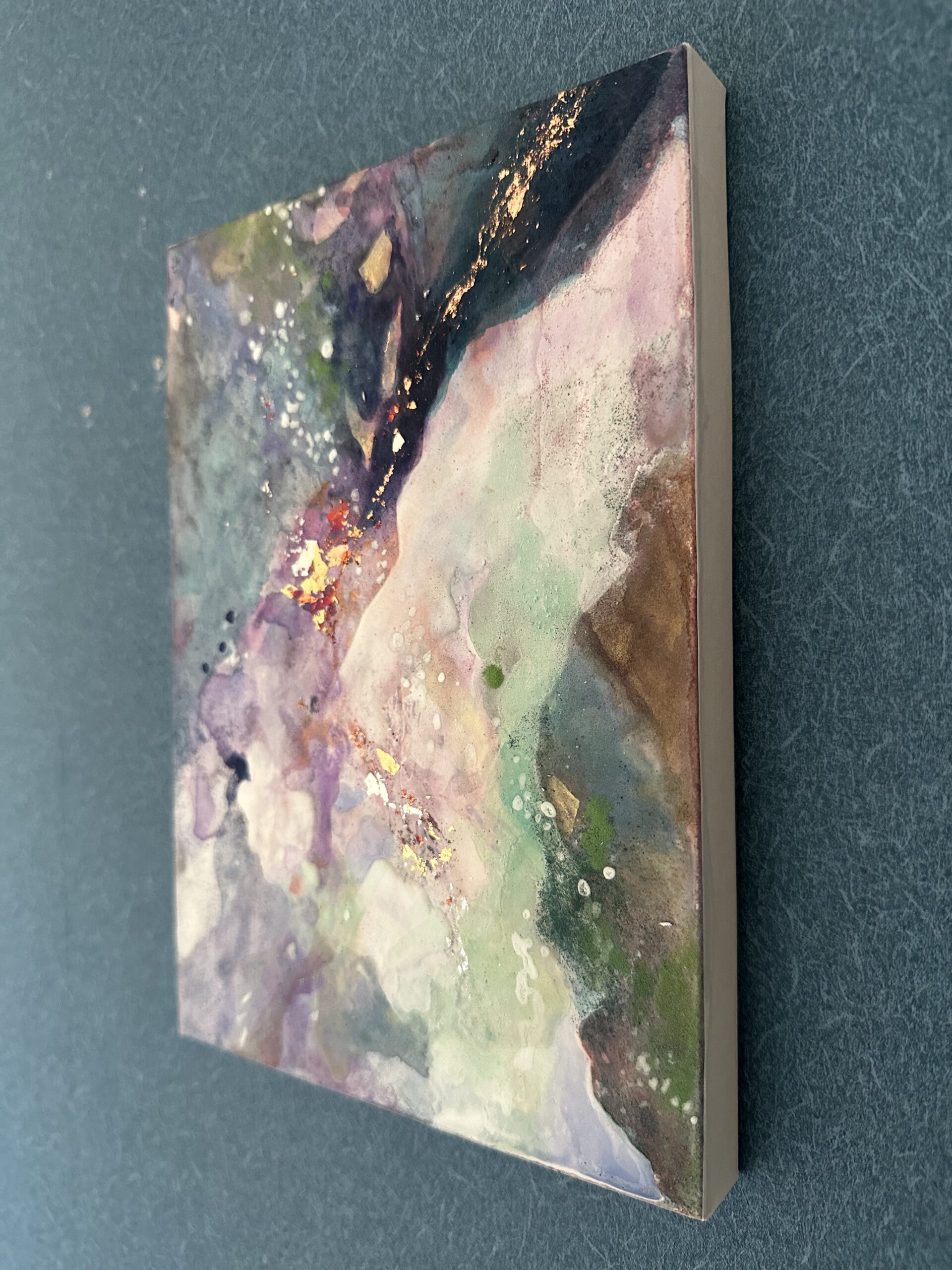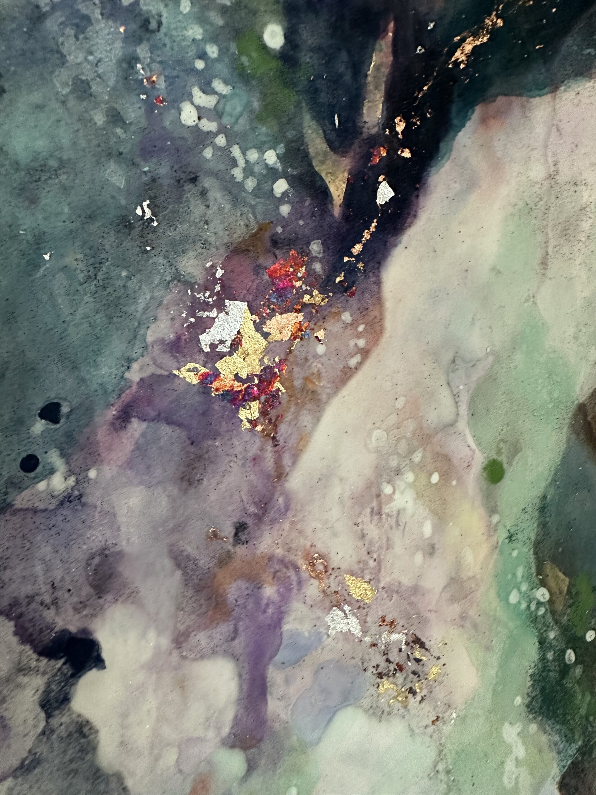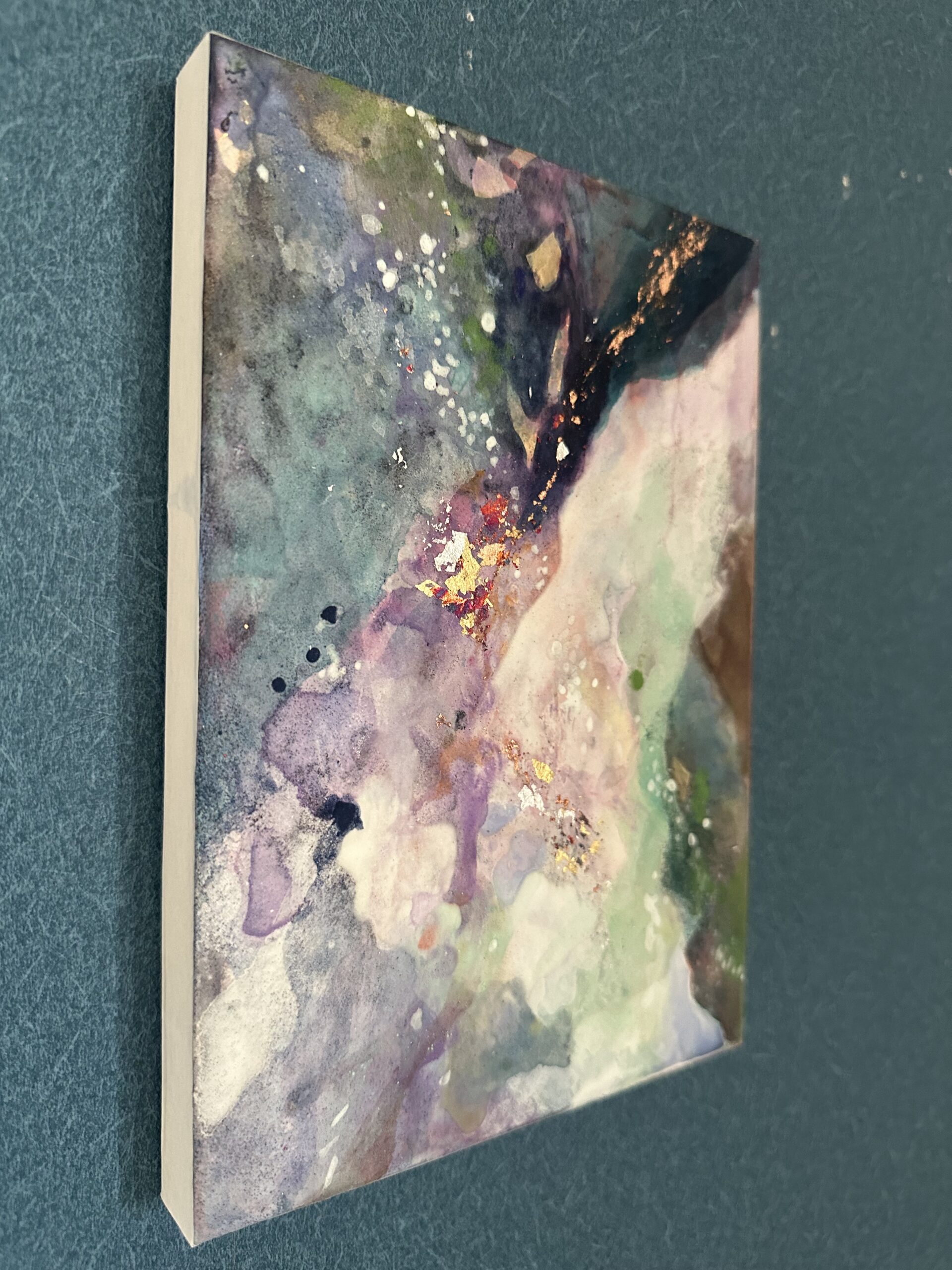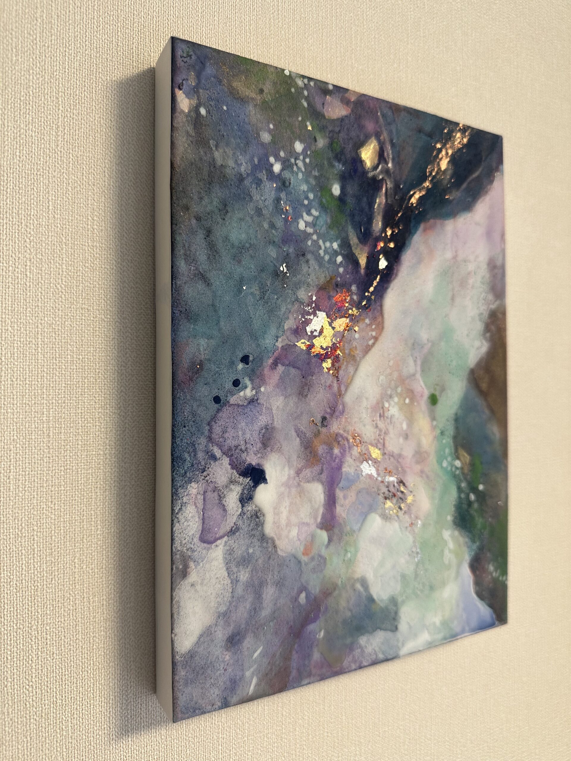 箔を使用した作品は、光のあたり方によって輝き方が変わります。日中の窓から入る自然光、夜の照明の光など、光の違いにより表情がかなり変わります。また、箔の変色を抑えるためのコーティングをしておりますが、時間経過とともに少しずつ色味が変化します。その変化もお楽しみいただけますと幸いです。