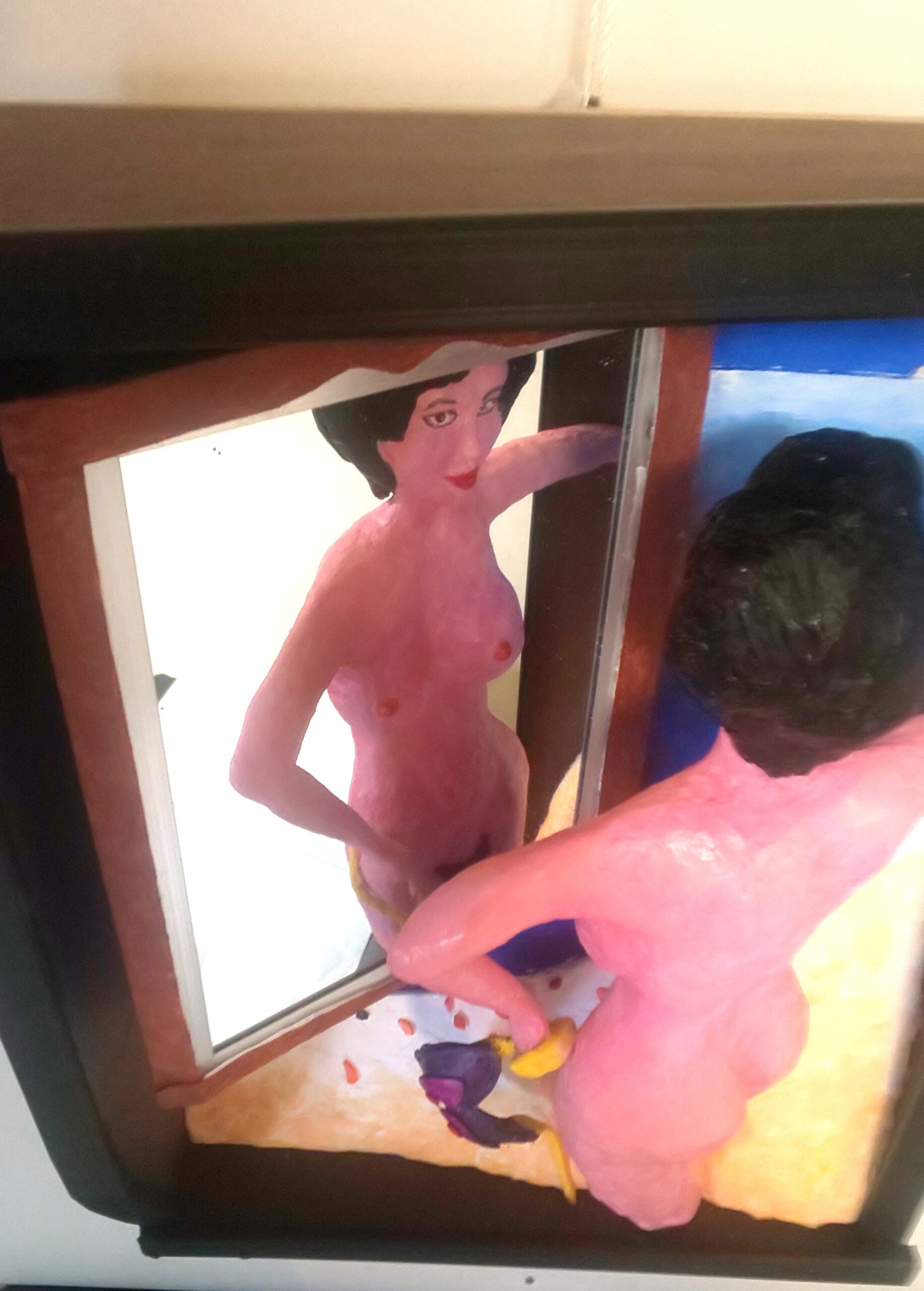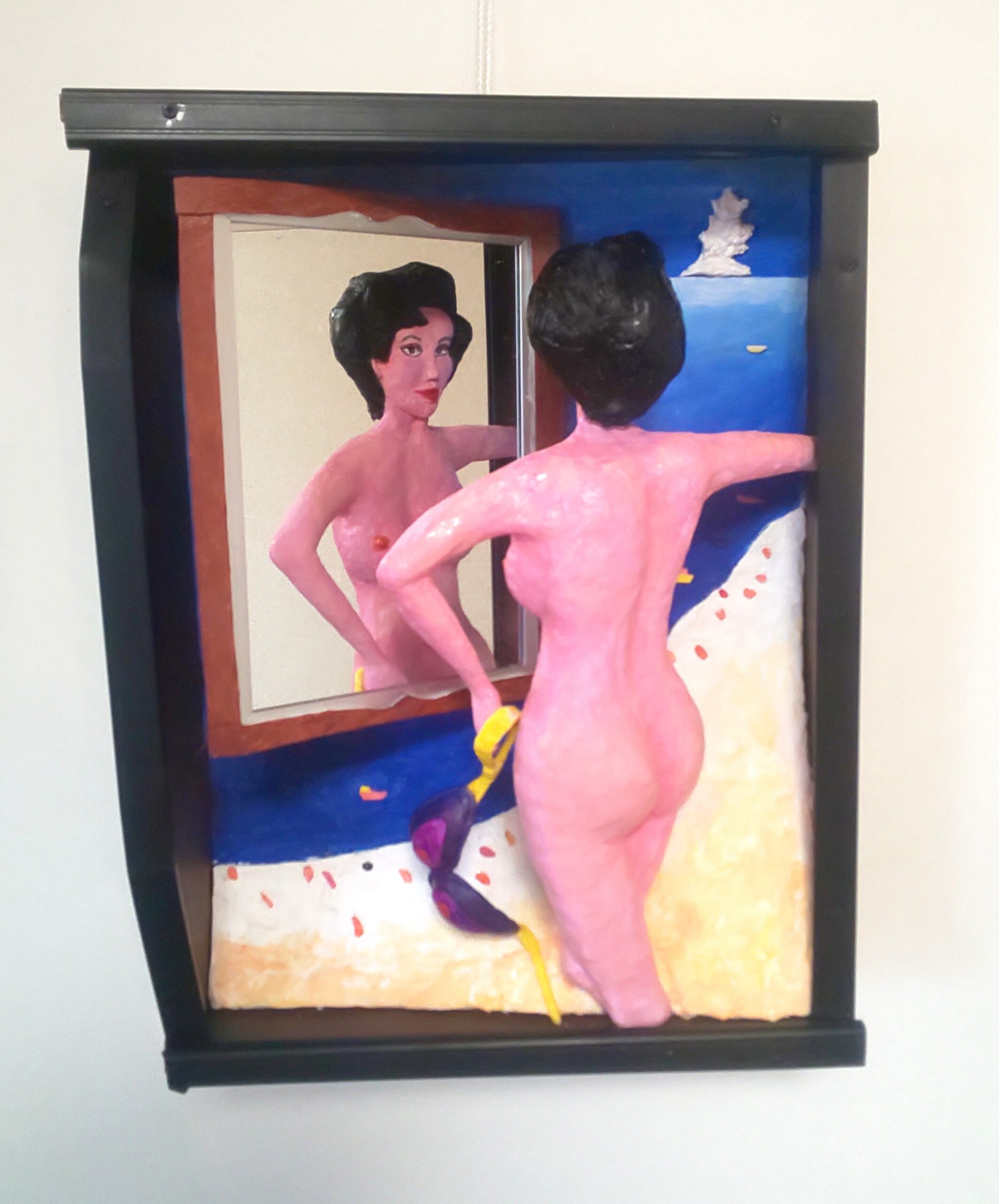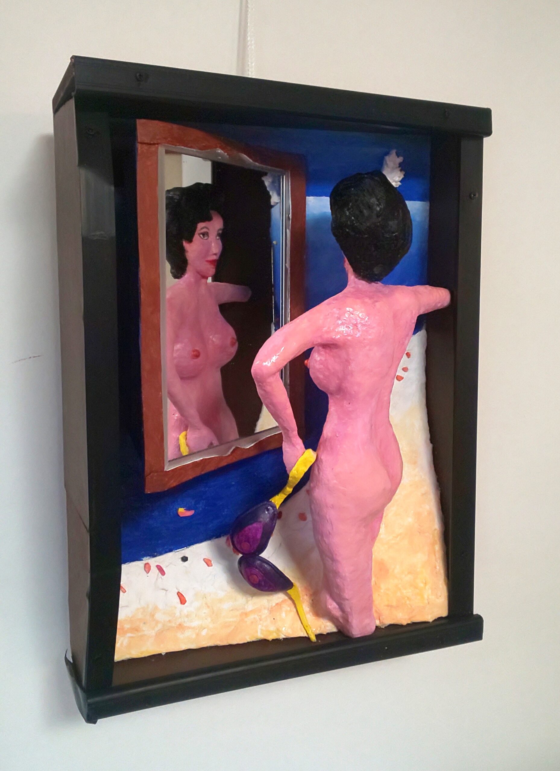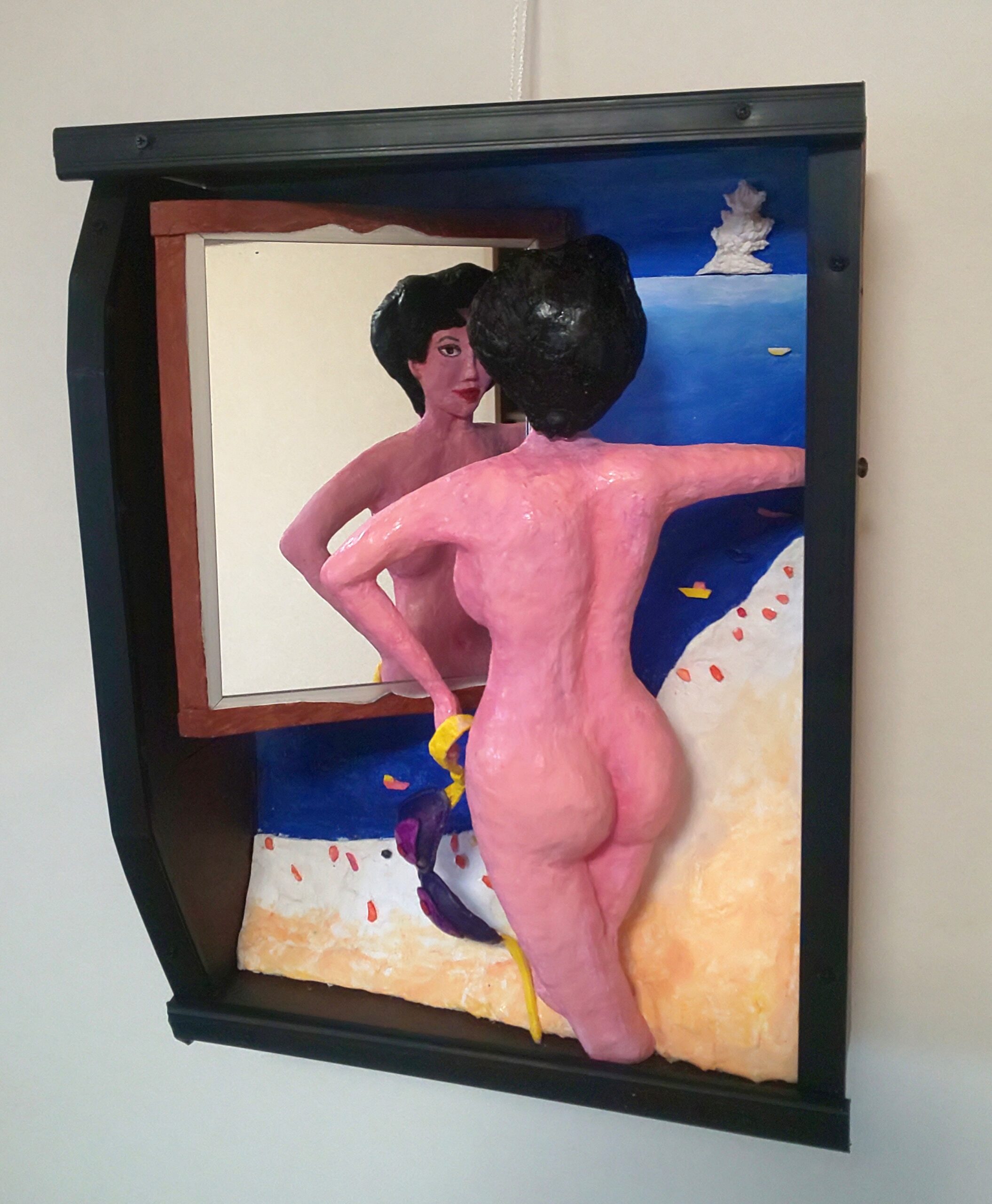 未来アートの立体絵画で制作の「ビーチに着いて、鏡の前で着替え」が作品。婦人が海辺に着いて、水着に着替えようとしているの立体絵画。