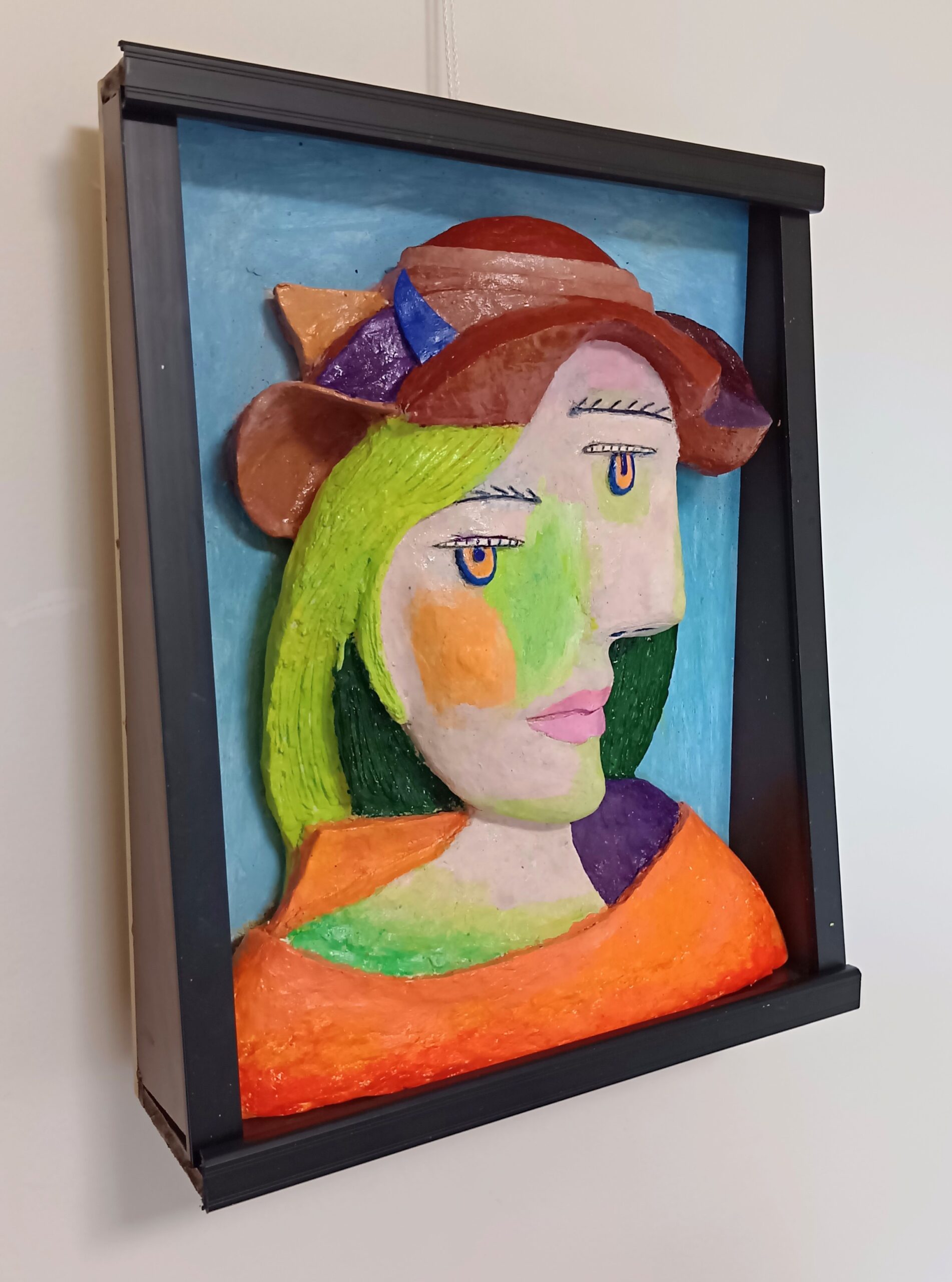 未来アートの立体絵画で制作の「キュビスム女の顔」が作品。著名なピカソ作品「女の顔」の複製の立体絵画。