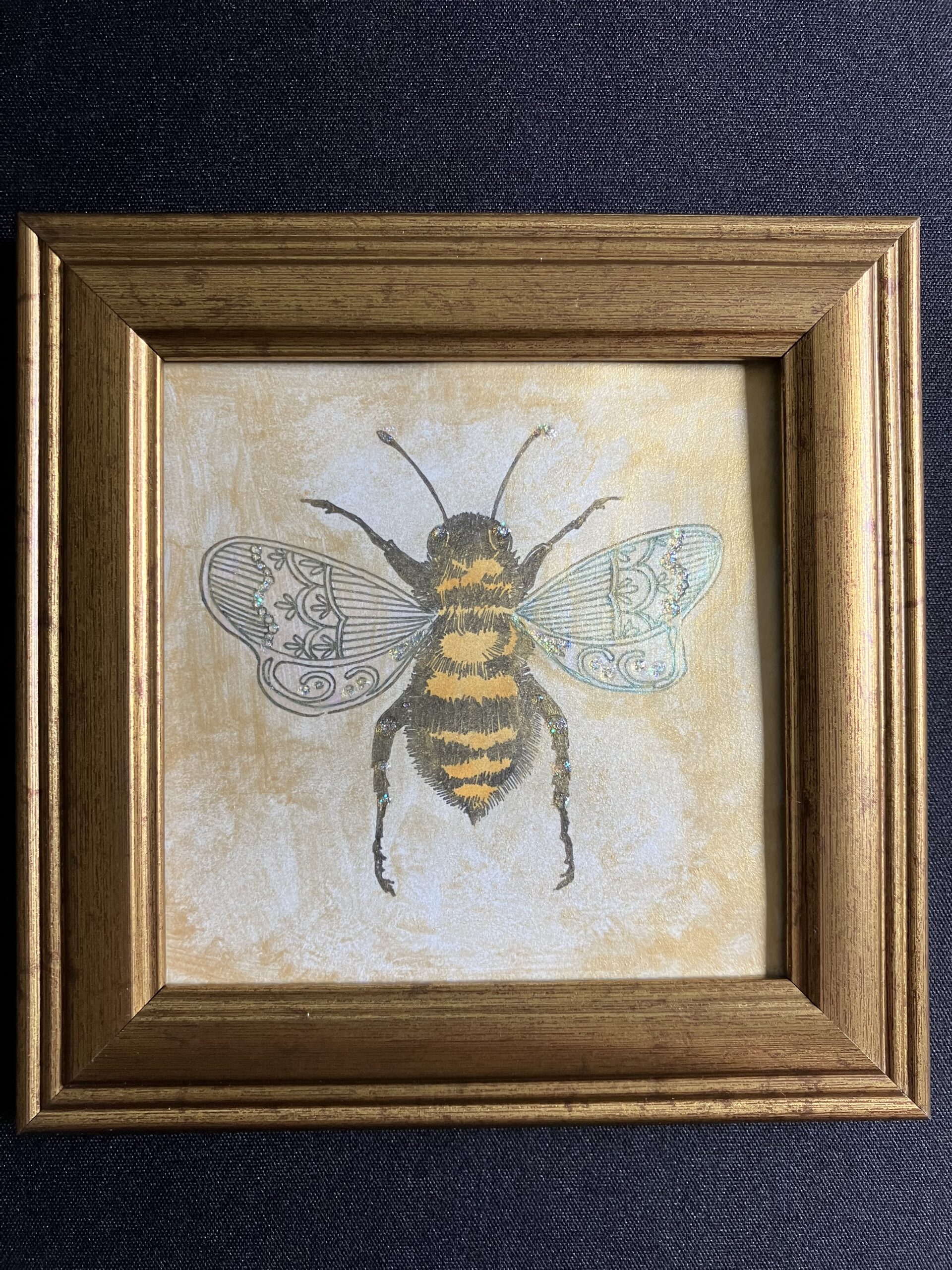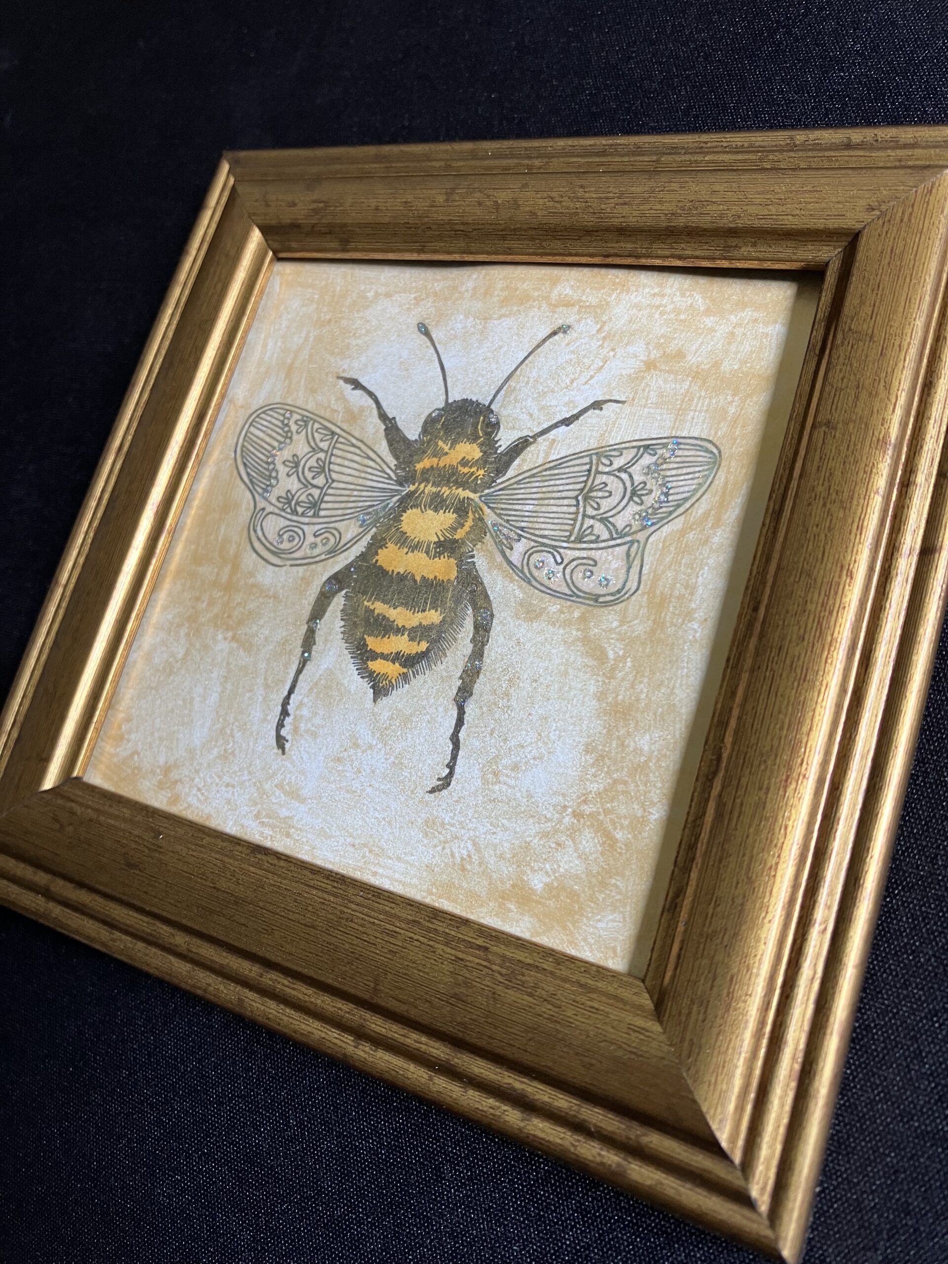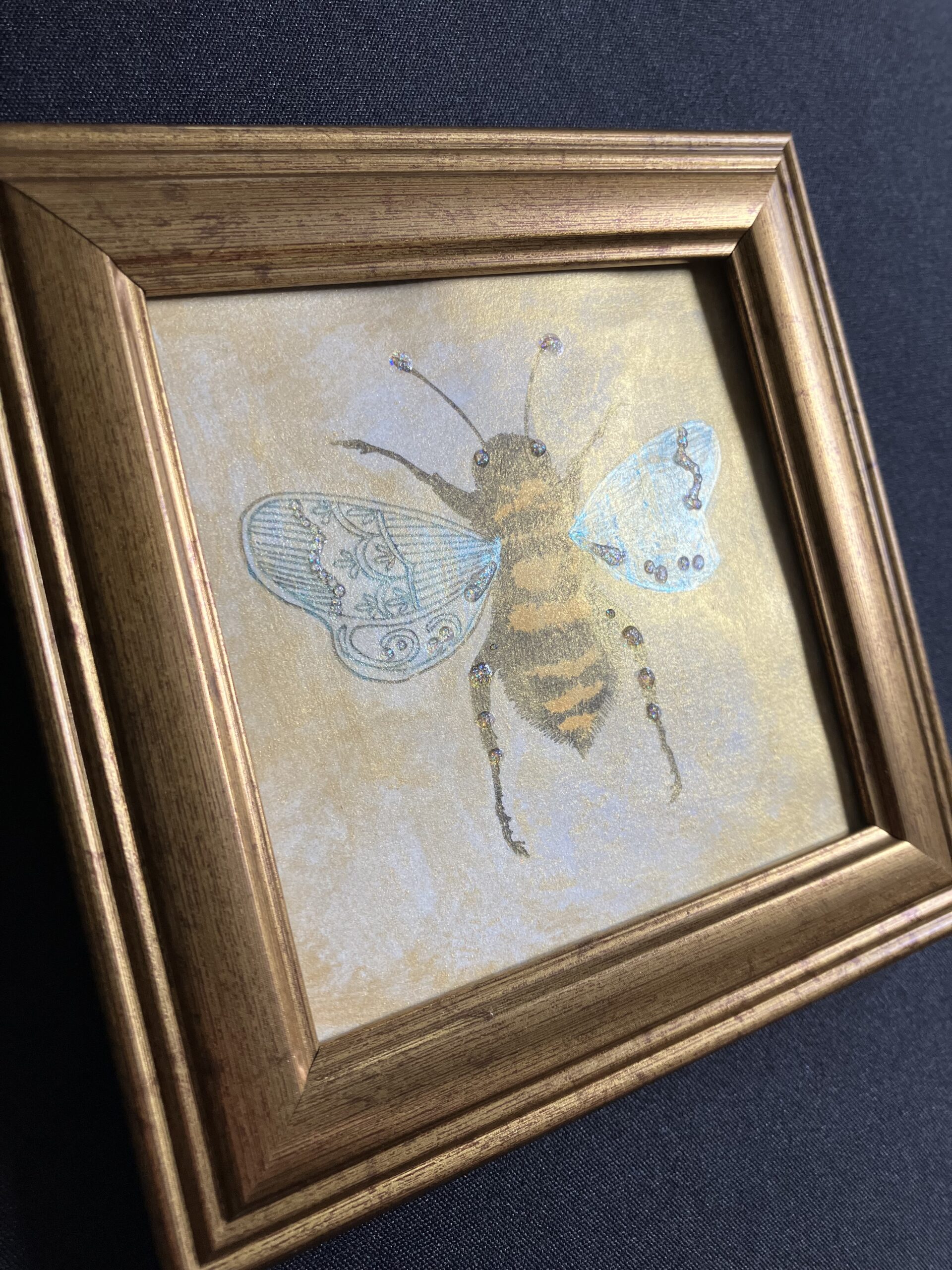ちょっとぷっくりしたら蜂さんをアクリルガッシュでキラキラさせました。太陽の光に当たるとキラキラと反射します。