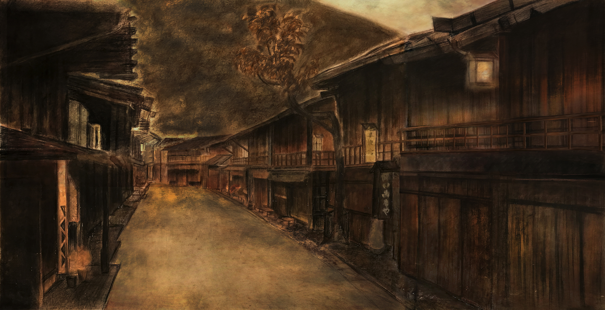 嬬恋宿は今も江戸時代の宿場町の姿を見せてくれます。海外に留学中、日本に帰国するとなぜかこうした日本の古い情景に惹かれるように旅をし、写真に残していました。その写真をもとにパステルで一気に描き上げた6枚のスケッチ(A1サイズ x 6)を心象風景として一枚の絵にまとめ、ジークレー印刷したものです。