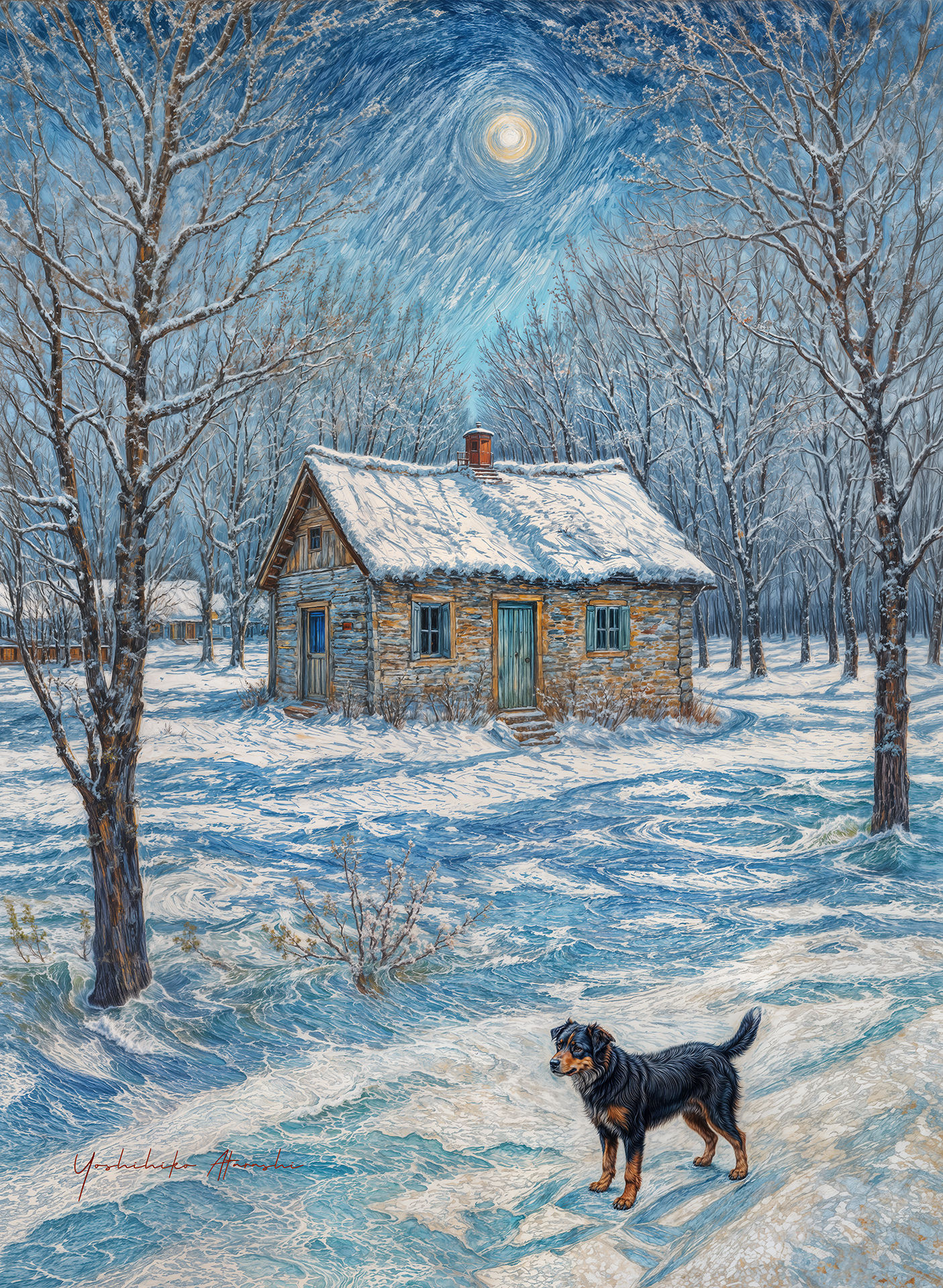 これらの絵では、雪に覆われた山の中の小屋と一匹の犬を通して、静寂と孤独、そしてわずかなぬくもりを描きました。画法は細密な筆致で冷たい空気感と雪の質感を表現し、薄青を基調にして冷たさと幻想性を強調しています。飼い主の不在を感じさせる犬の存在が、観る者に物語の余白を想像させることを意図しています。