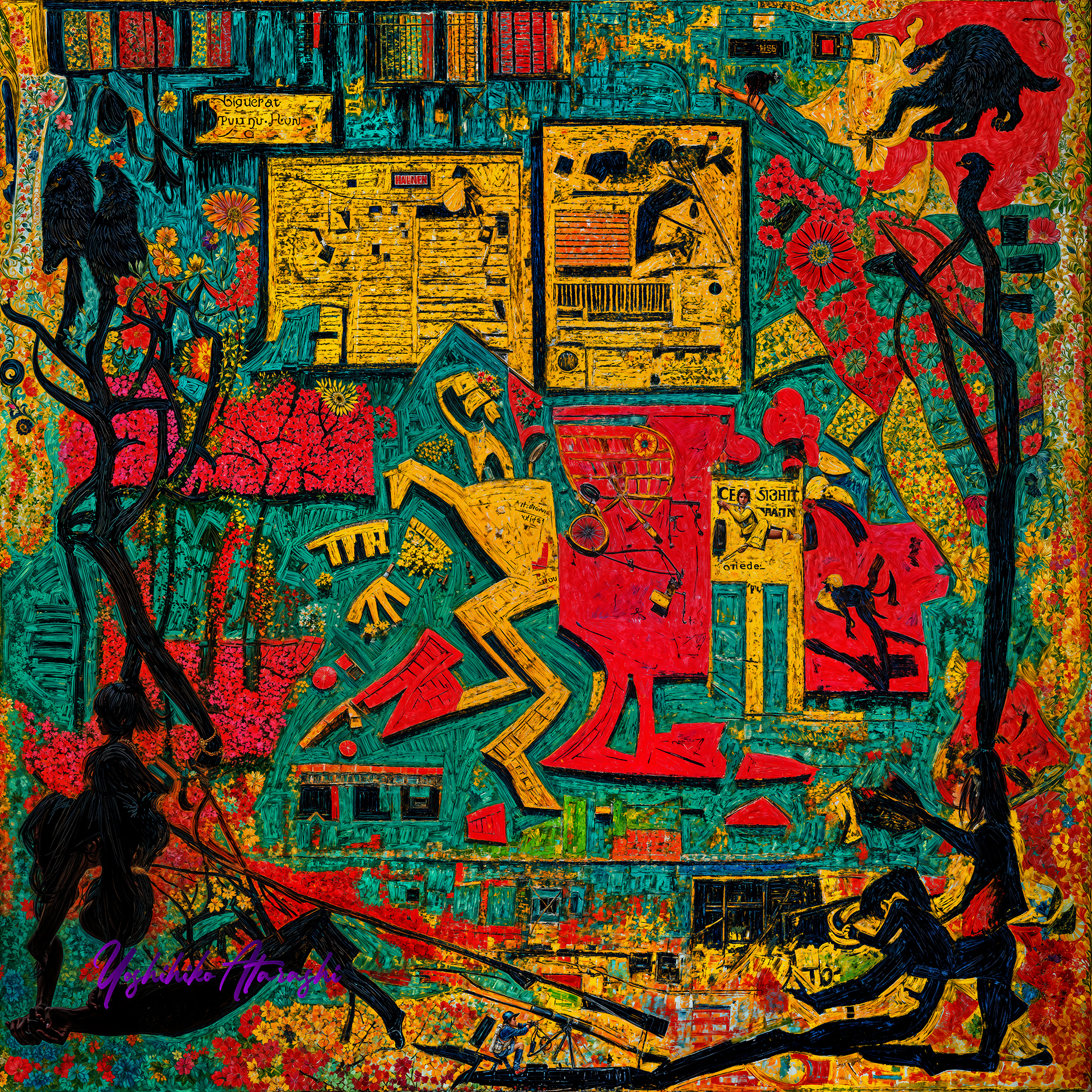 この「AnthropoCode」シリーズは、人類の記号的進化とデジタル時代の混沌をテーマに制作しました。プリミティブな線描と現代的な記号、カラフルなレイヤーを組み合わせ、古代壁画のような語りと、AI的構造の融合を目指しました。色彩とリズムは情報の奔流、そして人間性の痕跡を表現しています。分析と直感、理性と踊りが共存する「人類のコード化された記憶」として描いています。