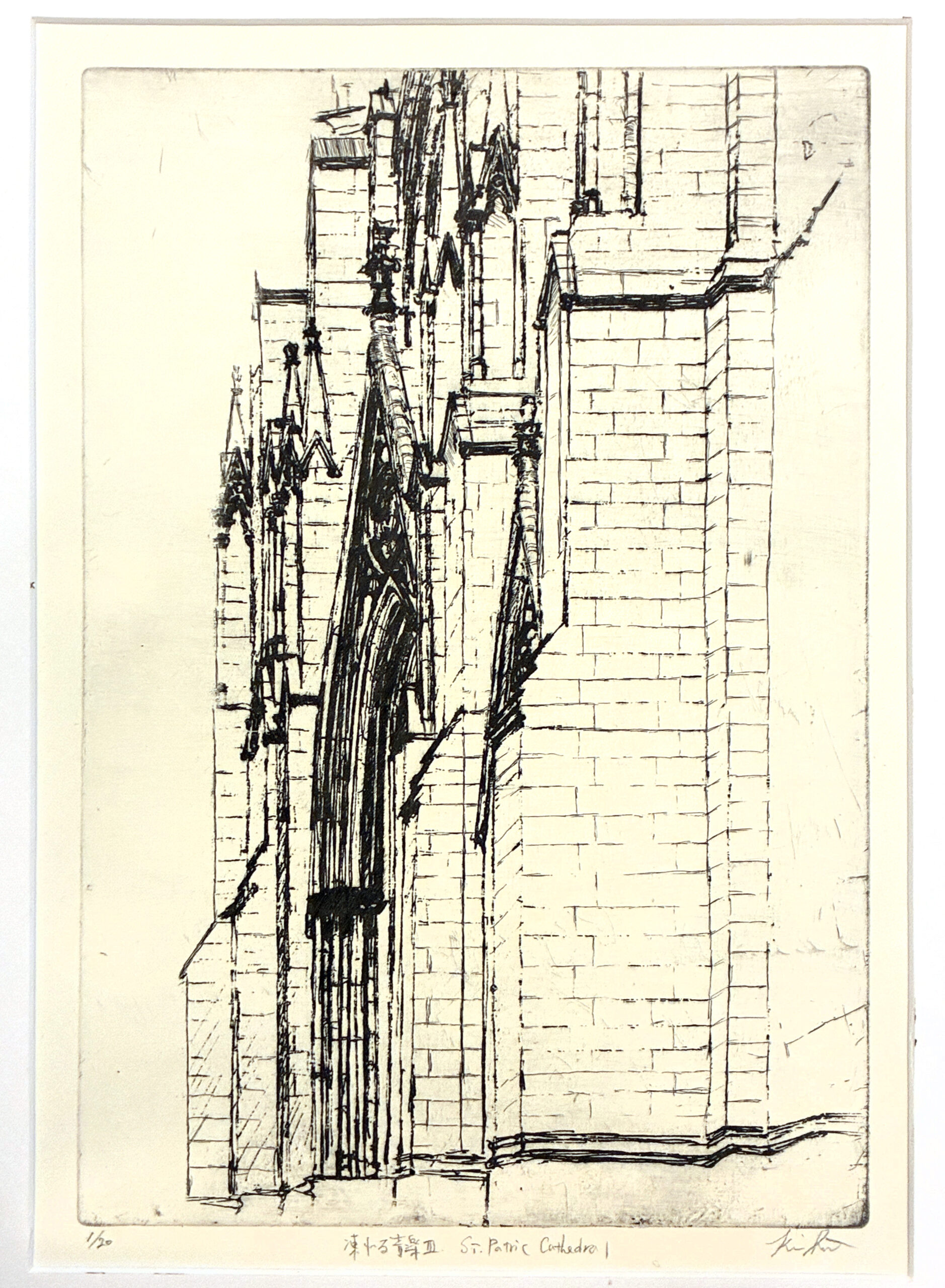 世界でも最も美しい教会建築と言われるニューヨーク・聖パトリック教会のファサードを描いたペン画を元に銅版画を制作しました。「凍れる音楽 II. St. Patric Church」とセットになる銅版画で、細かく精緻なファサードの様子を描いています。