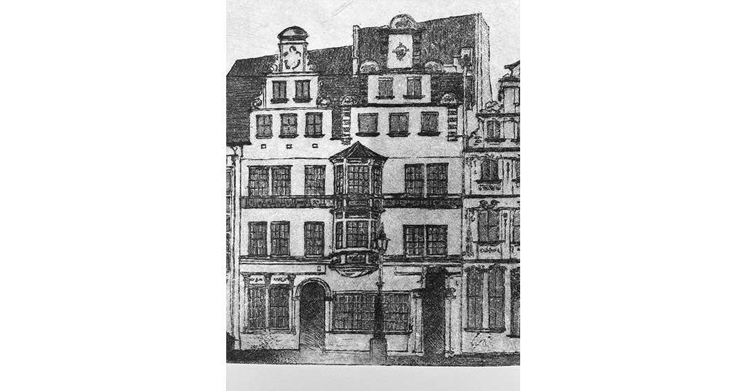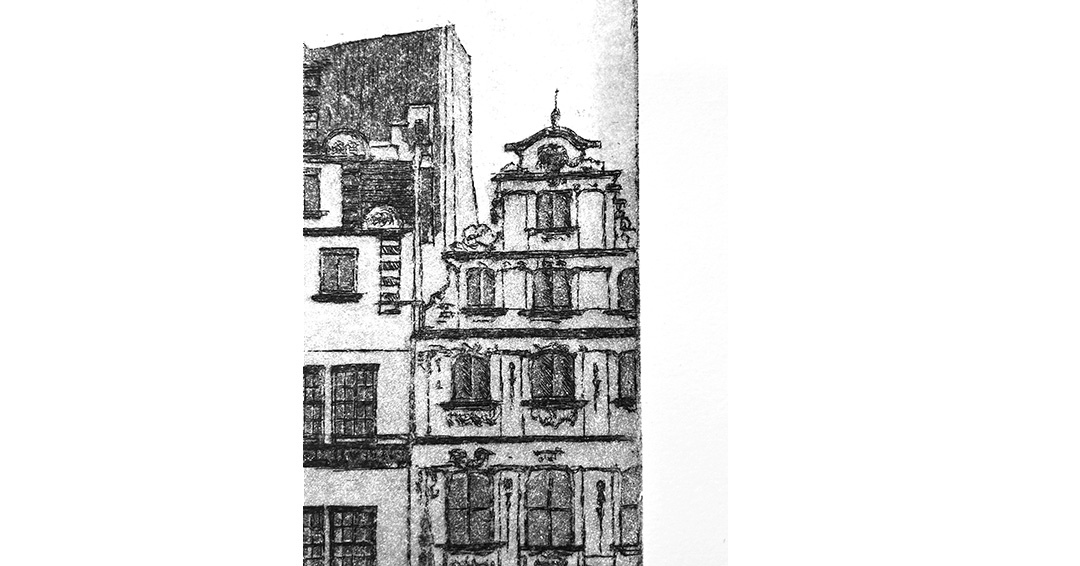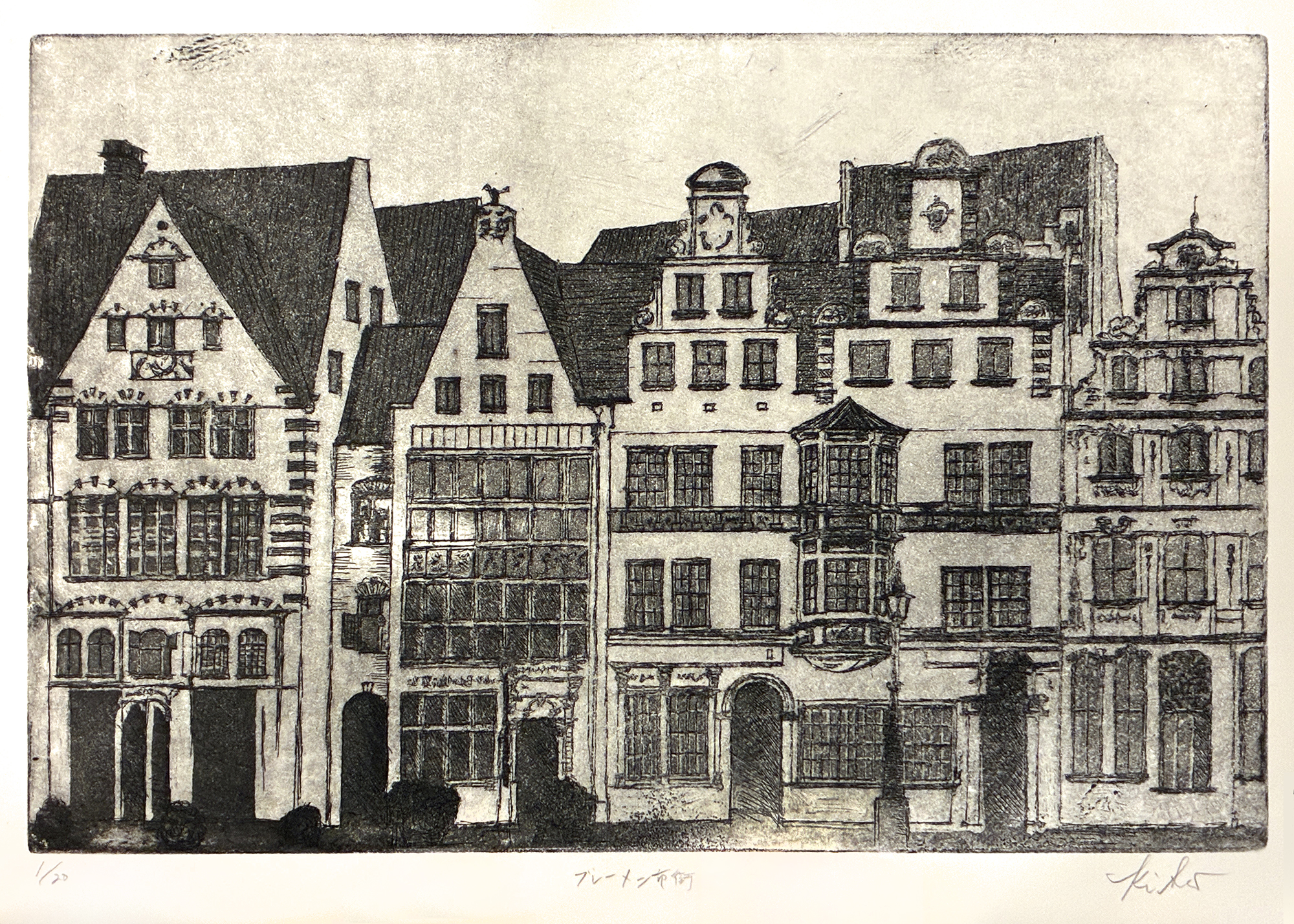 「ブレーメンの音楽隊」で知られるドイツ・ブレーメン市街を訪れた父の写真をペン画にしたものを、銅版画として制作しました。どこかファンタジーの世界を思わせるような建物ファサードの並びを描いたものです。