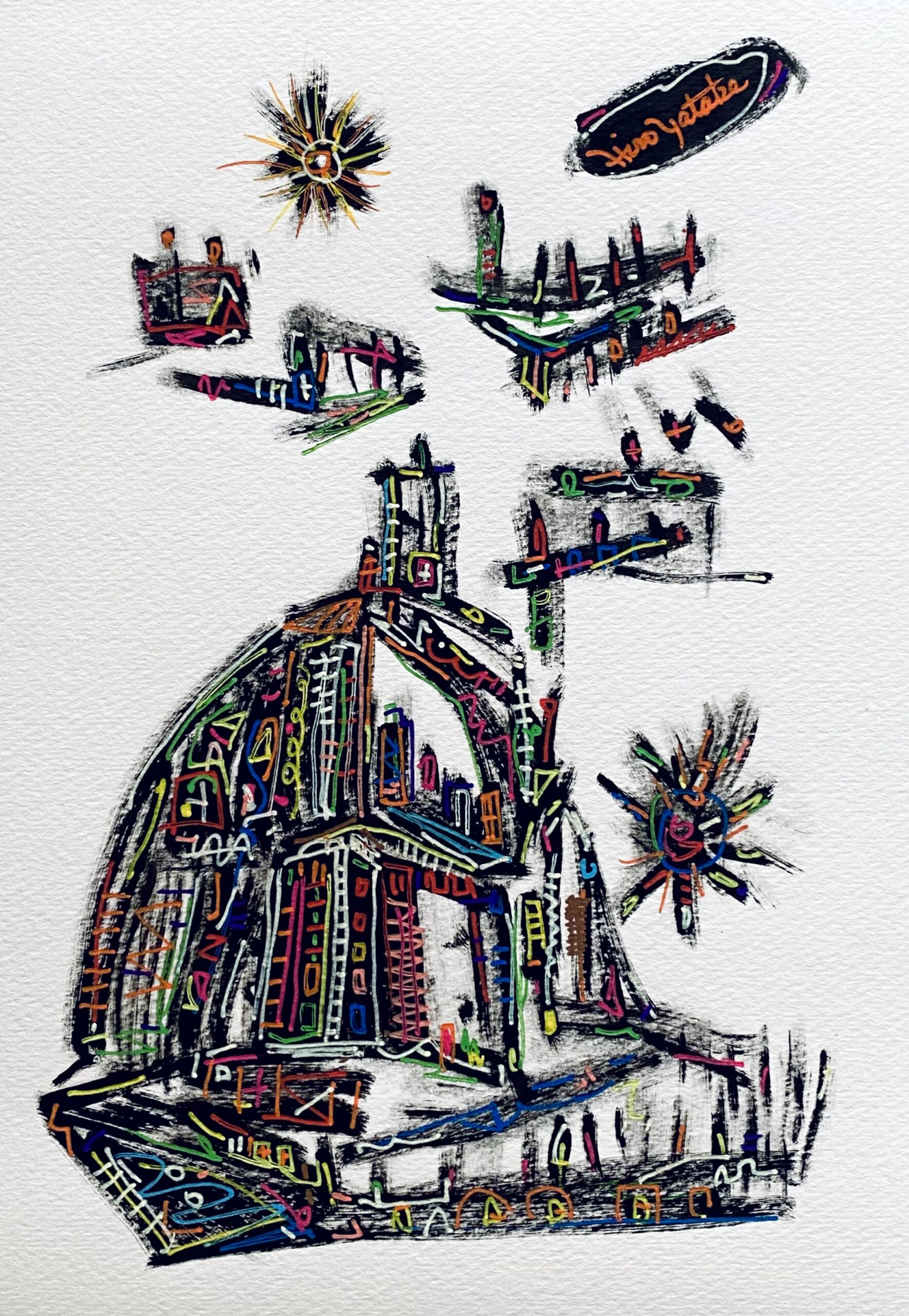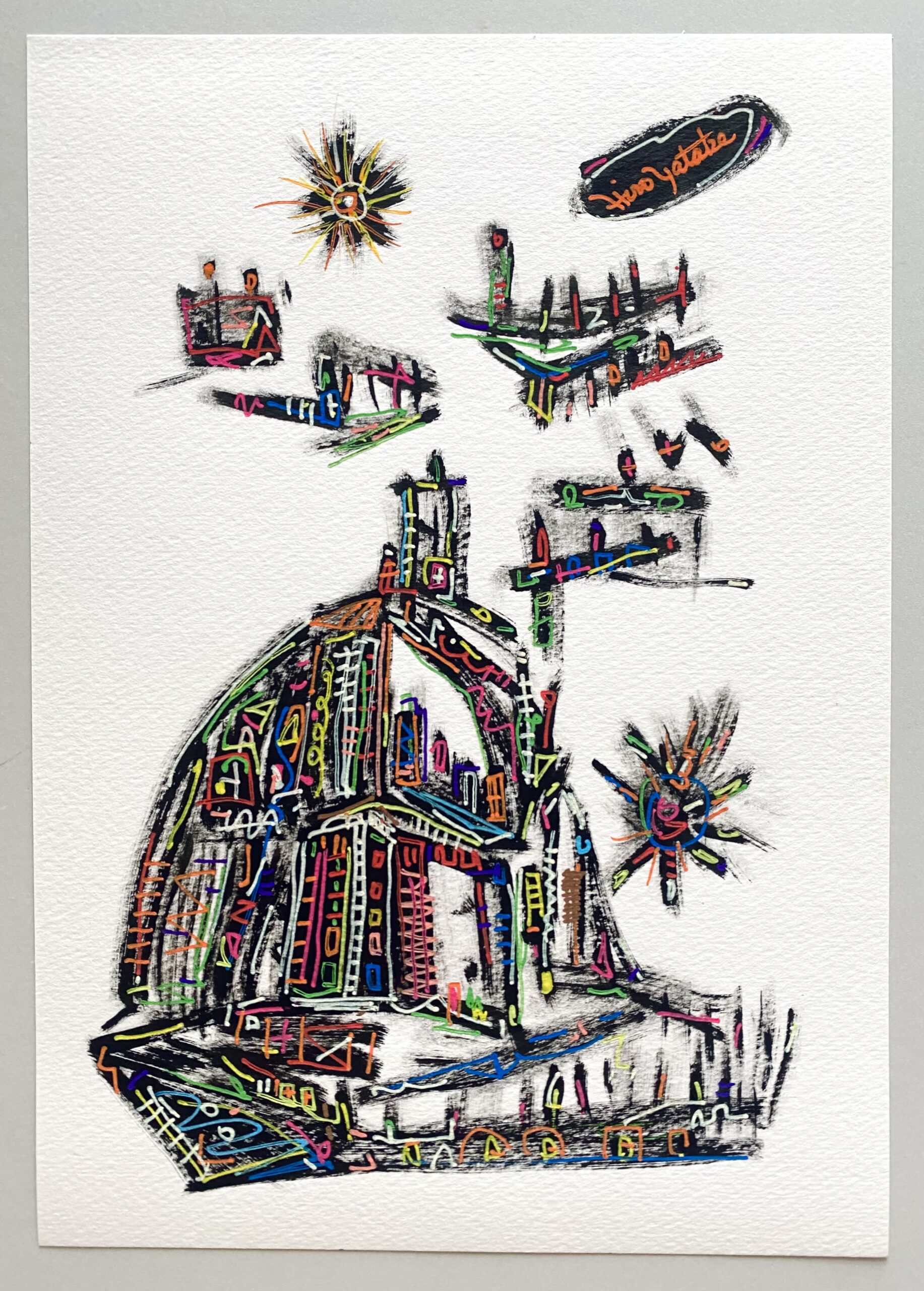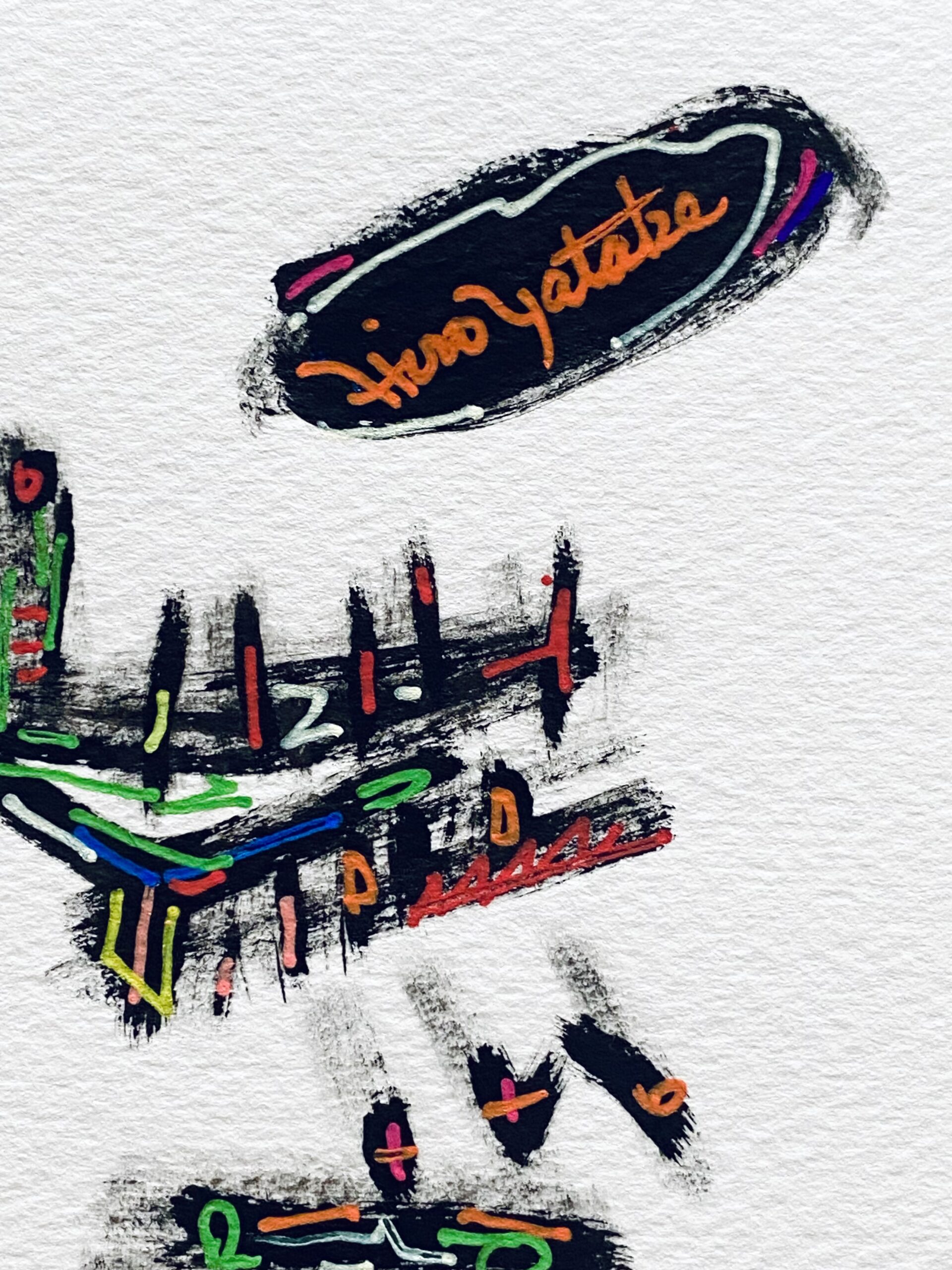 2008年 浮かんだイメージを付箋にボールペンでスケッチ。2012年になりそれをまとめたものを知人に見せたところサイズや画材をかえて絵画として発表することを勧められ、2013年、公募展にA4サイズのカードボードにペン・パステルで描いた作品を出品。その後アクリル絵具での創作をスタート。
