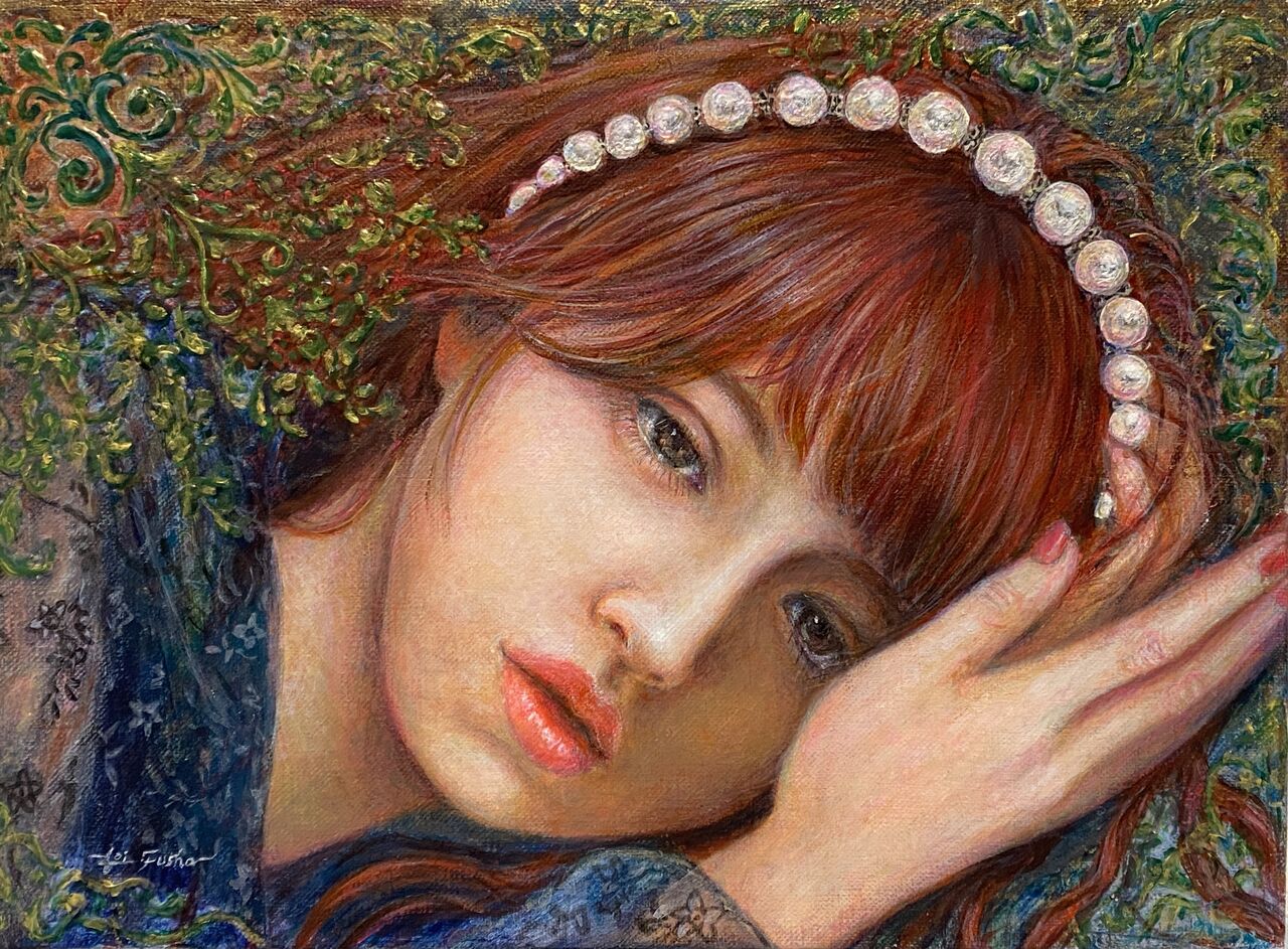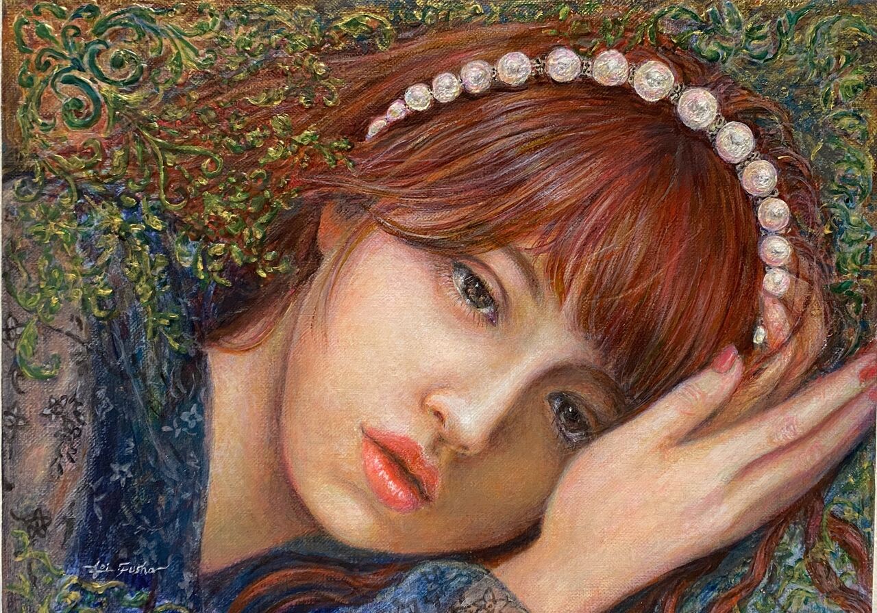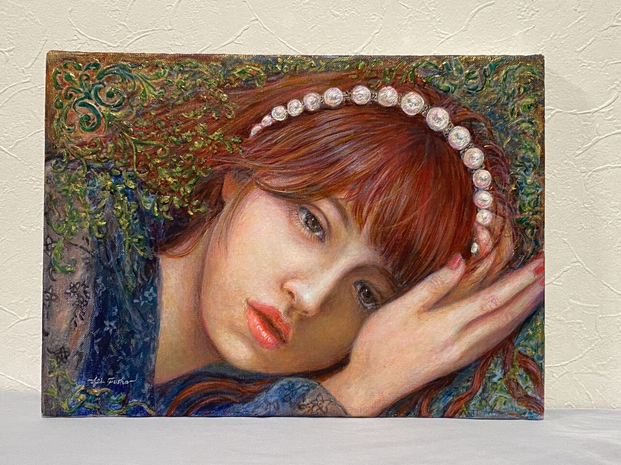 木枠キャンバスにアクリル絵の具で描かれた、パールのカチューシャの女の子。