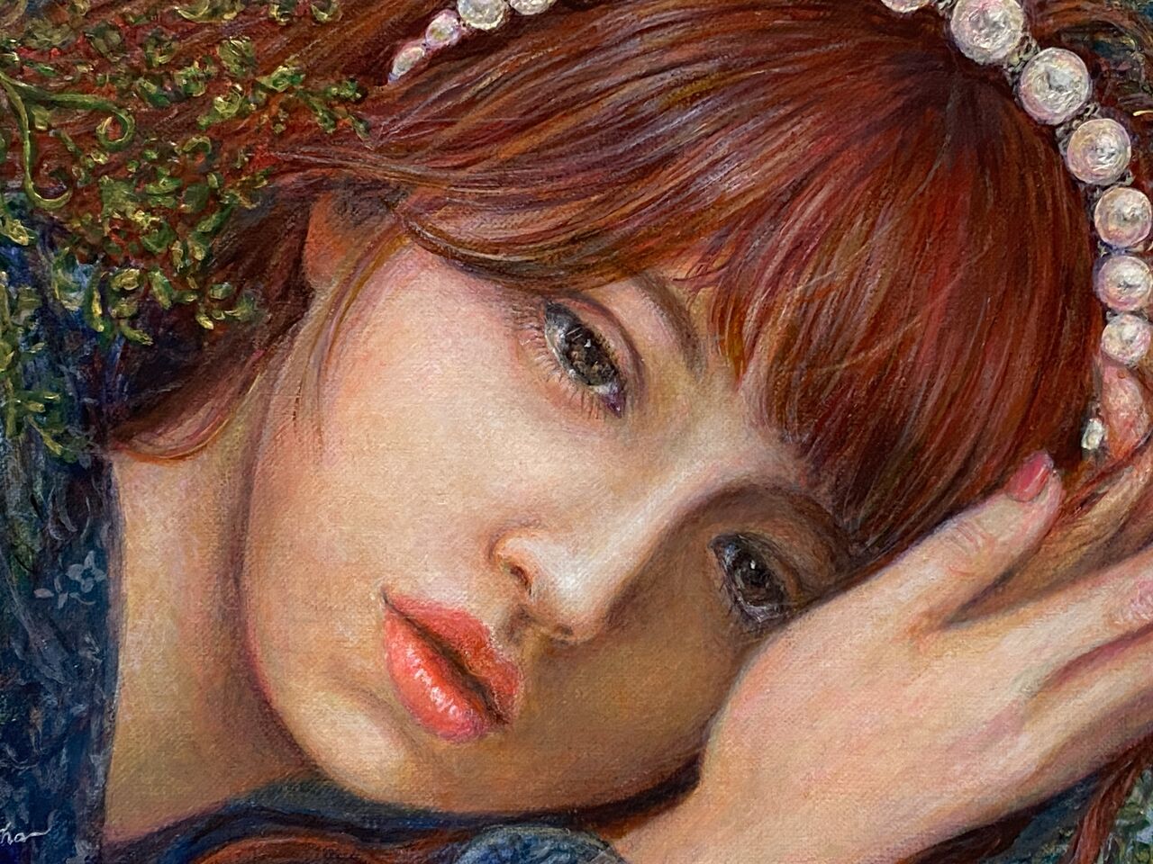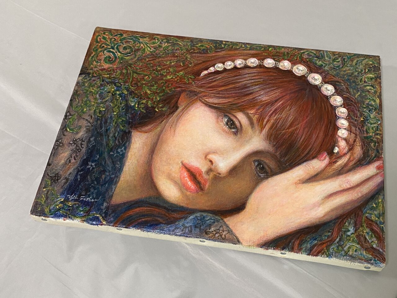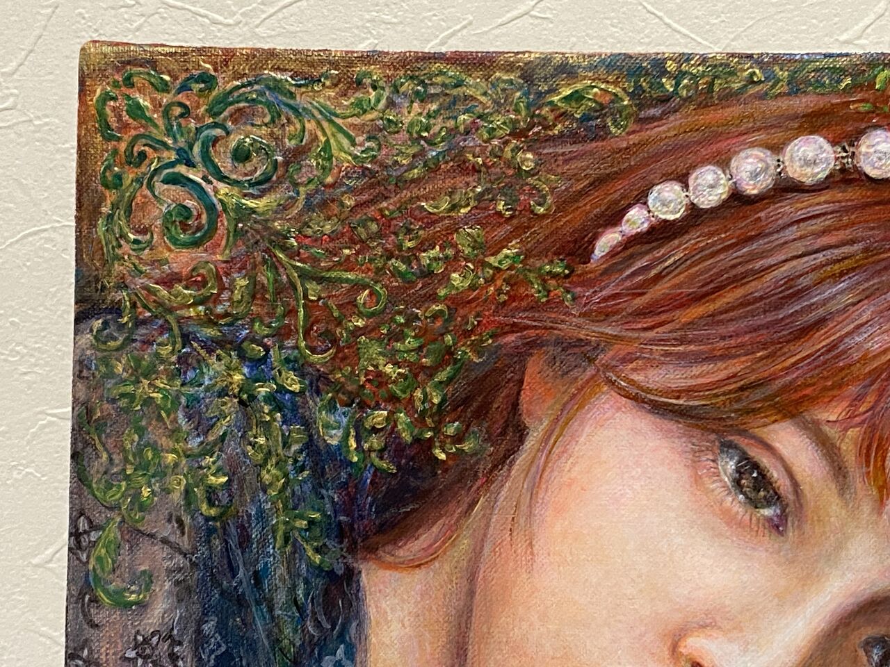 木枠キャンバスにアクリル絵の具で描かれた、パールのカチューシャの女の子。