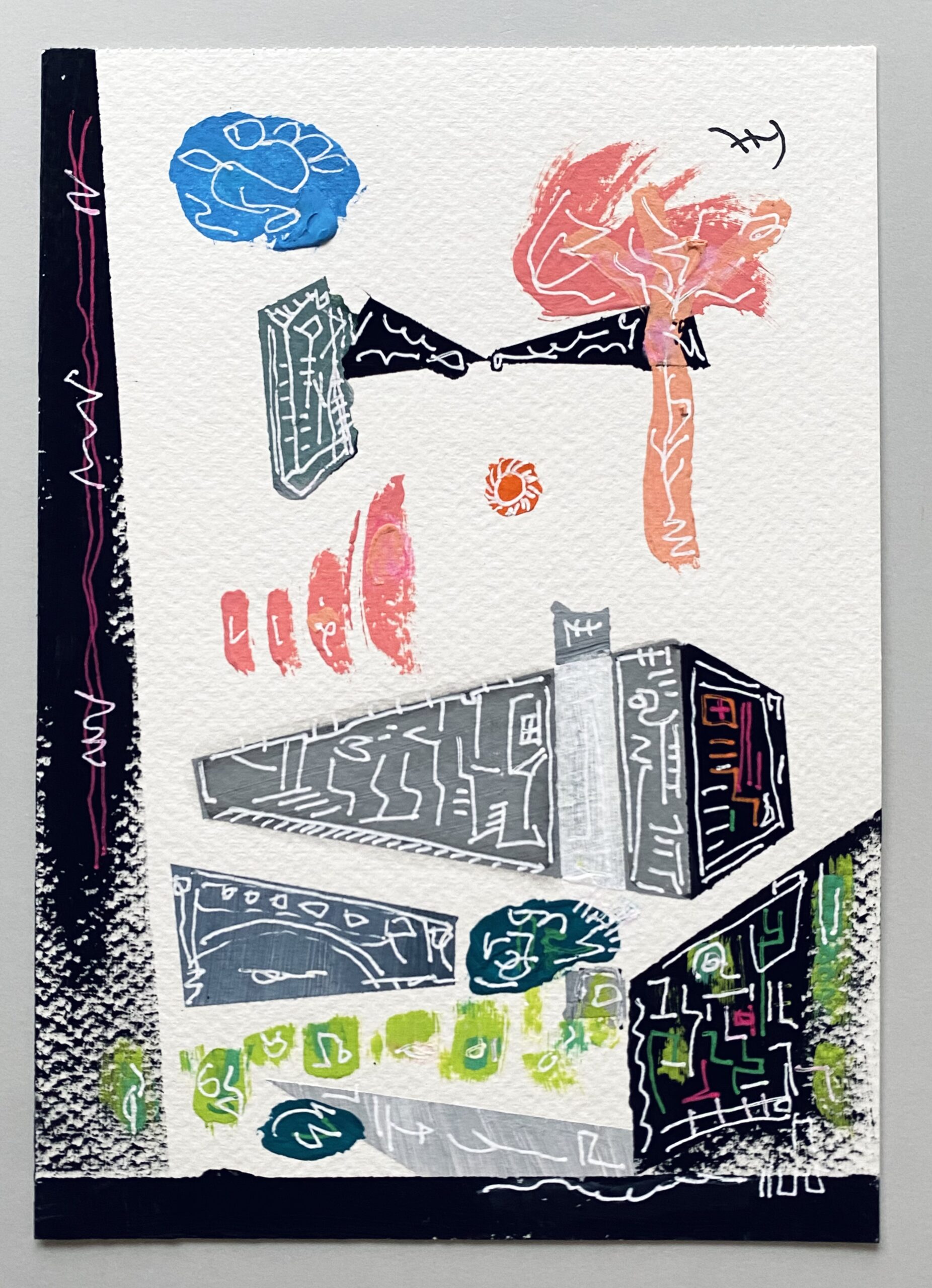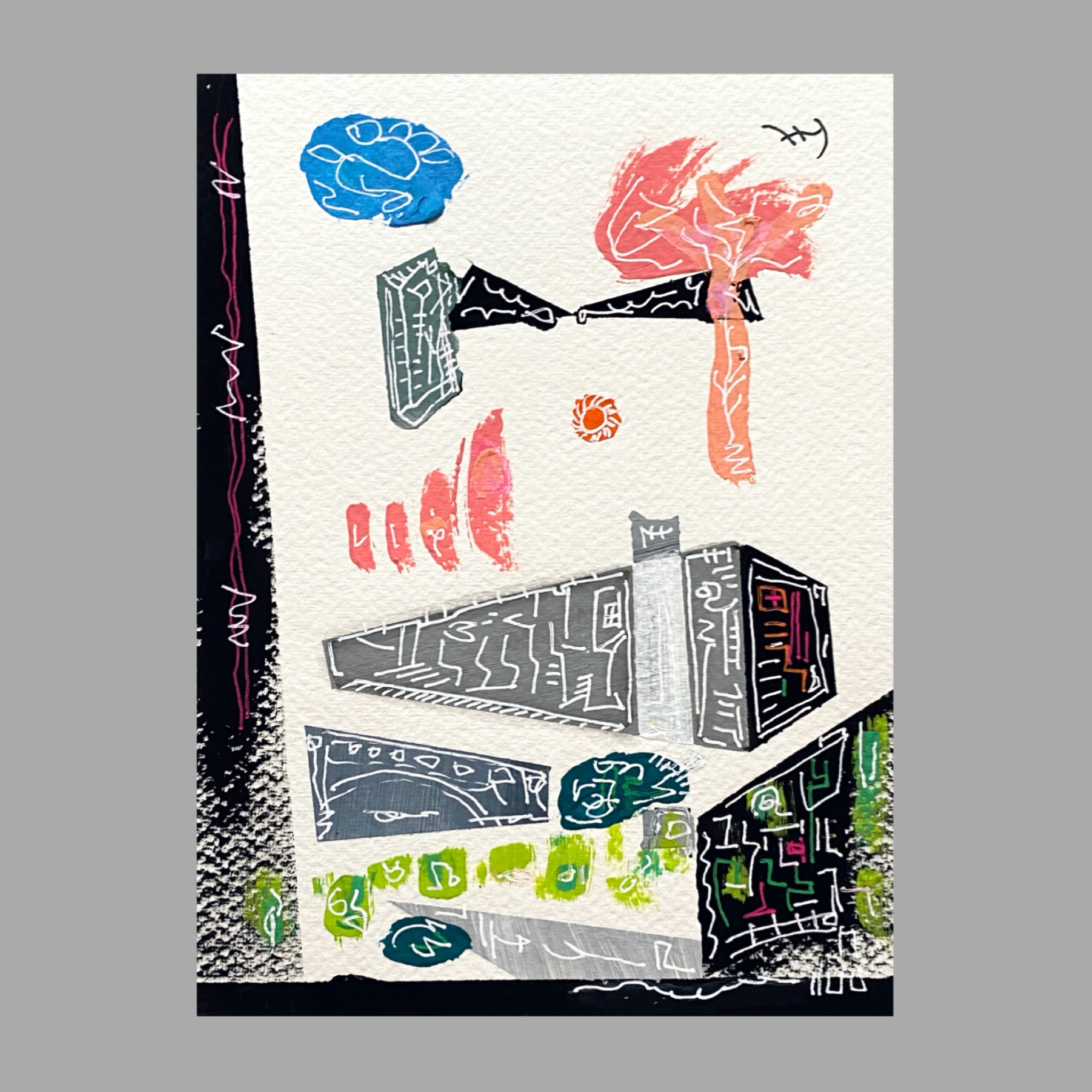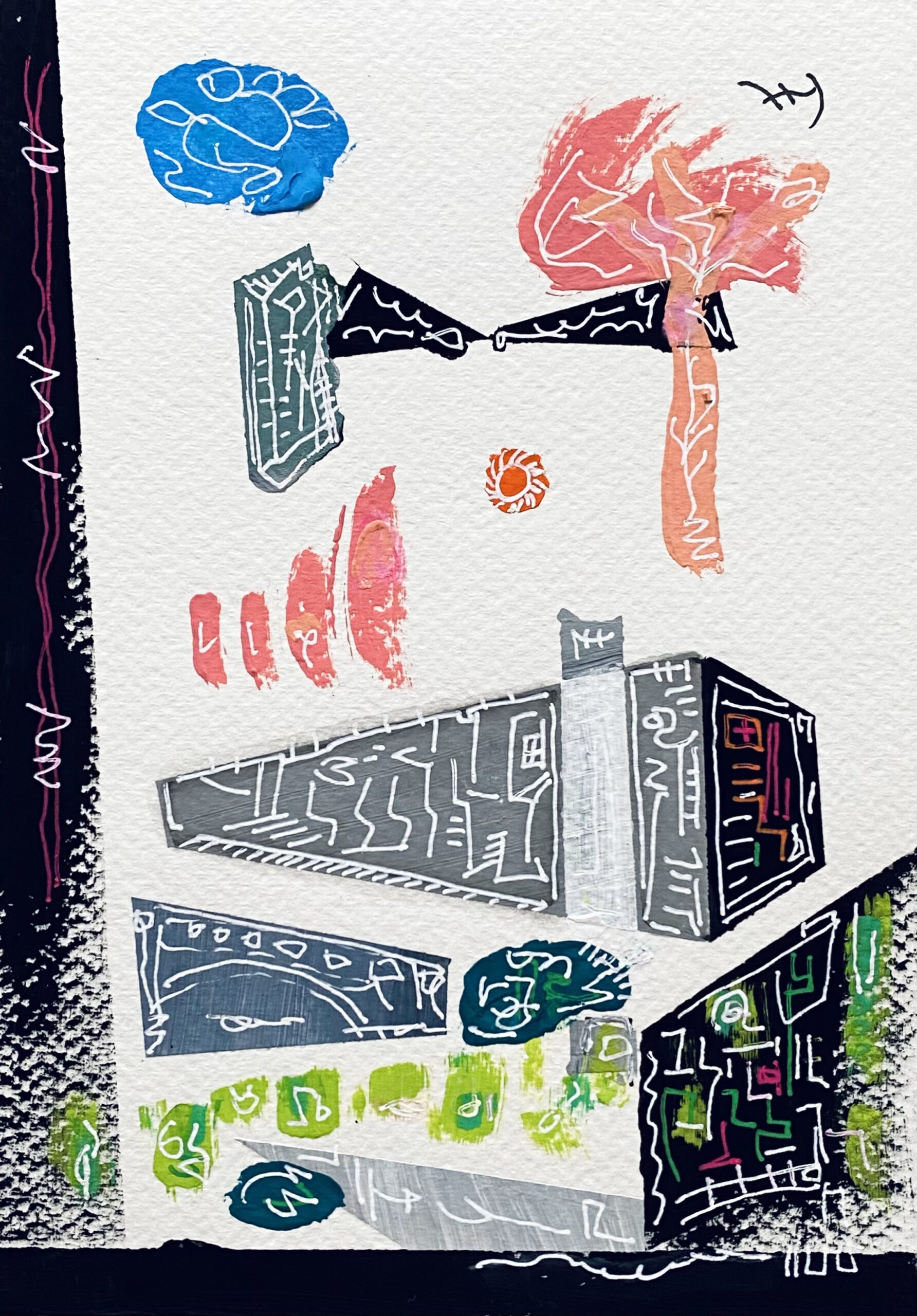 2008年 浮かんだイメージを付箋にボールペンでスケッチ。2012年になりそれをまとめたものを知人に見せたところサイズや画材をかえて絵画として発表することを勧められ、2013年、公募展にA4サイズのカードボードにペン・パステルで描いた作品を出品。その後アクリル絵具での創作をスタート。