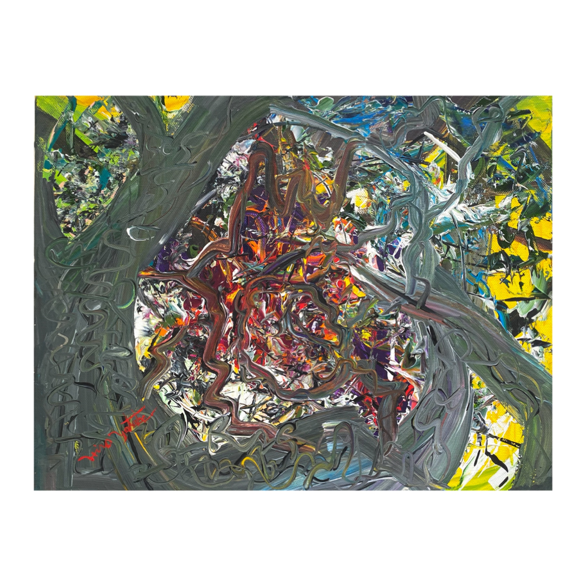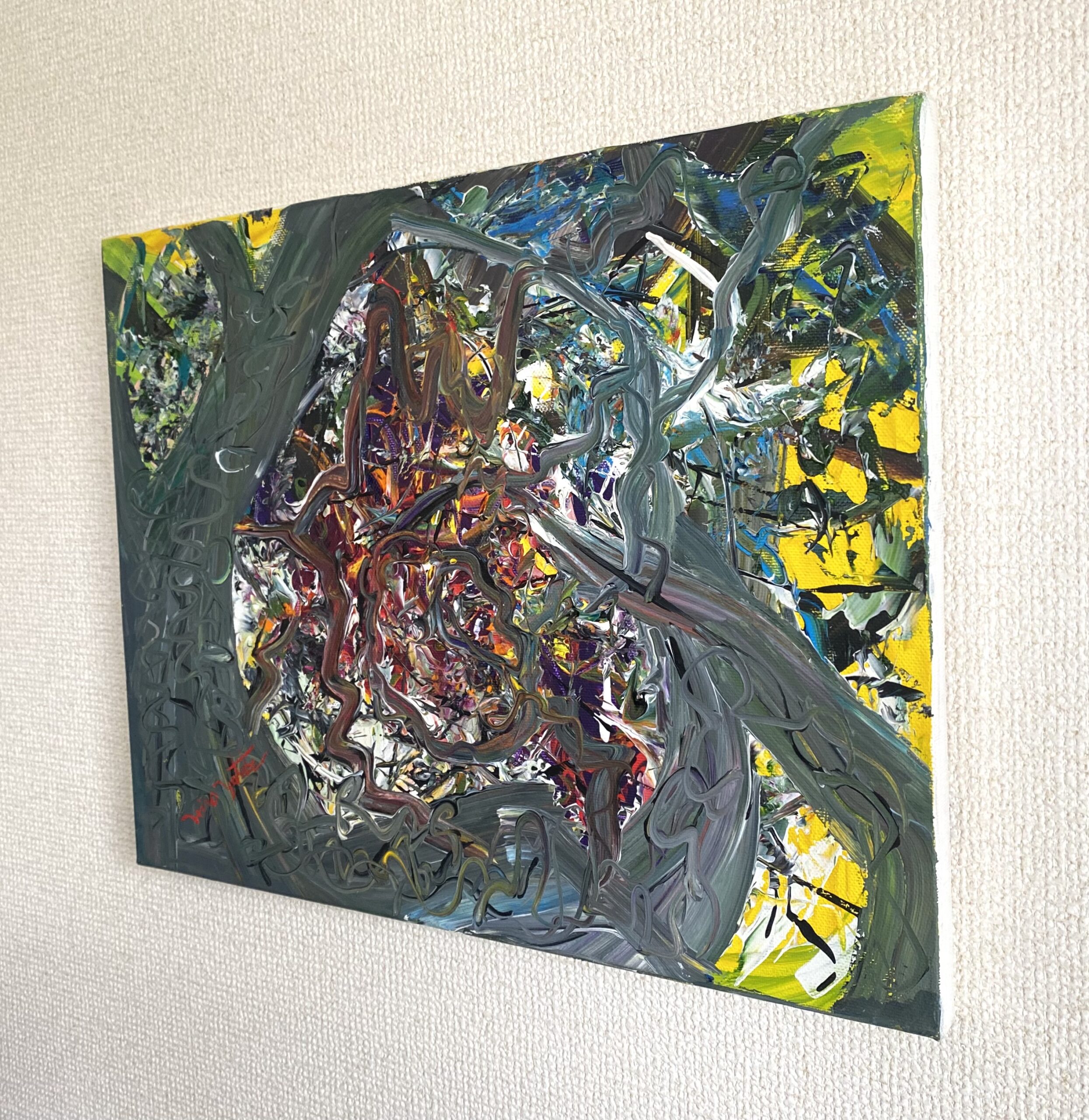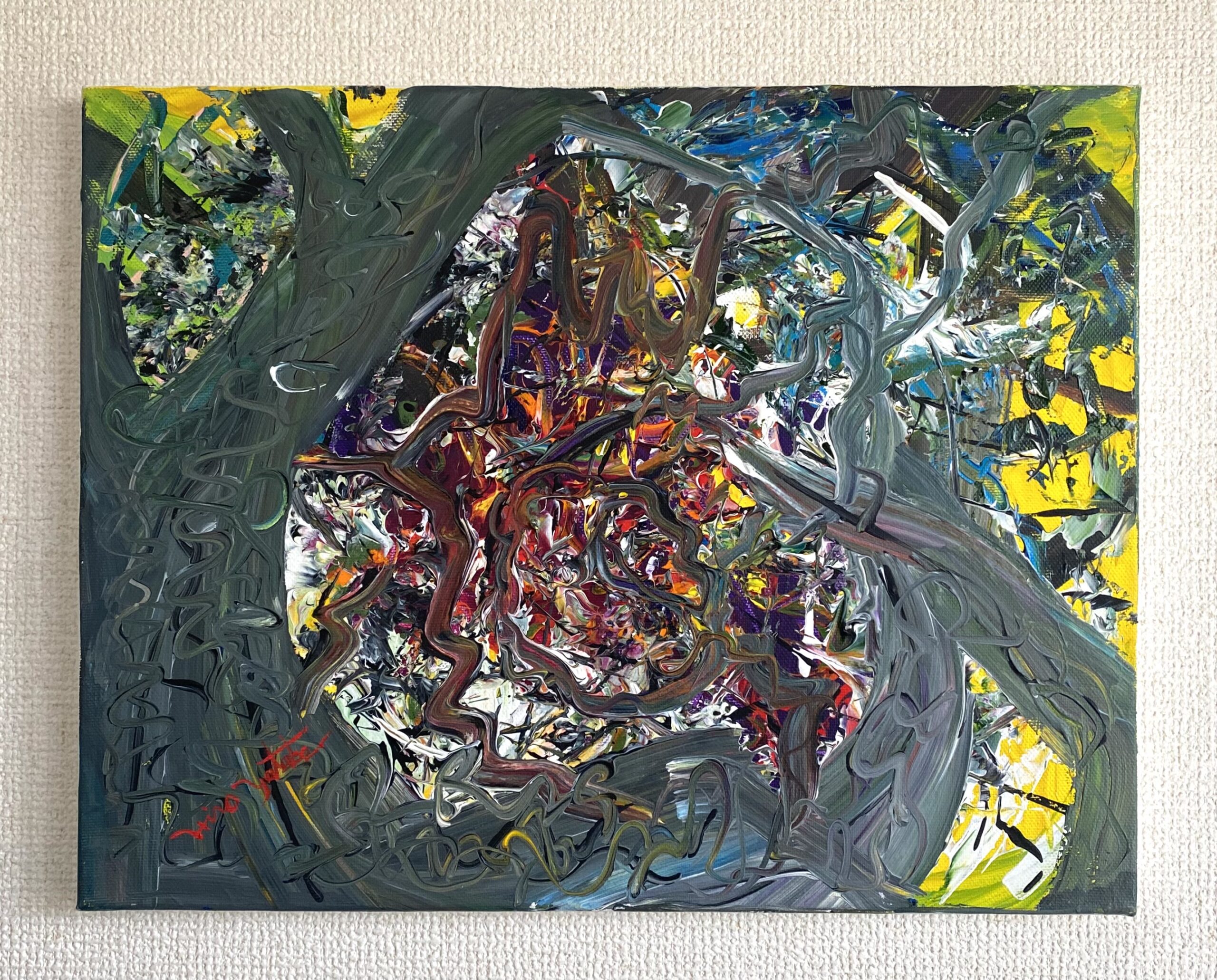 シリーズ作品を除き、タイトルは創作のはじめにあったものではなく、描き終えた時点で観る側となった私が名付けた「仮のタイトル」です。参考にするのも、答え合わせのように楽しむのも、あるいはまったく無視するのも自由です。抽象表現の色や形に意味を見出す手がかりは、あなたの記憶や経験のなかにしかありません。最終的な作品は観るかたの中で完成すべきものだと考えています。思い思いに想像の翼を羽ばたかせ、作品に新しい解釈を加えていただくことを望みます。
