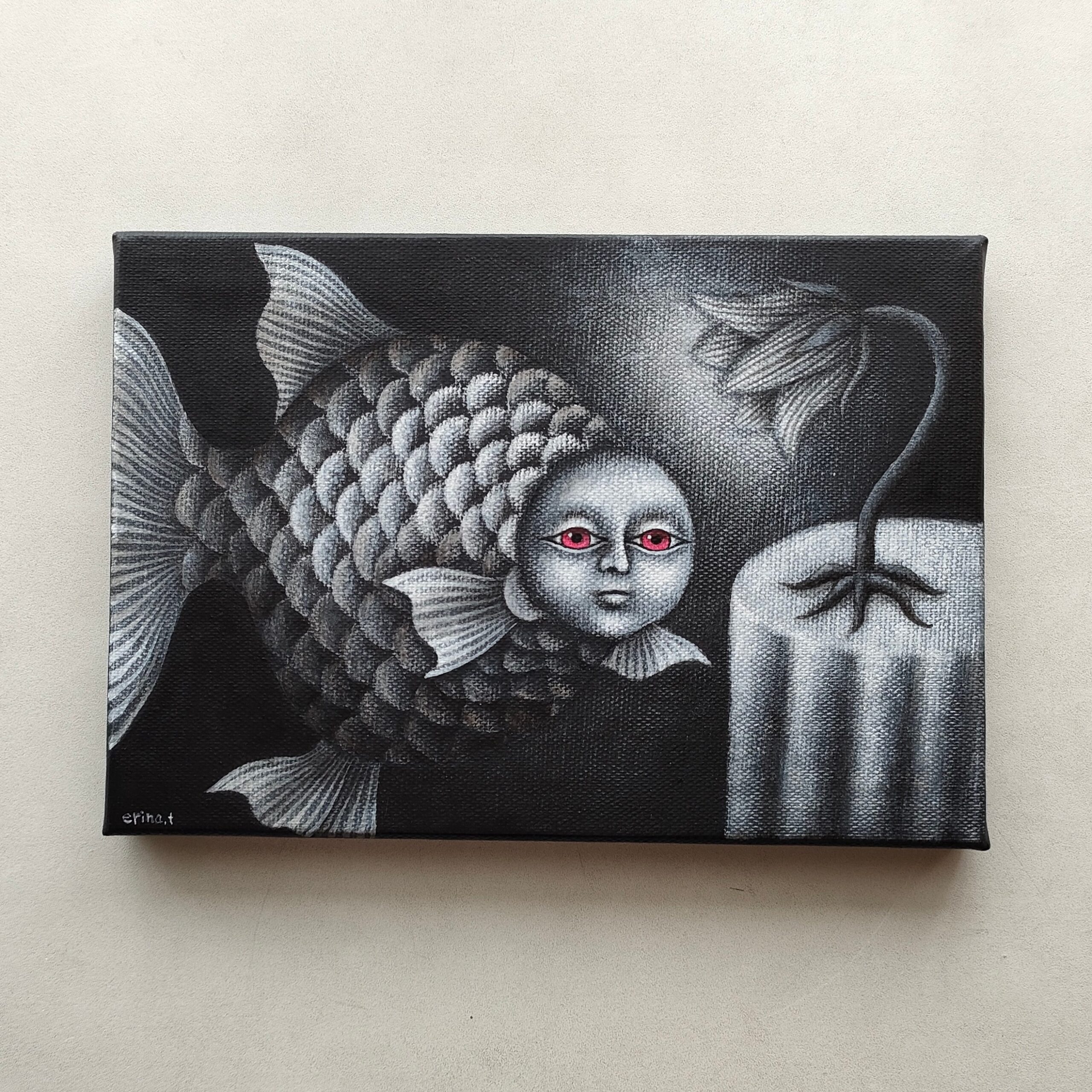 ランプに照らされた魚がゆったり泳ぐ様子を描きました。