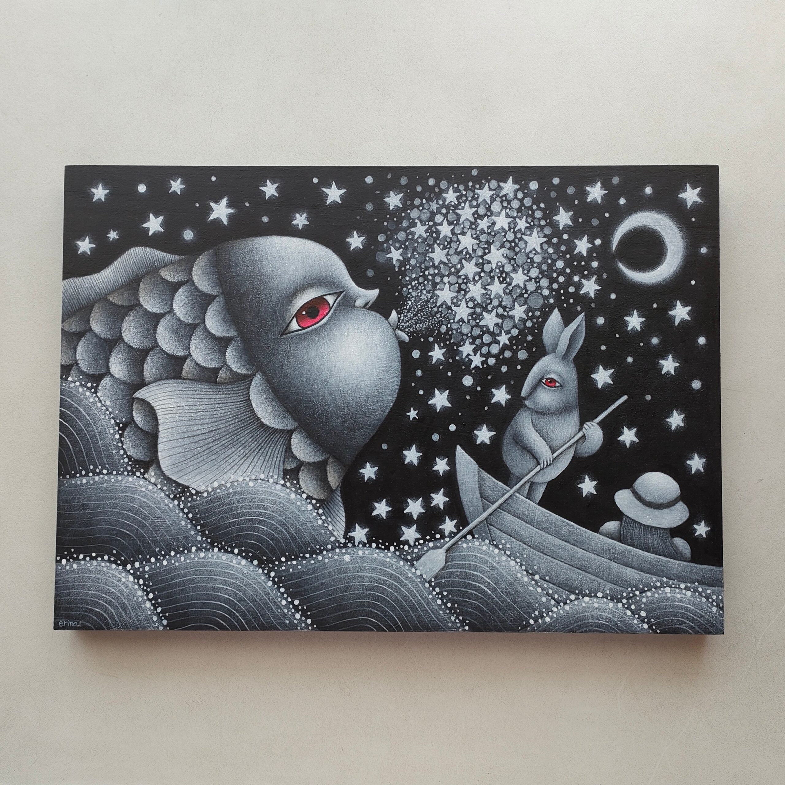 無数の星が輝く夜、舟旅の途中で不思議な魚と驚きの出会いをするという場面を描きました。