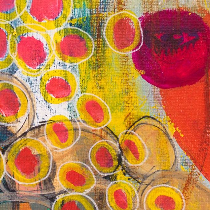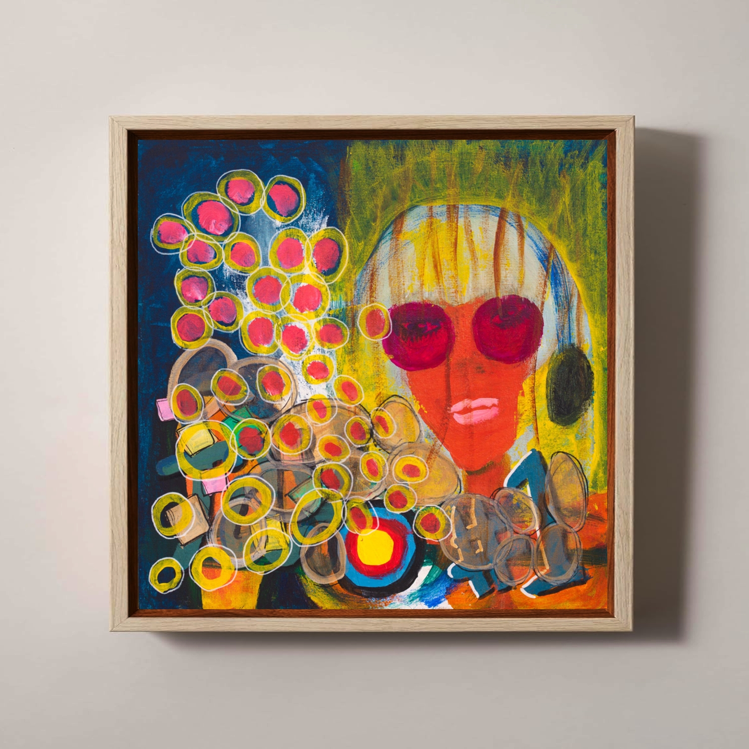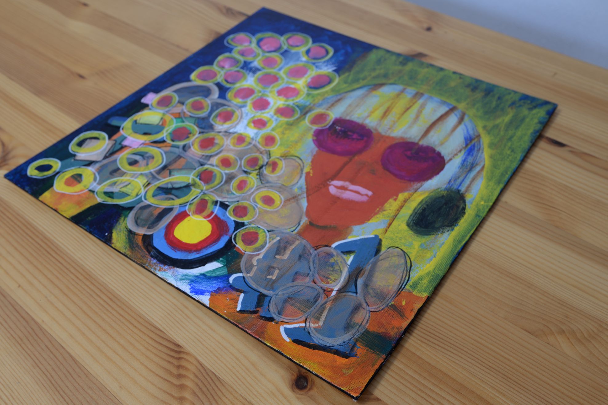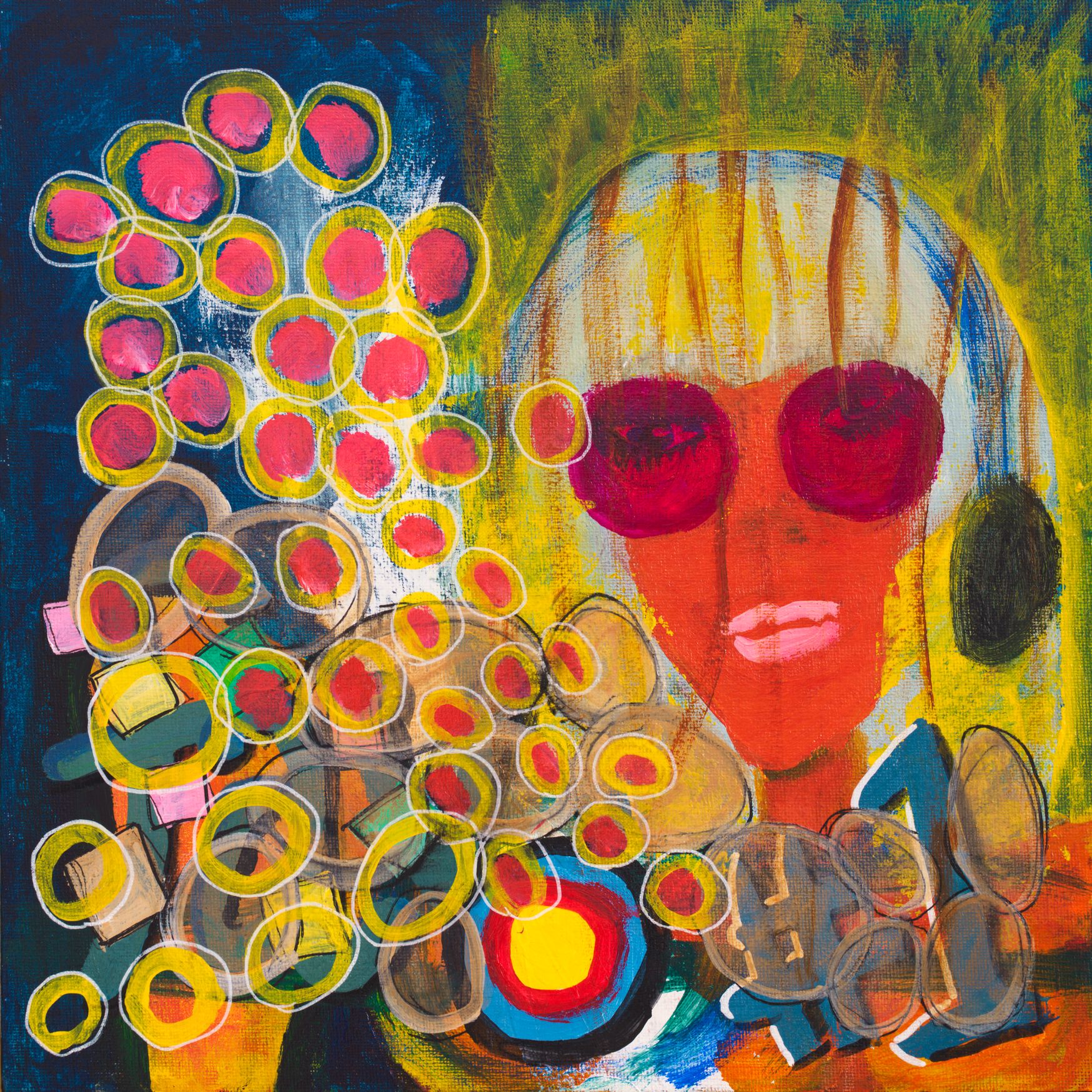 顔を中心に抽象的なモチーフを重ねた作品です。